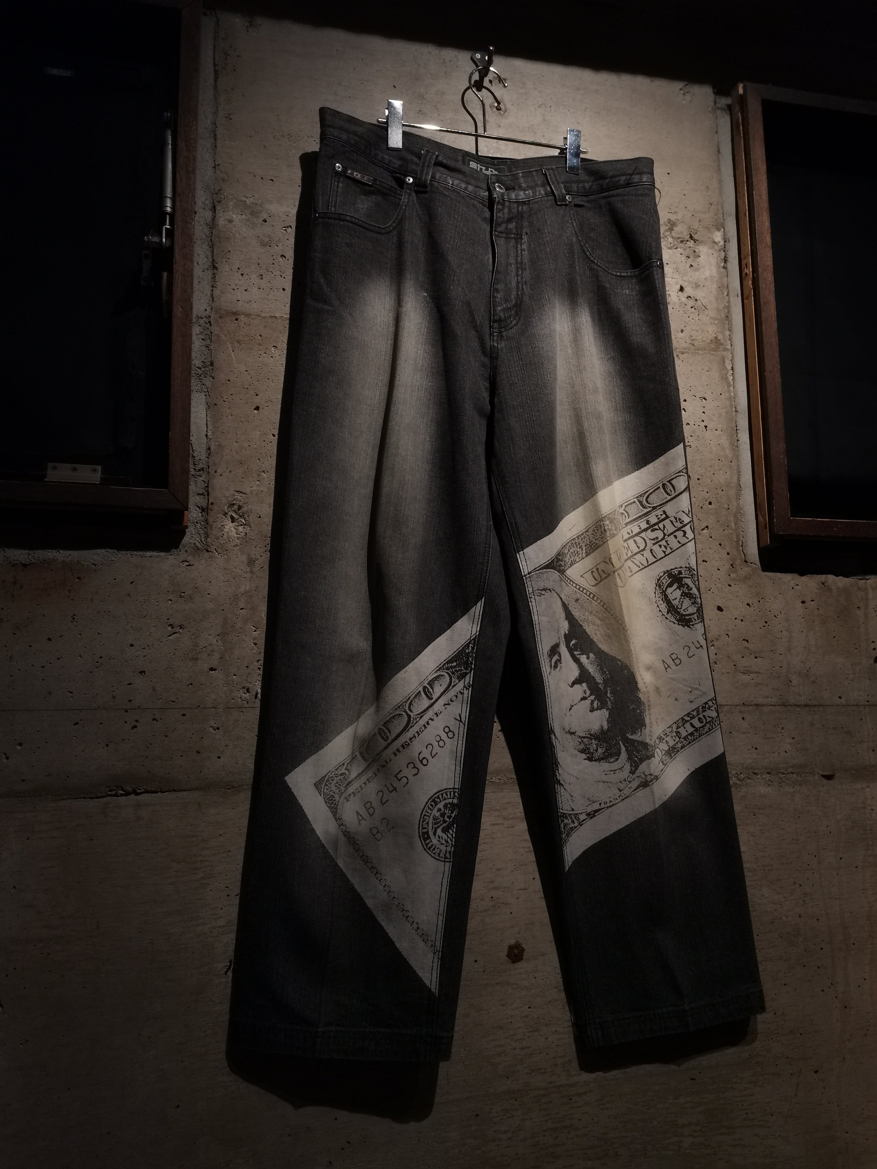 デニムの風合い、大胆に施されたドル札のデザインも相まって当時のストリートシーンのムードをヒシヒシと感じさせる1本。これからのシーズンでコーディネートの主役を張ってくれるであろう、バギーデニムの稀有かつスペシャルな逸品です。