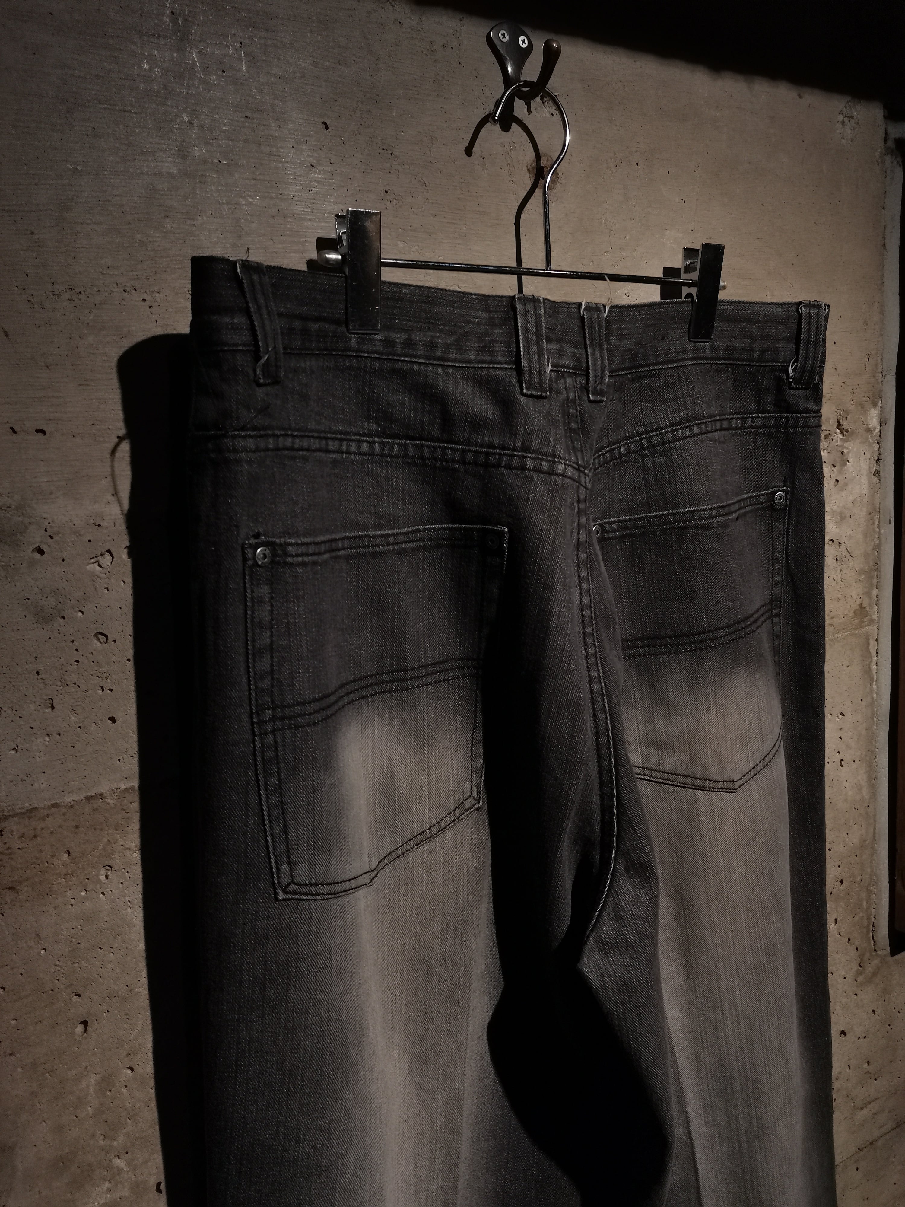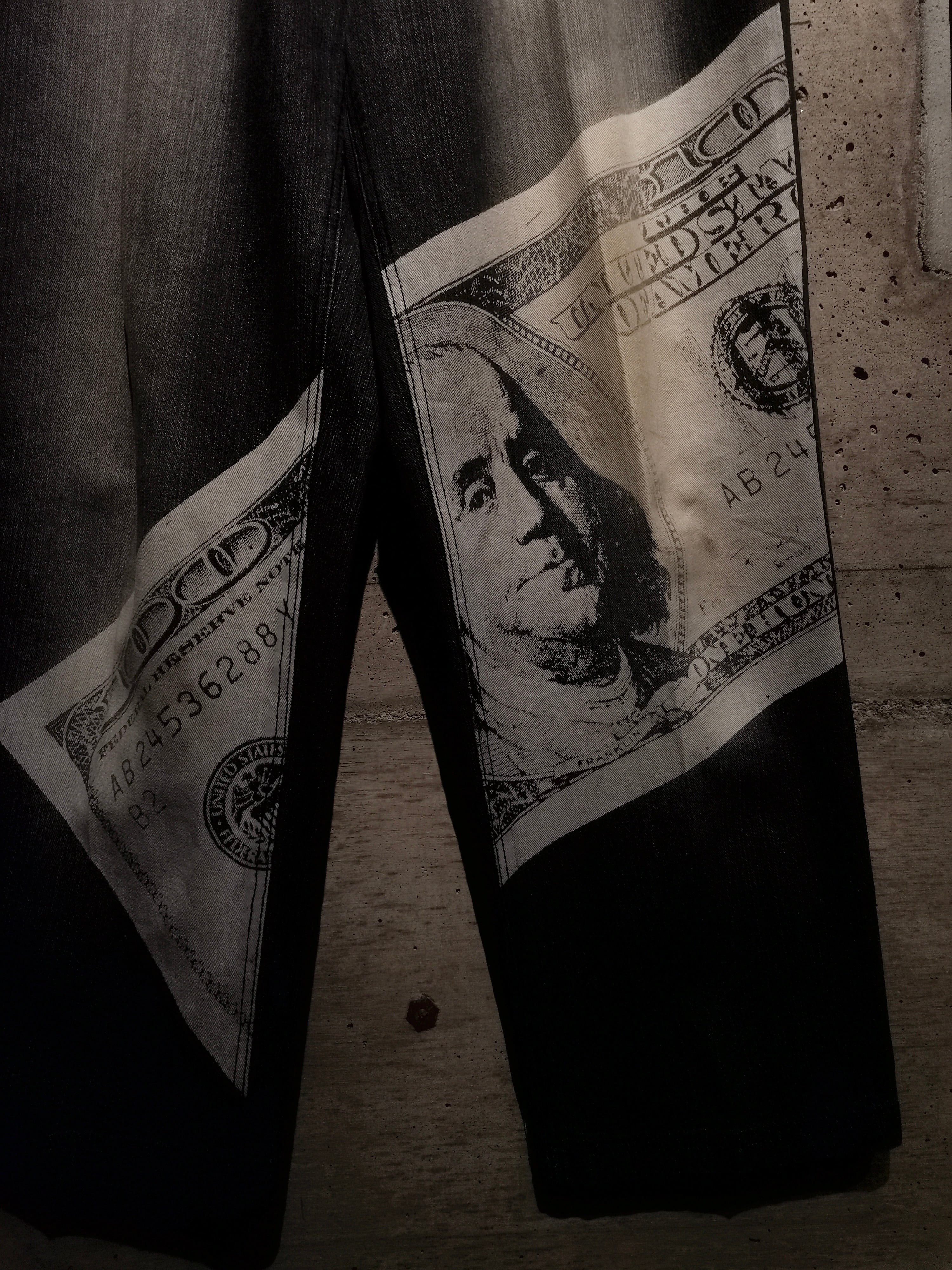 美しくフェードしたブラックデニムのボディに、大胆にドル札のプリントを載せた、"STUB JEANS"のスペシャルなバギーデニムパンツ。