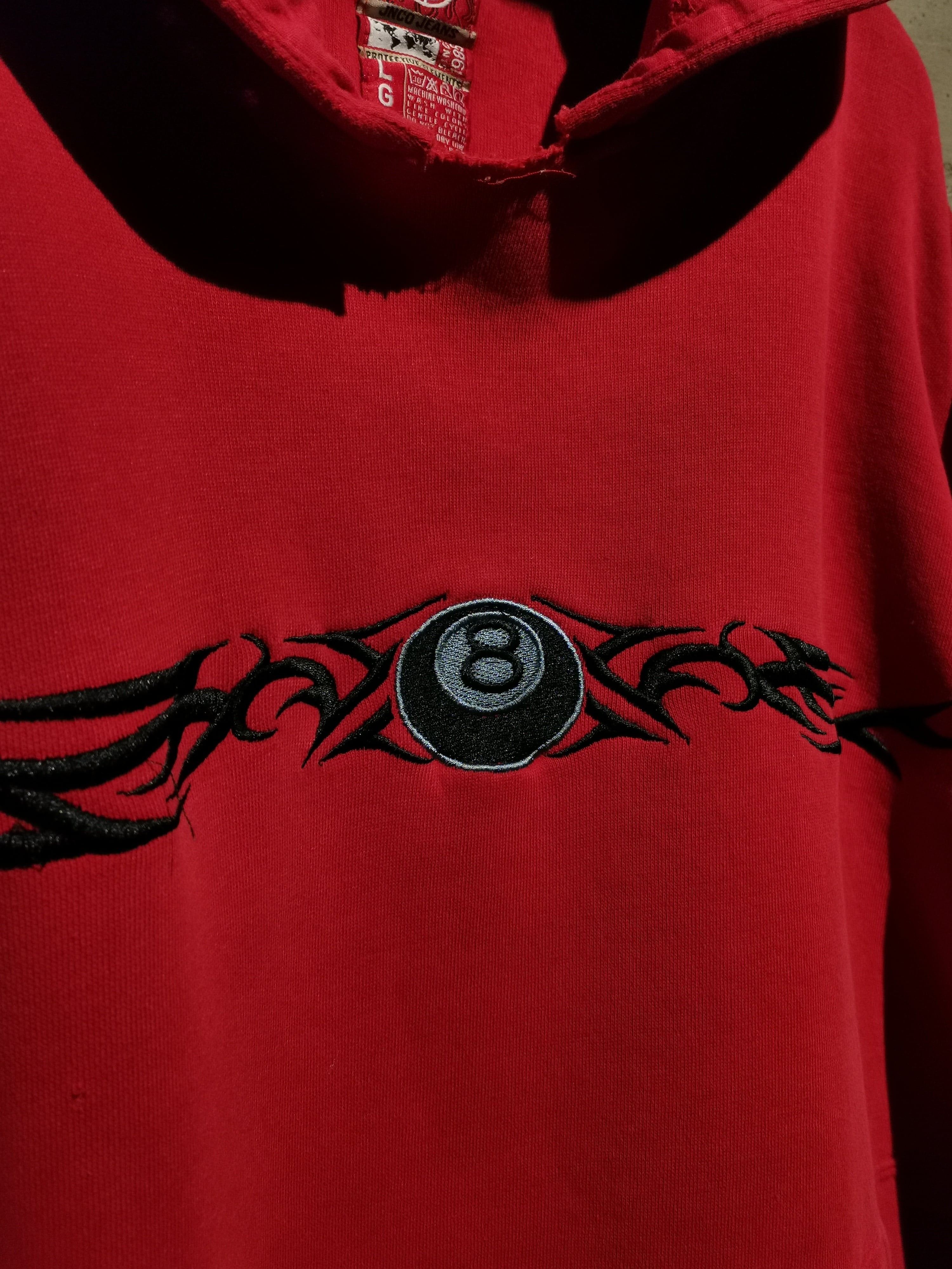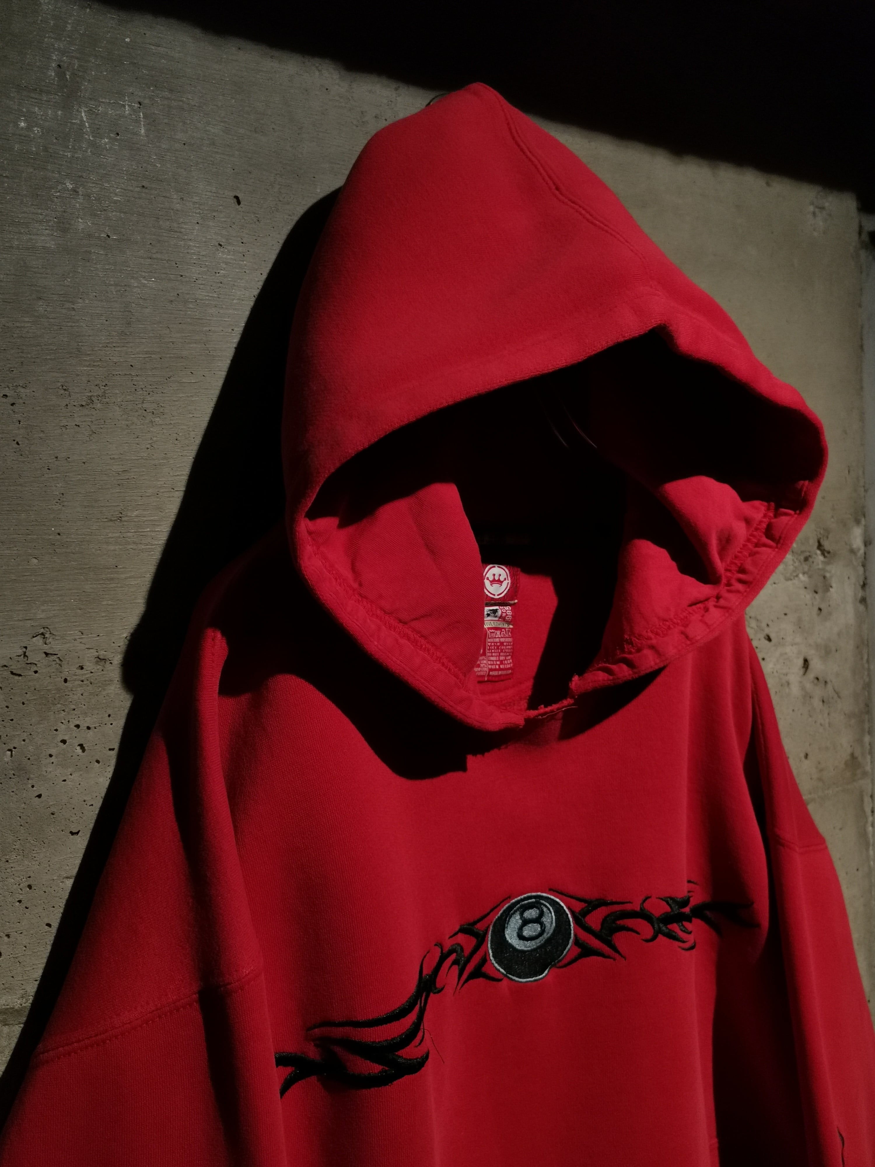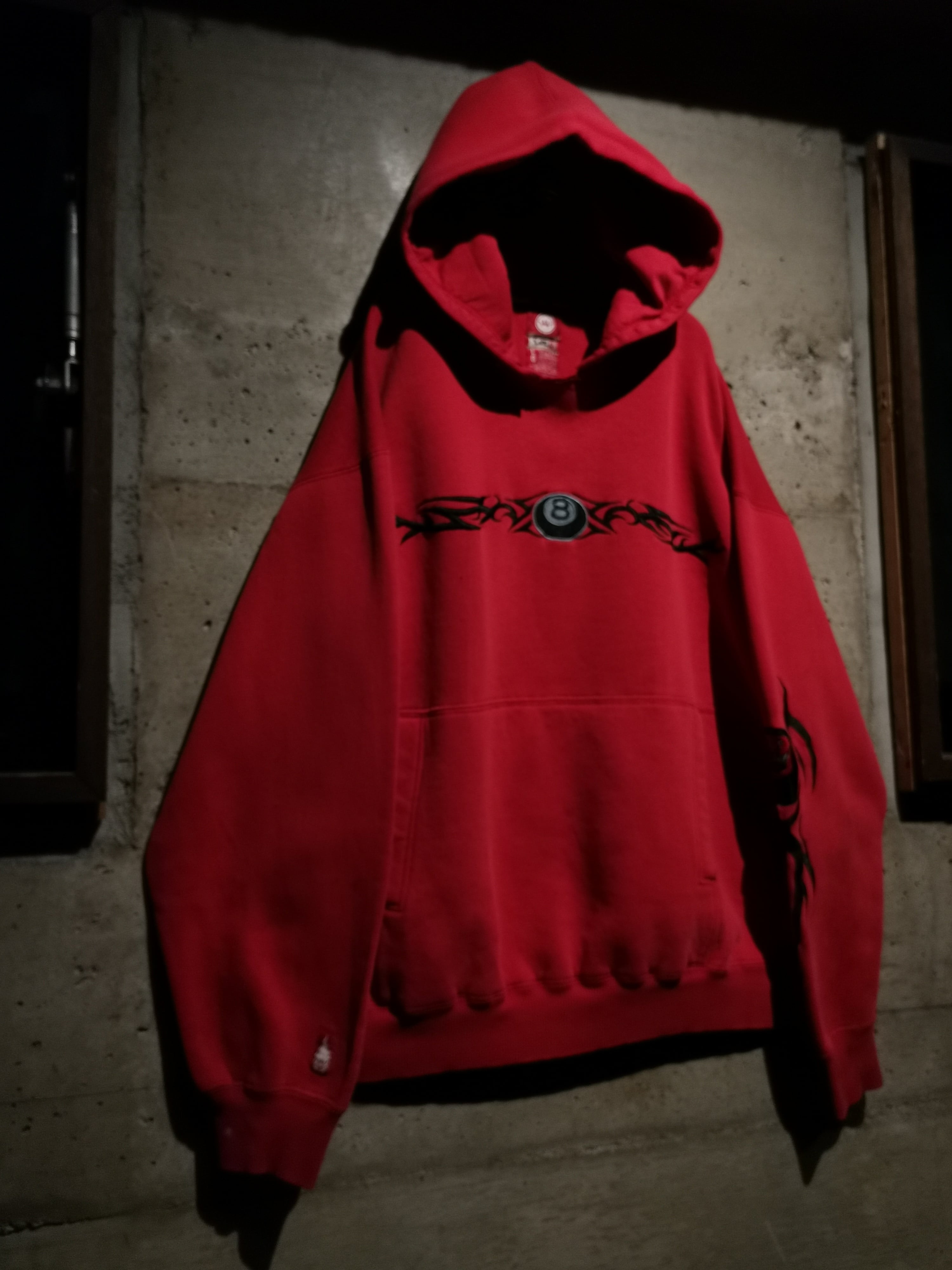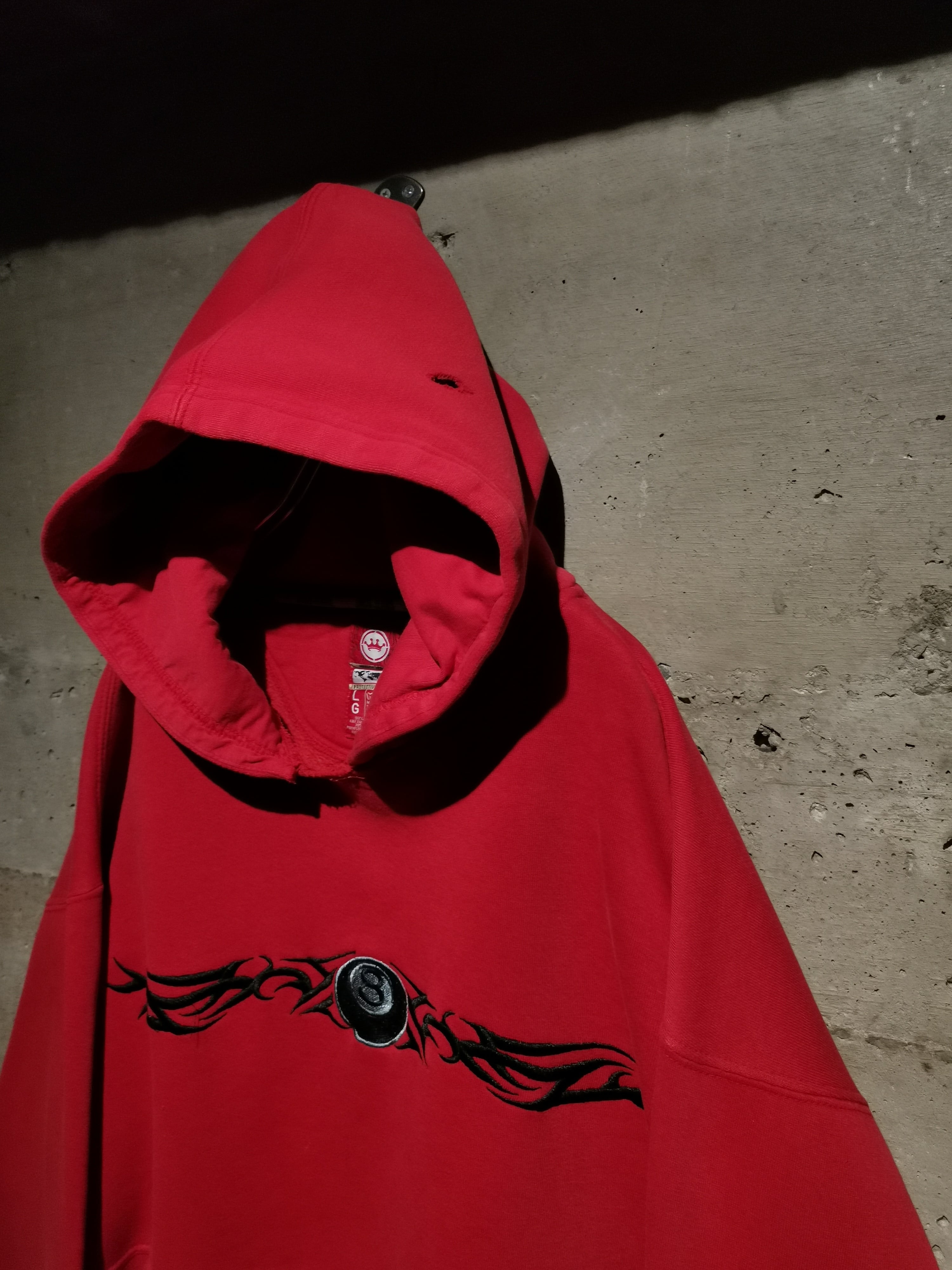 発色の良い赤ボディに、スラングや"Stussy"の代表的なモチーフとして用いられる、ストリートカルチャーと深い関わりを持つ"8ボール"とトライバル柄を立体的な刺繍で載せた1着。
