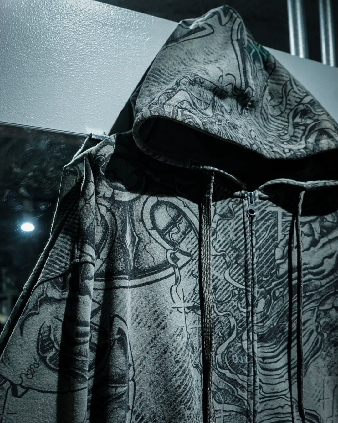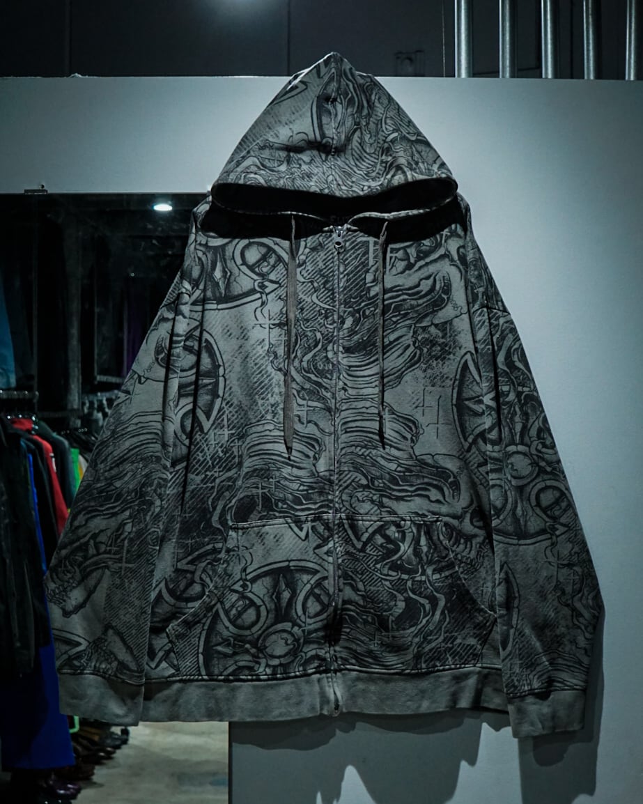 グラデーションがかかったブラックアンドグレーで描かれたドクロやゴシック調のプリントが総柄で施されたジップアップパーカー。