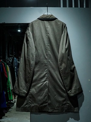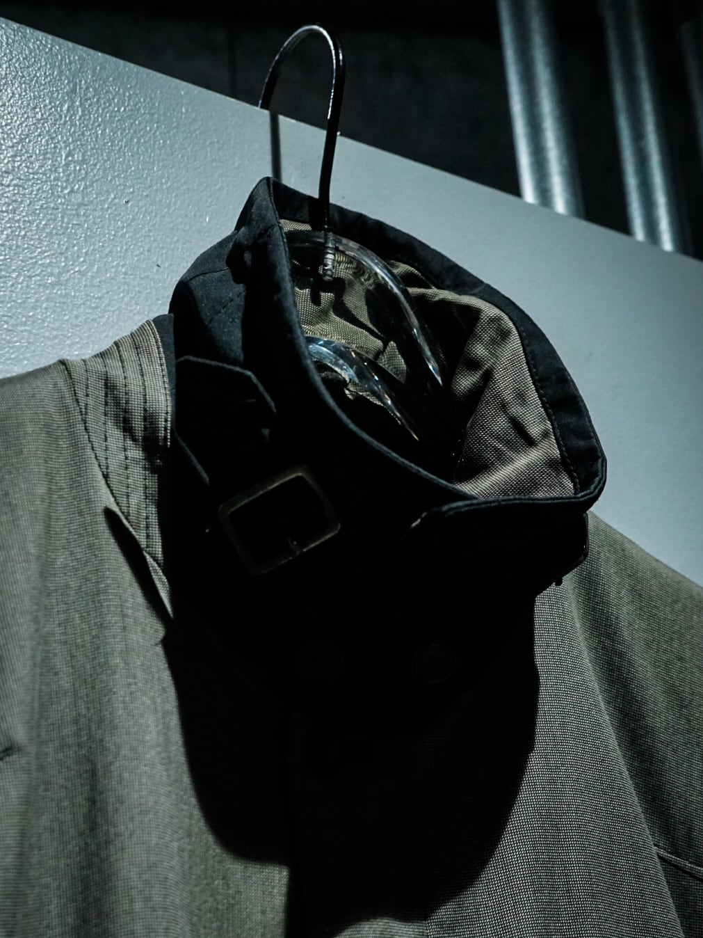 独特の光沢を放ちサラッと柔らかく薄いベージュのコットンナイロンの素材を使用したミドルコート。