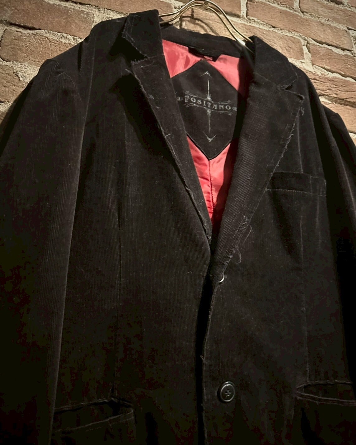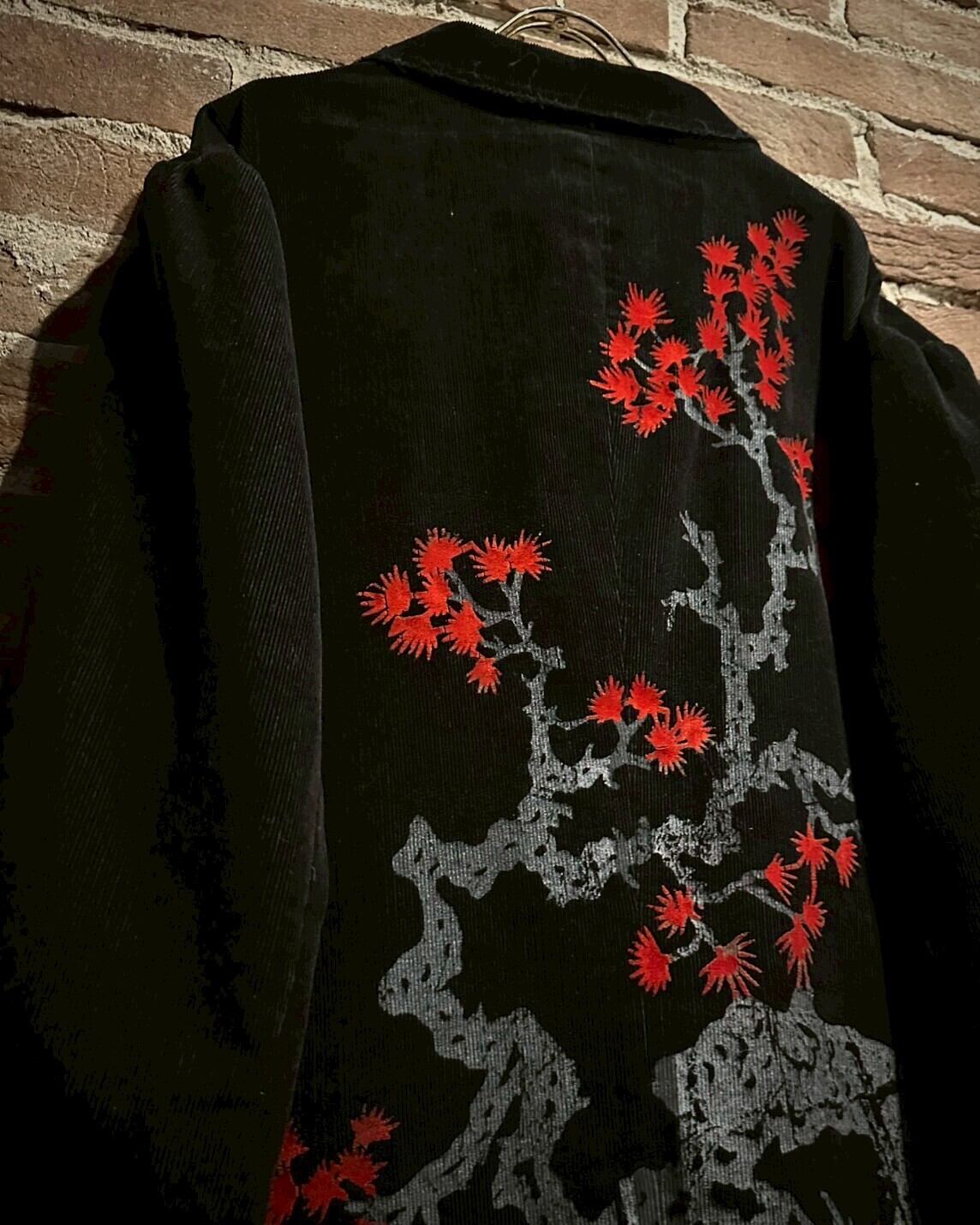 上品さのある細畝のブラックコーデュロイを用いたボディをベースに、背面に美しい紅葉のプリントを施した芸術的なデザイン性高いテーラードジャケット。