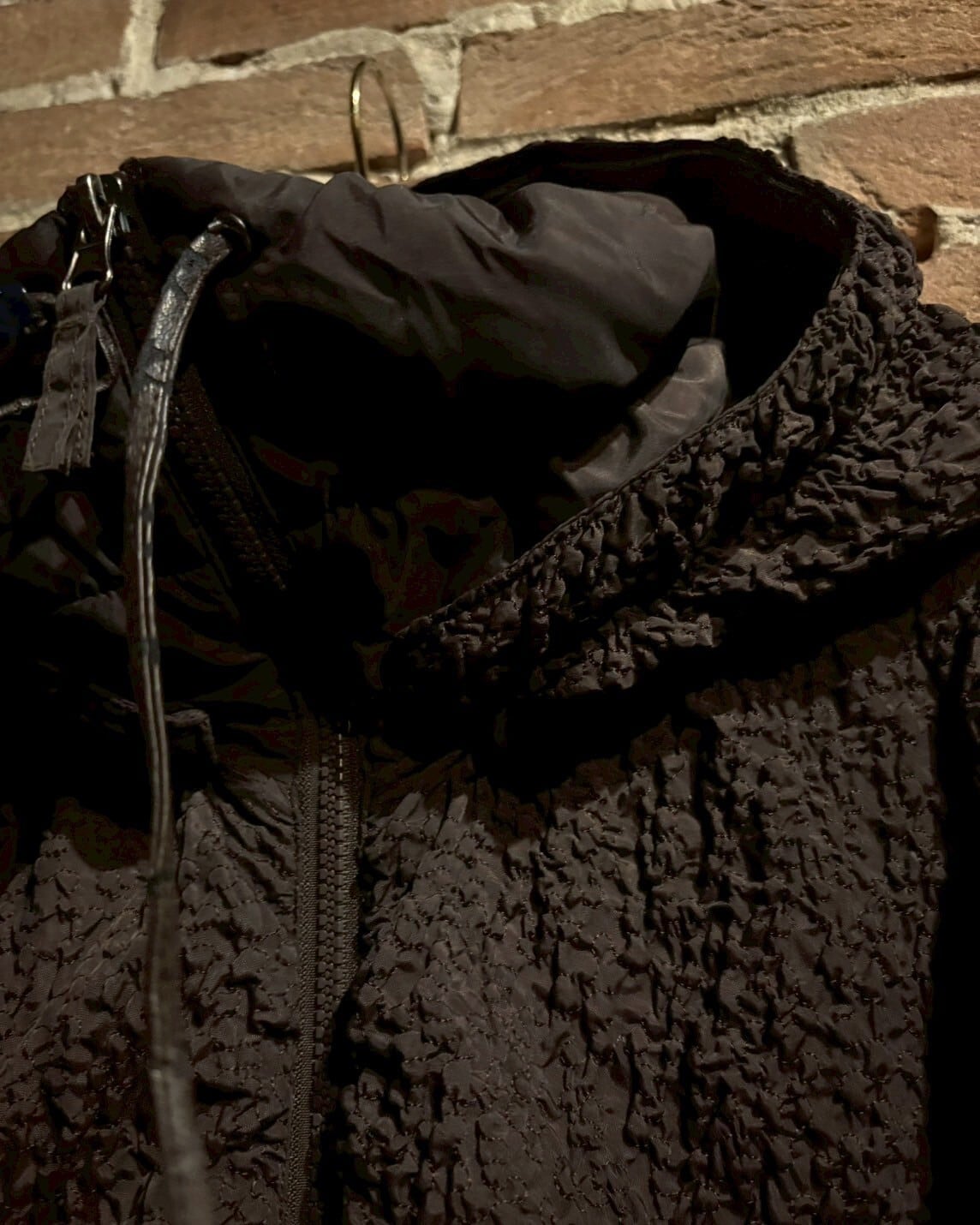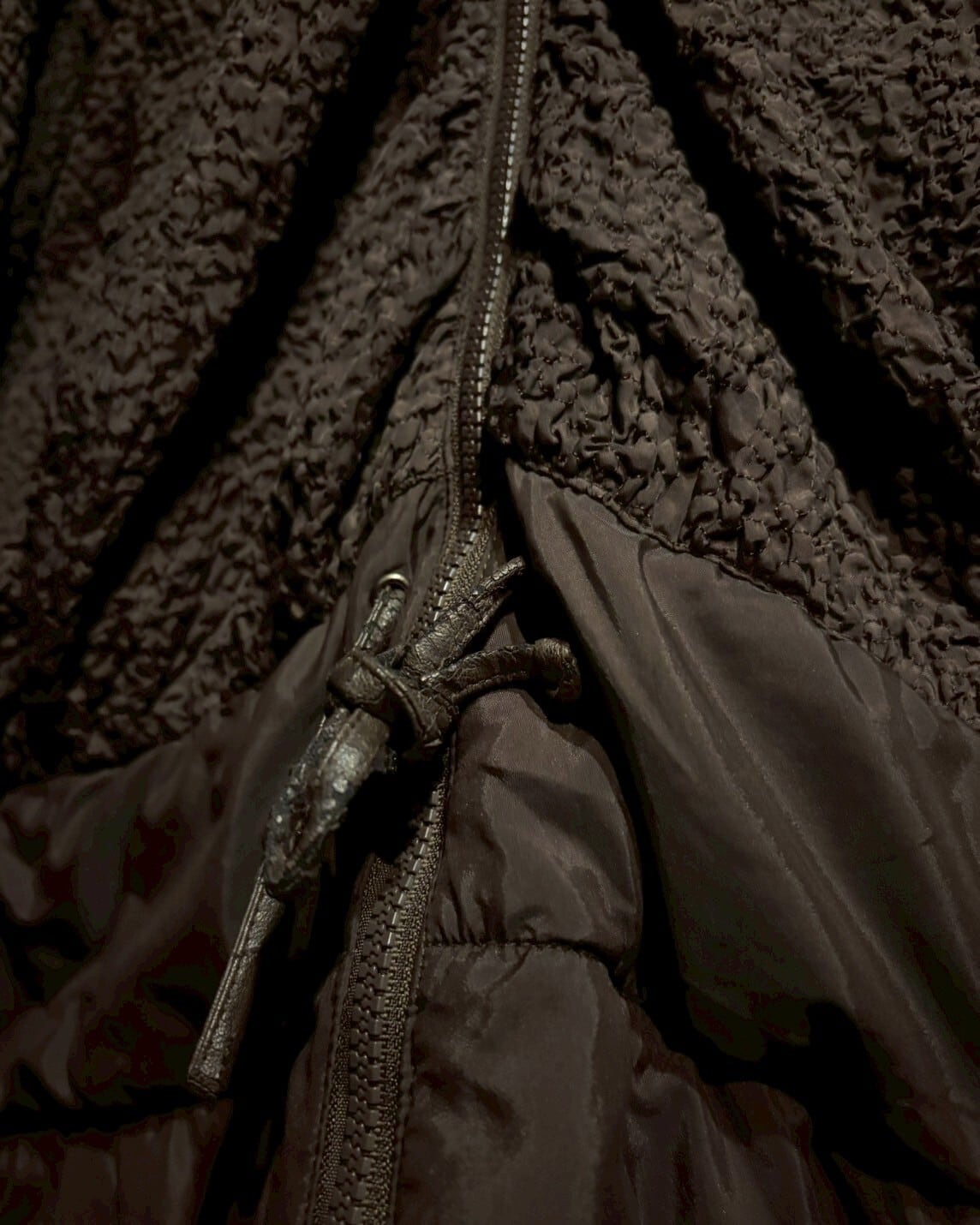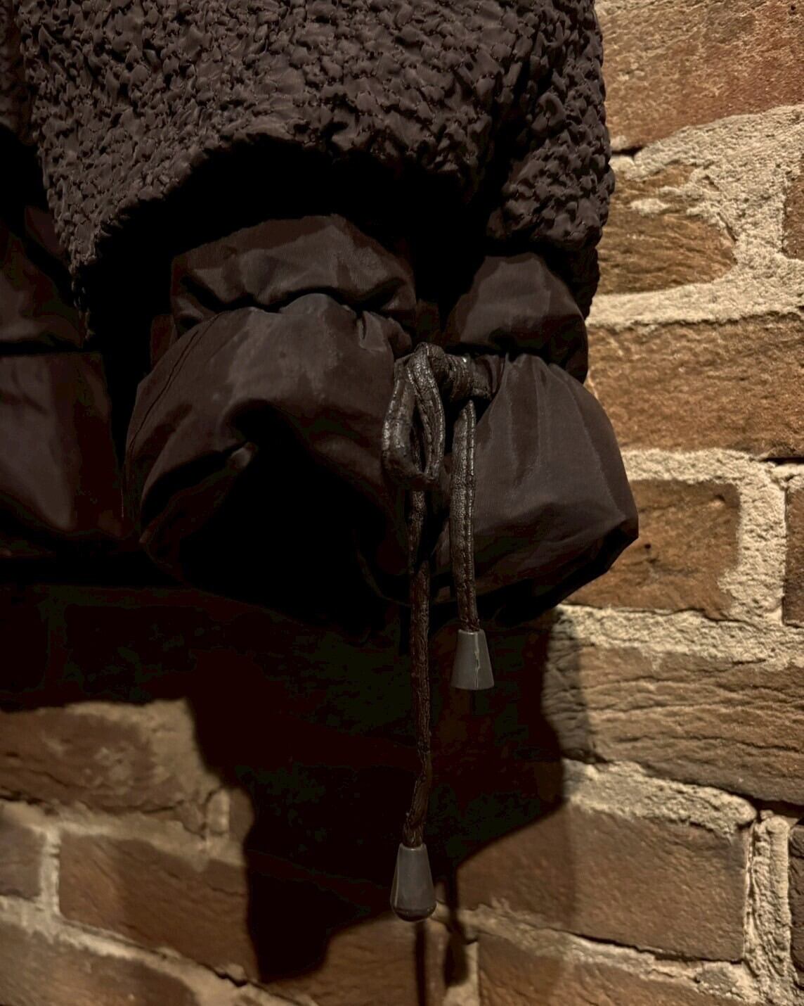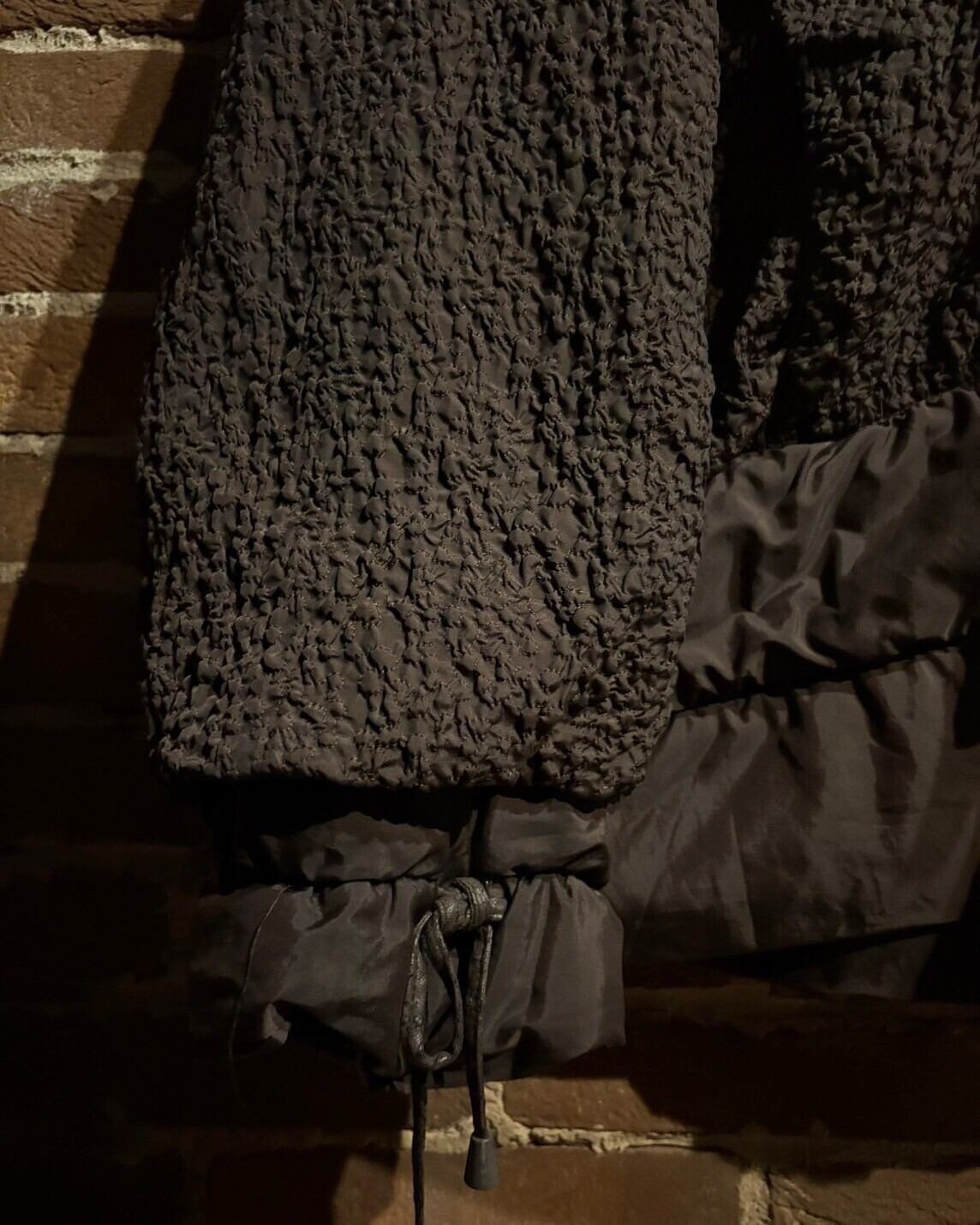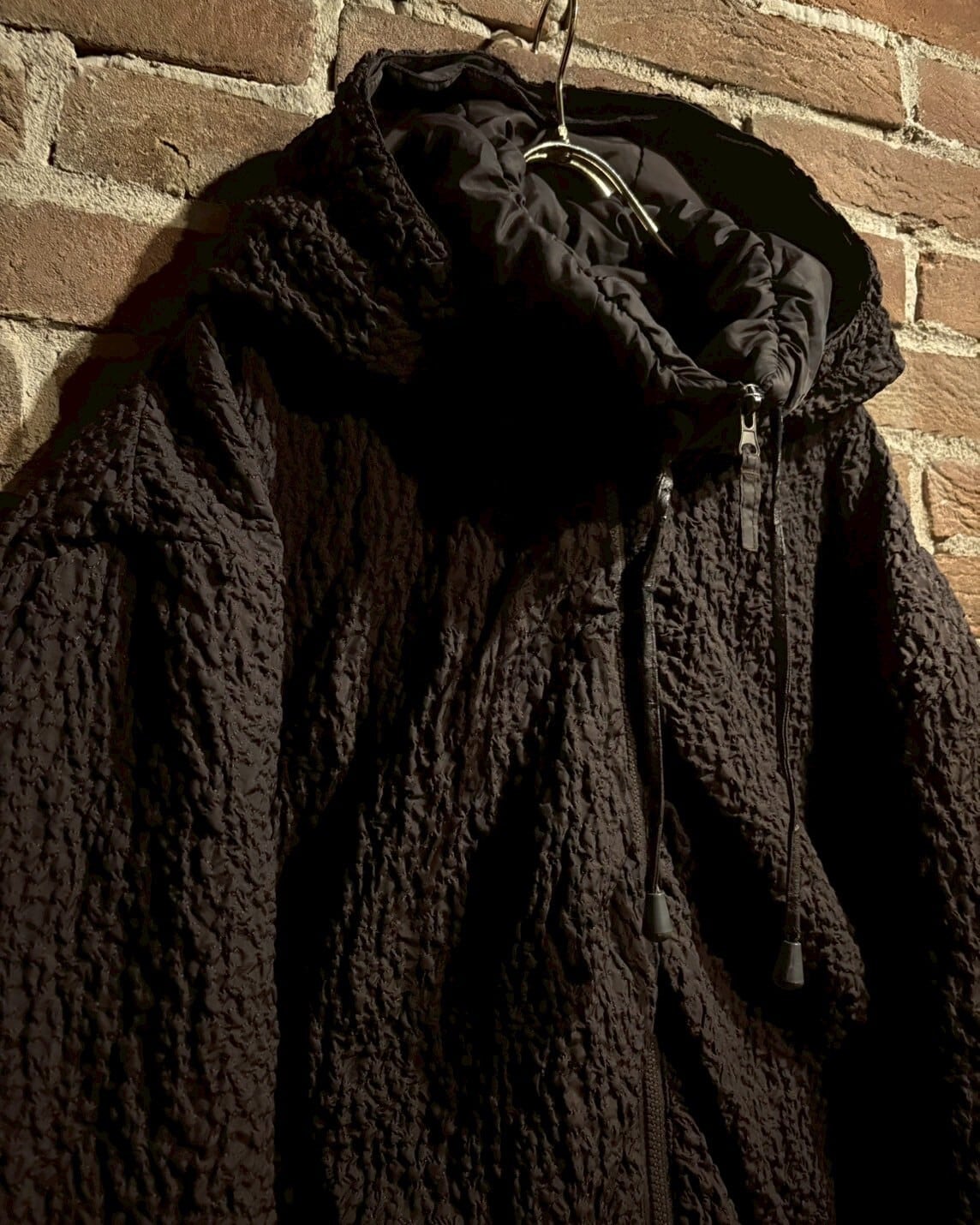 シャリ感のあるブラウンのボディをベースに、表面を収縮させることで生まれる独特のシボ感を纏ったフーディージャケット。