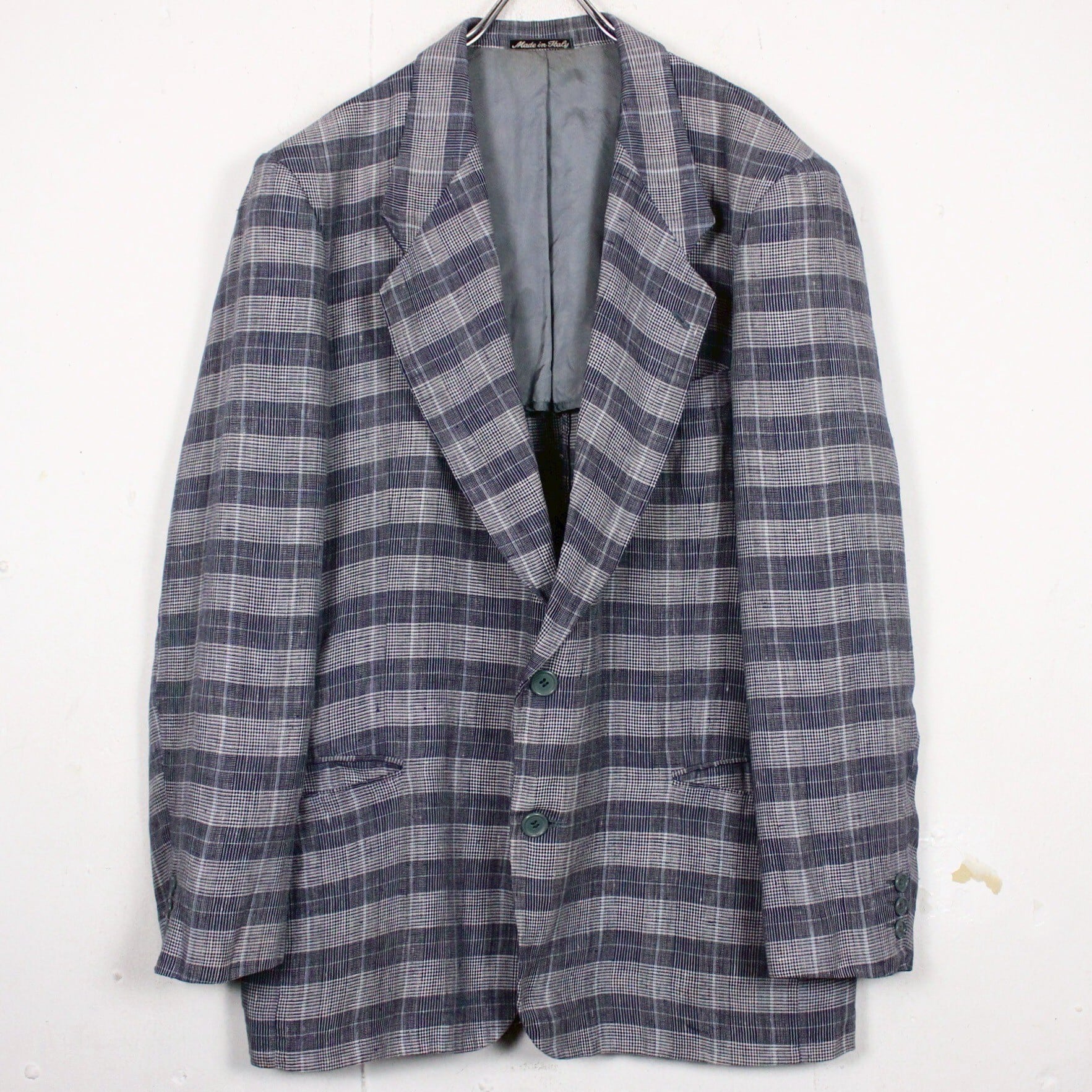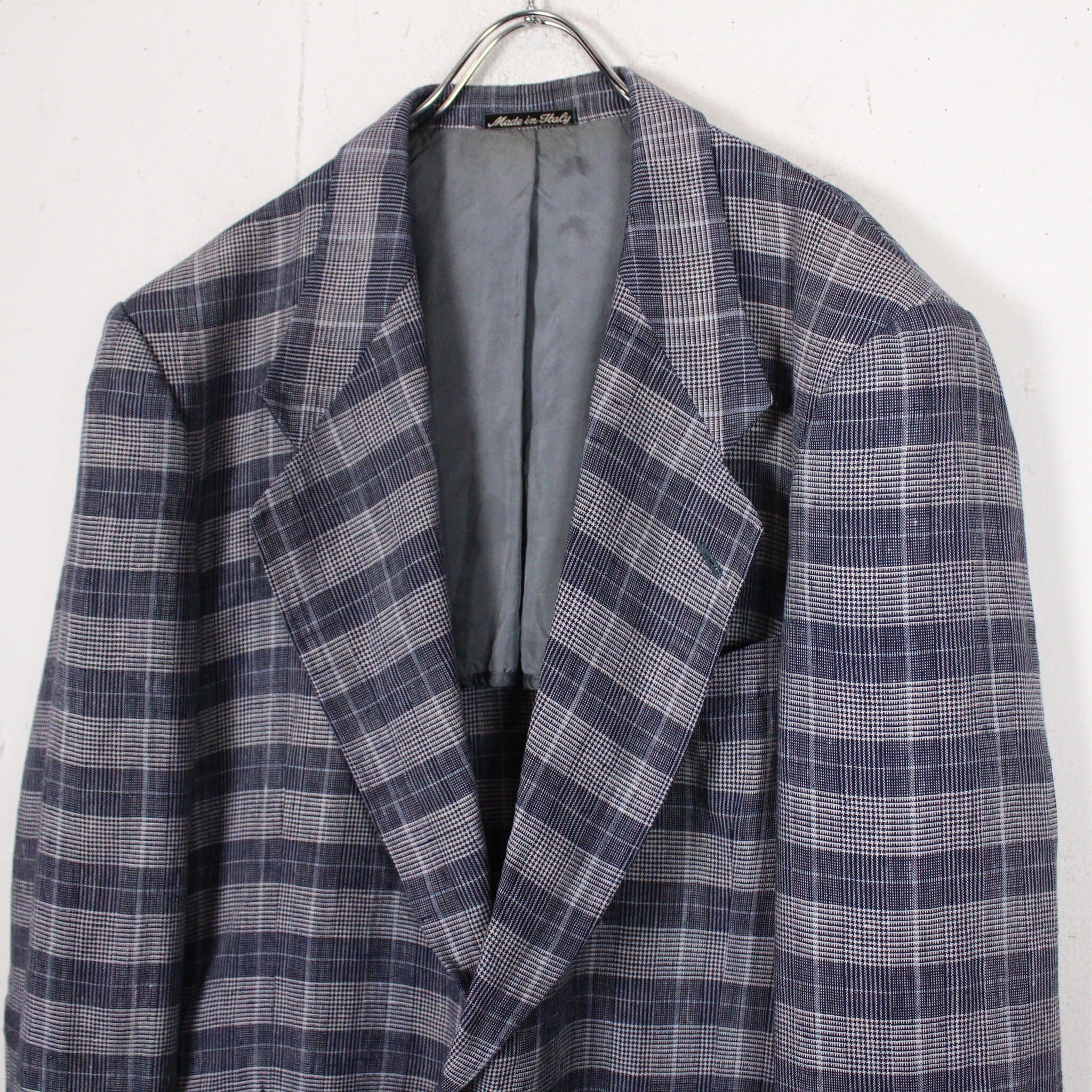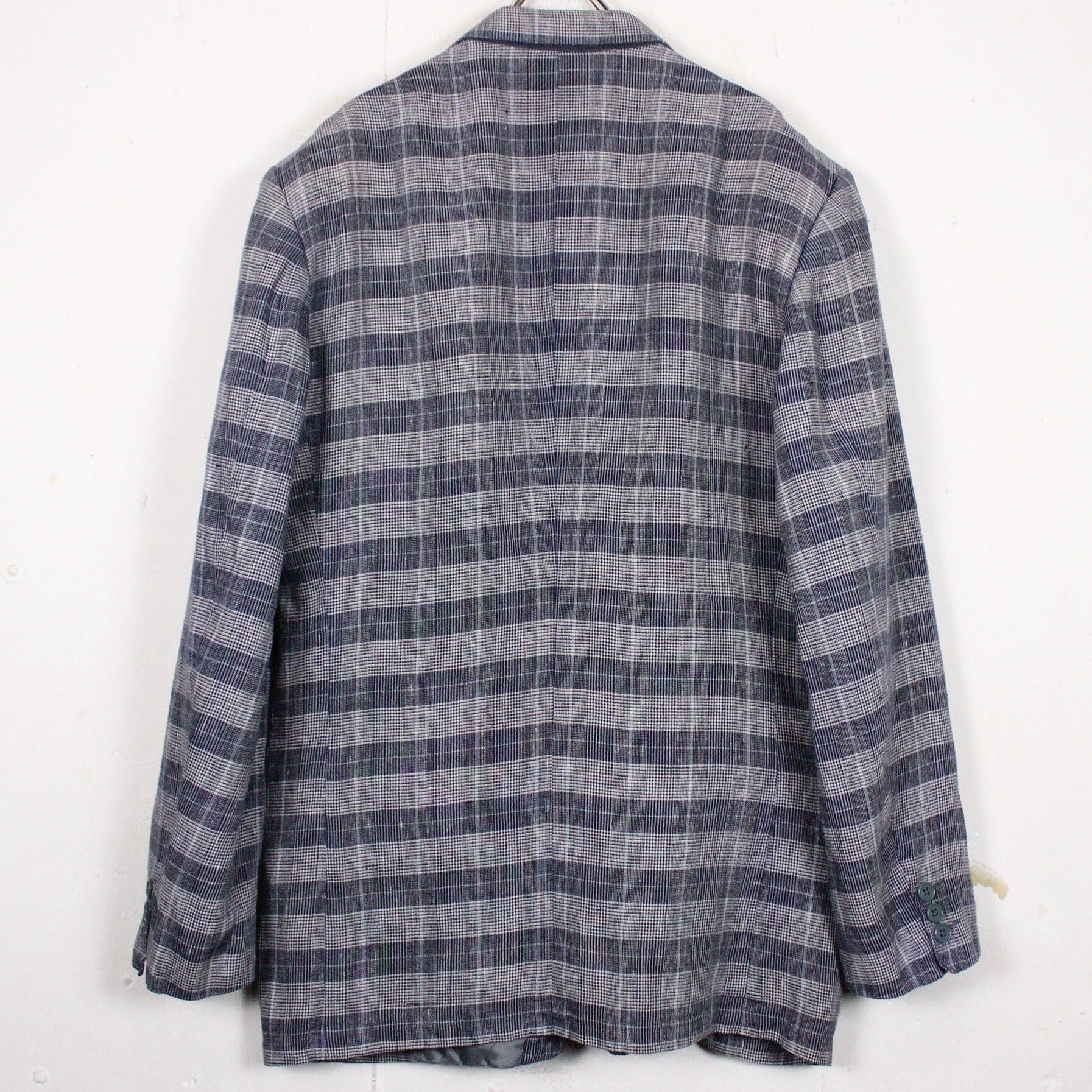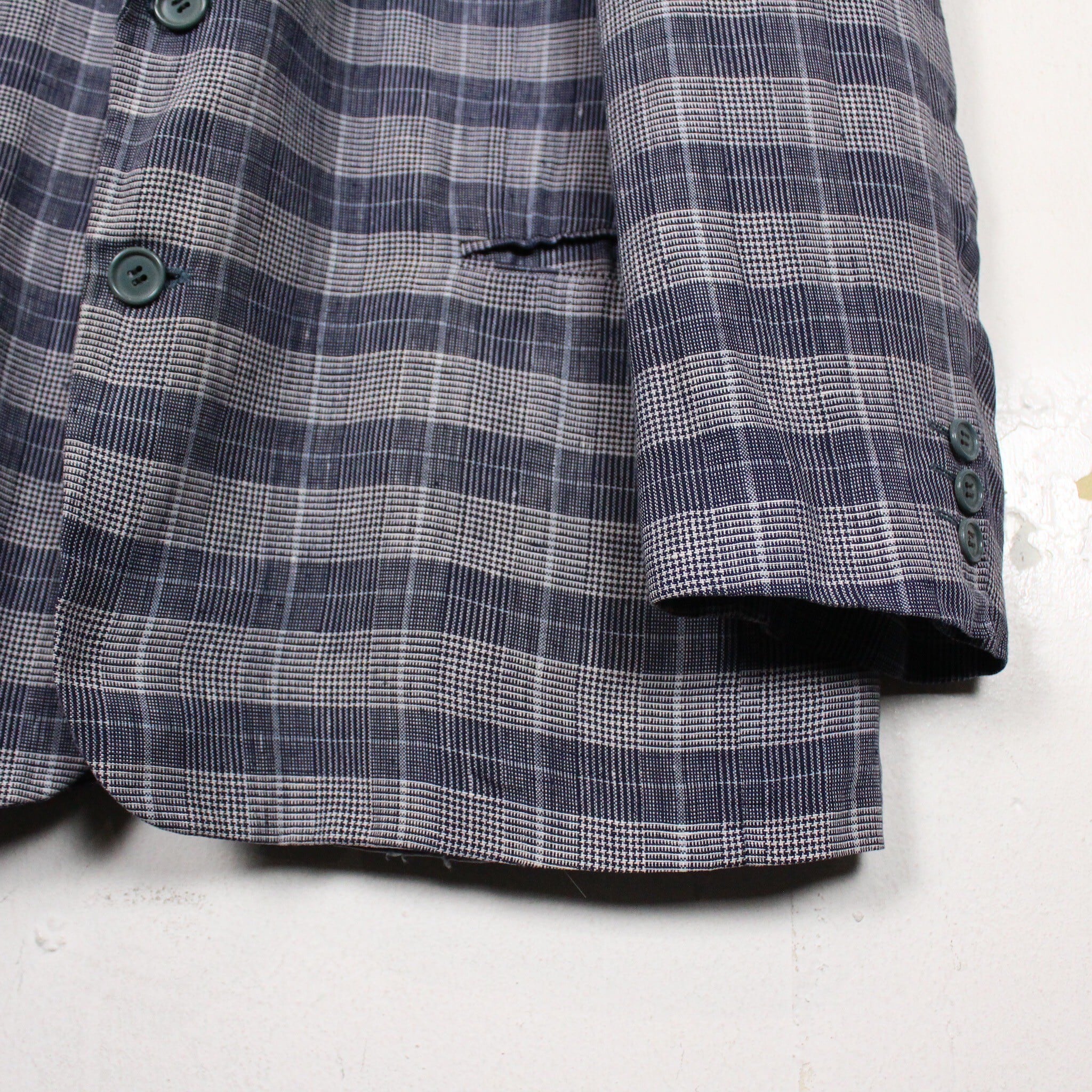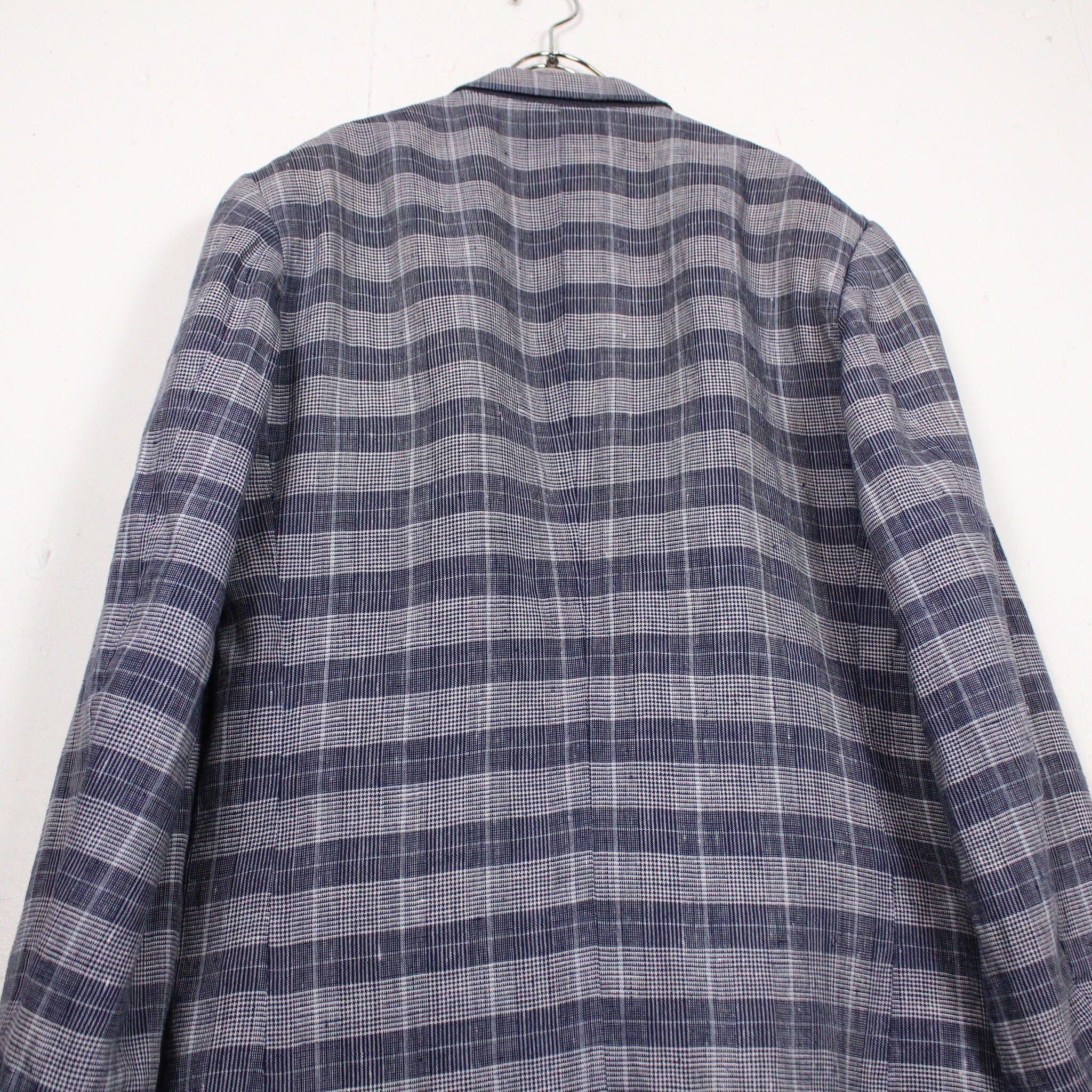 薄い水色のボディをベースに、濃いブルーのカラーリングでチェックパターンを載せたテーラードジャケット。