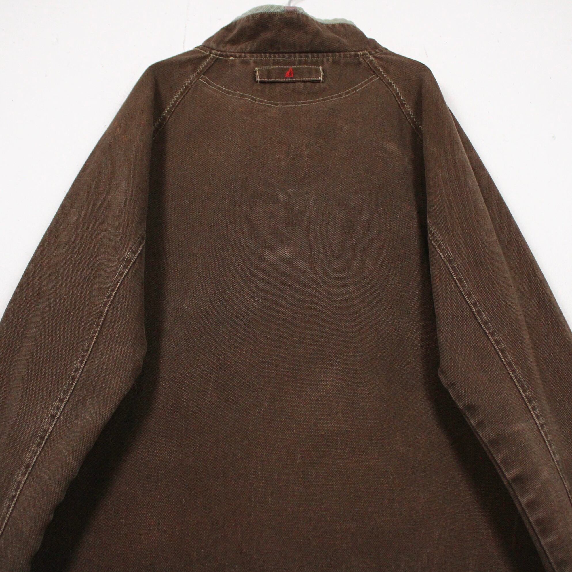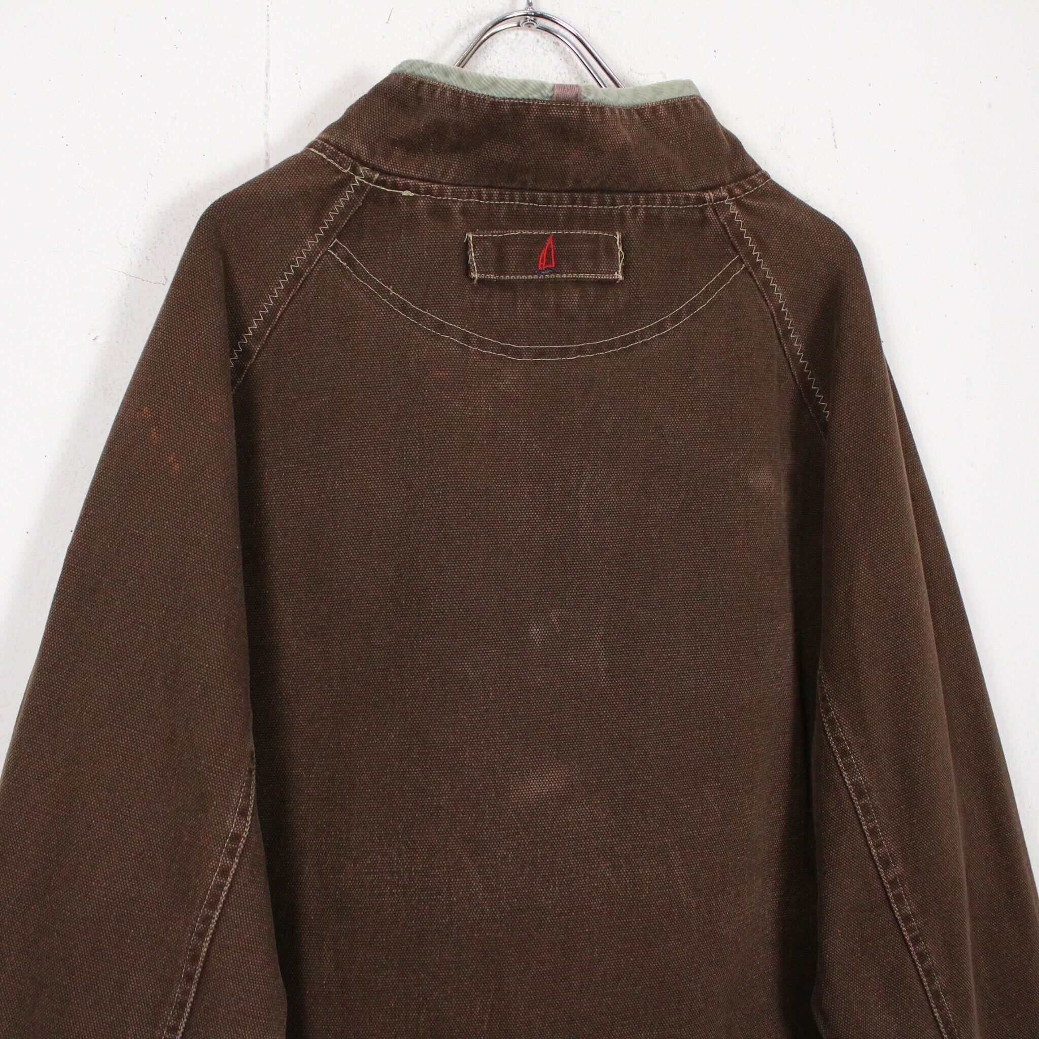色残りの良いブラウンのダック素材のボディに、ハーフジップのギミックを載せた、プルオーバージャケット。