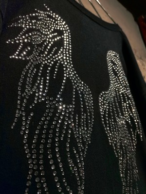 ブラックのボディに、フロント、袖にはクロスモチーフの柄、背面には大ぶりの羽をラインストーンによって施したブリンブリンなデザインが施された1着。