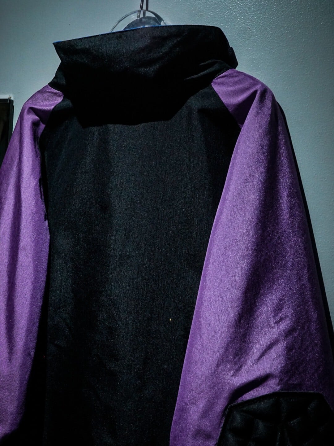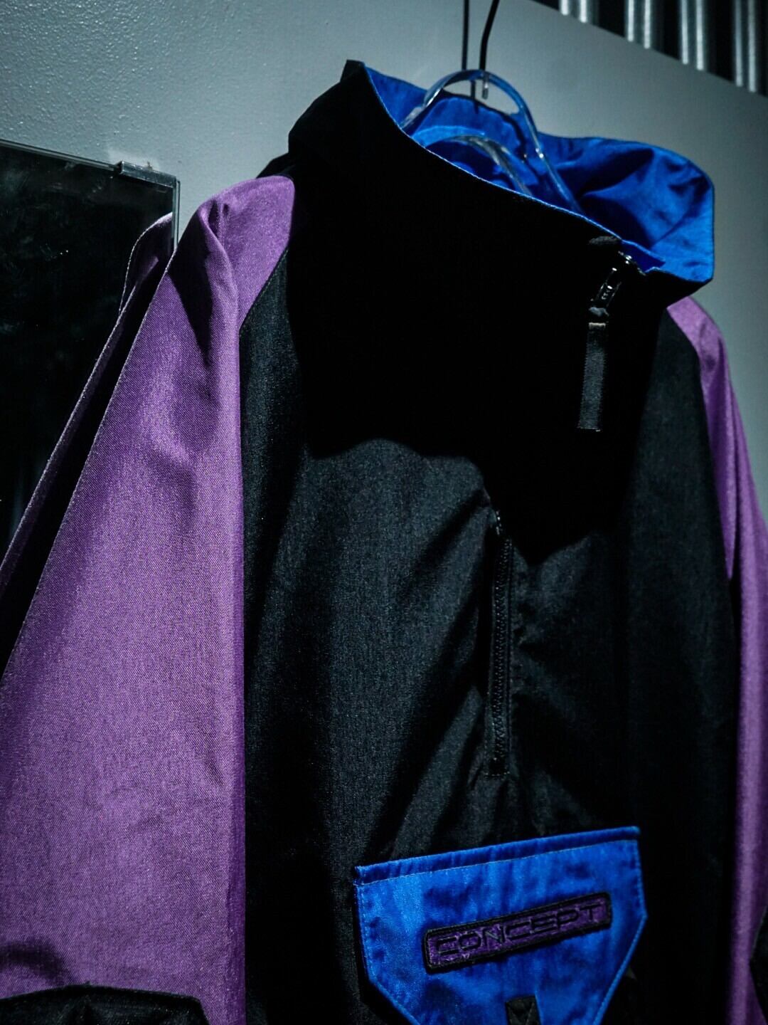 ブラックのボディをべーすに、アームには紫、襟口、フロントポケットには青の切り替えを施したハーフジップジャケット。