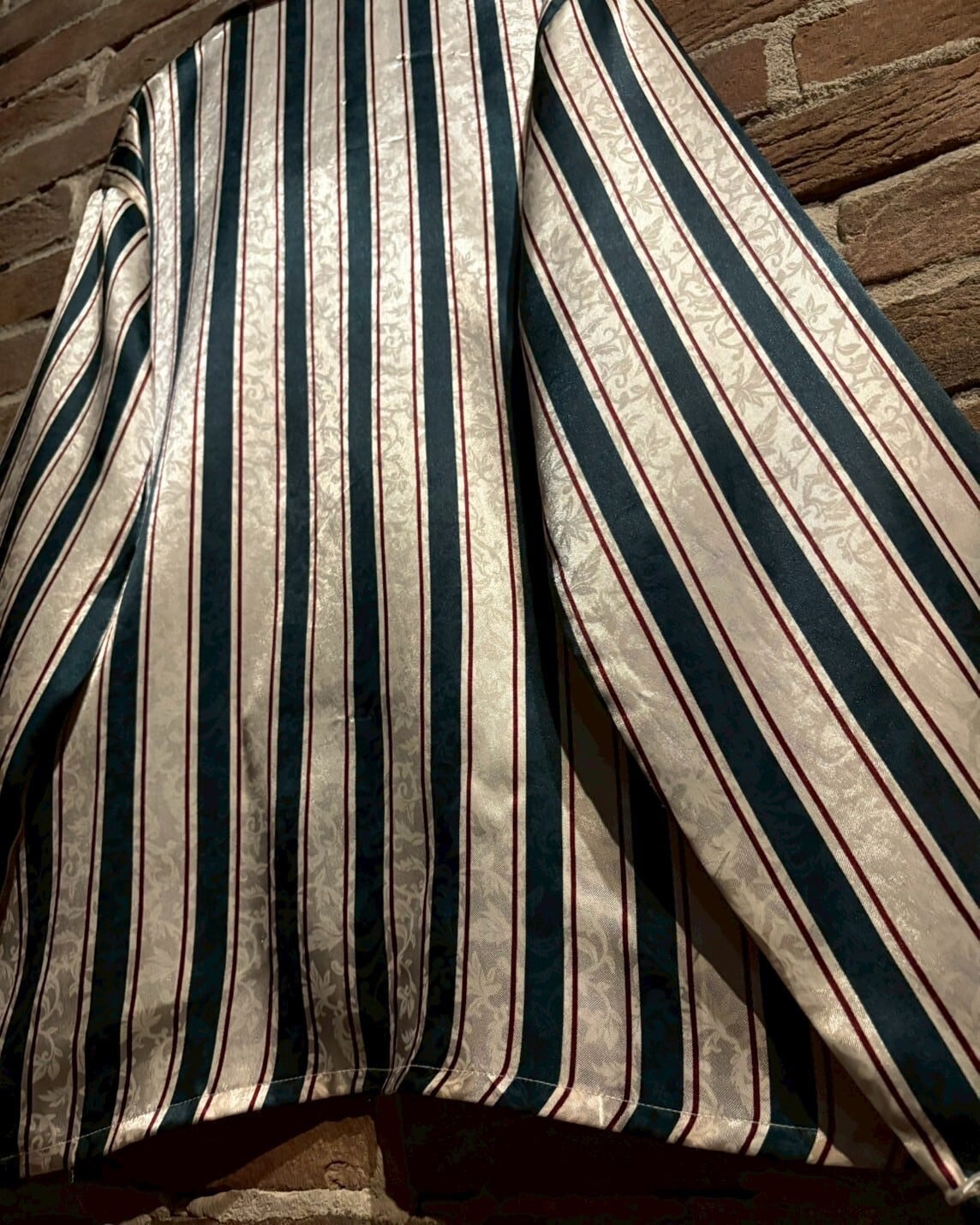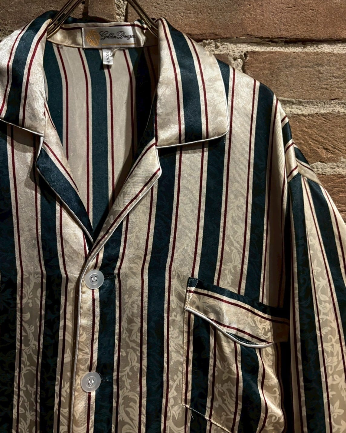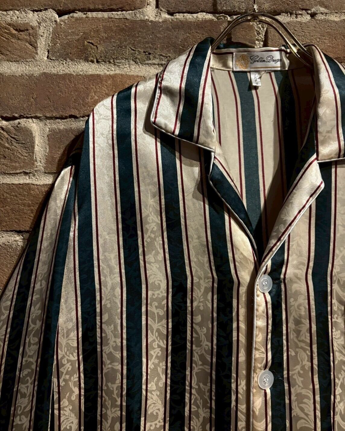 見る角度によって浮き上がる柄模様が至極美しく、素材特有の光沢、フロントのシェルボタンが高級感を漂わせています。