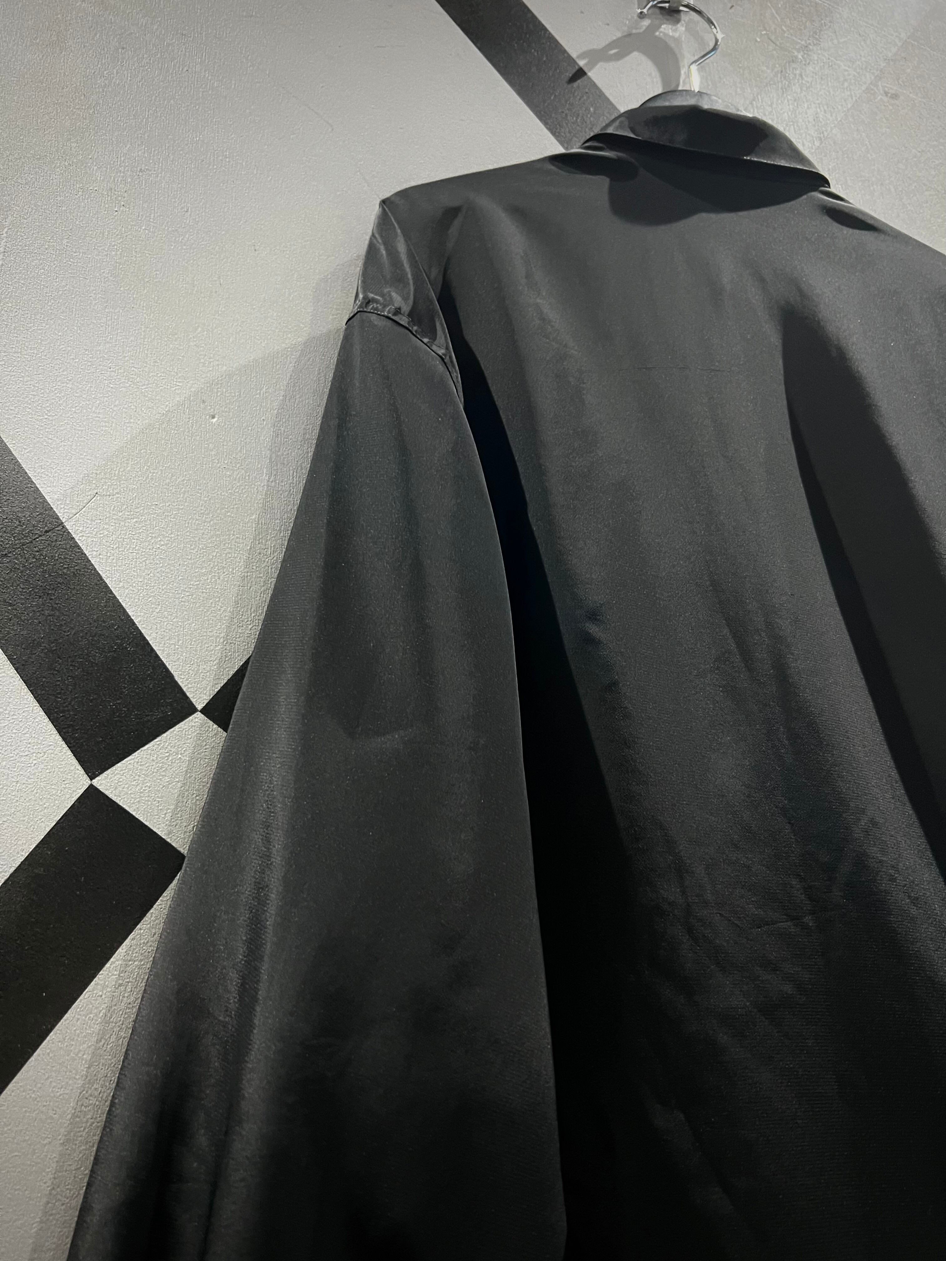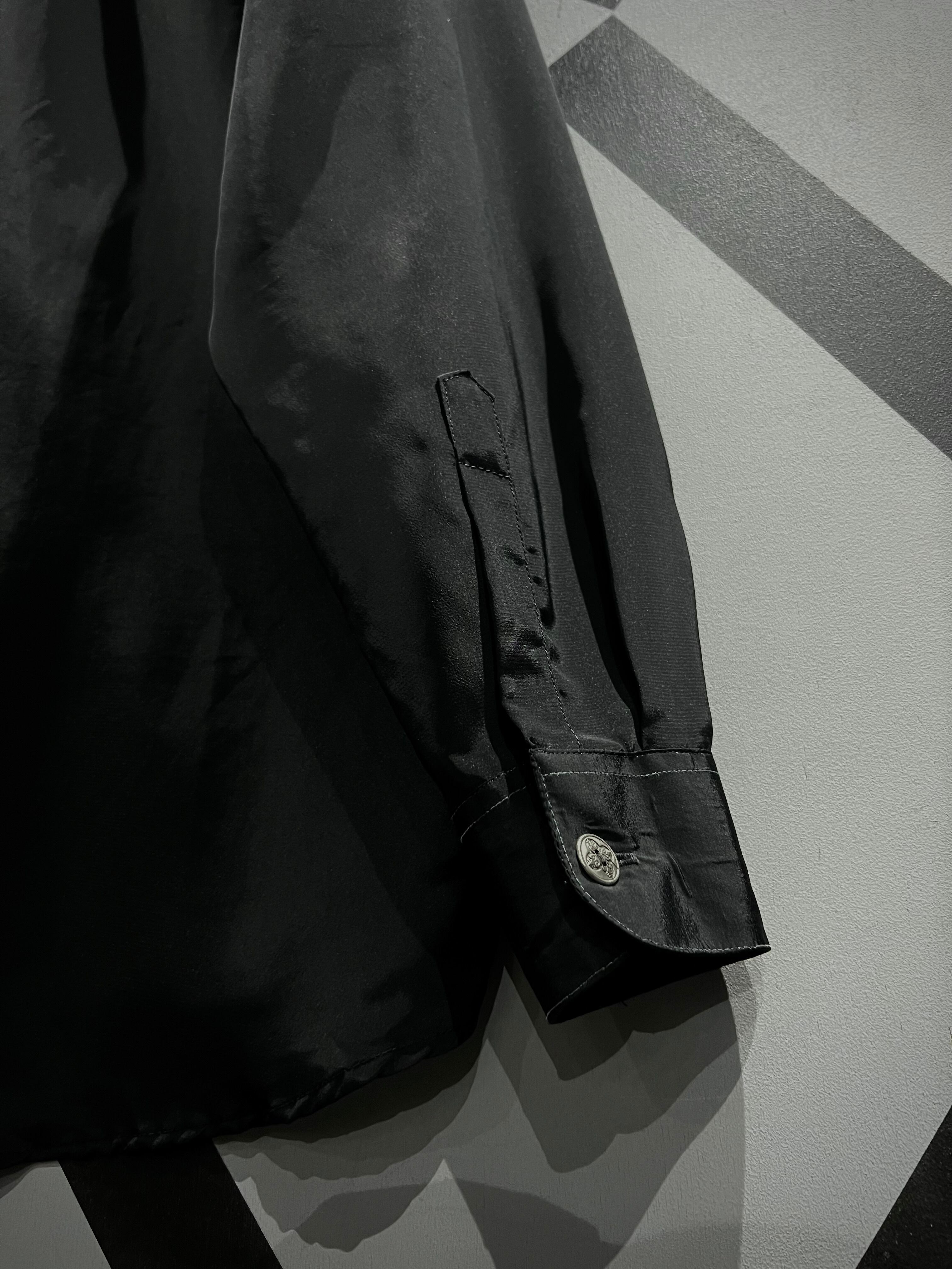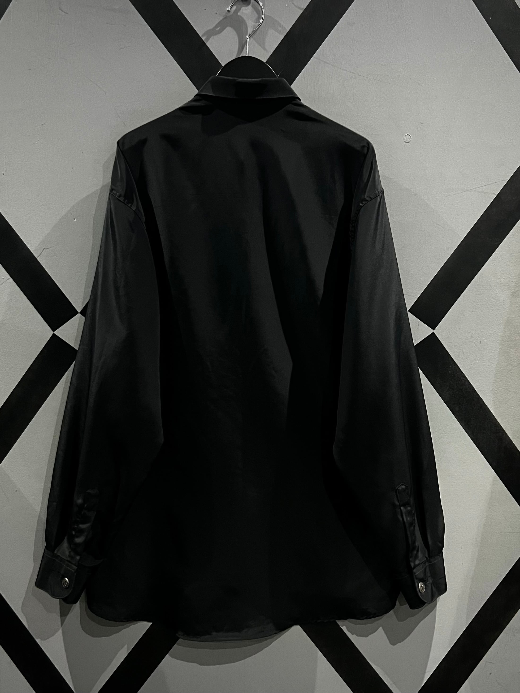 ブラックのボディをベースに、フロントにチェック柄を異なる生地で切り替えた長袖シャツ。