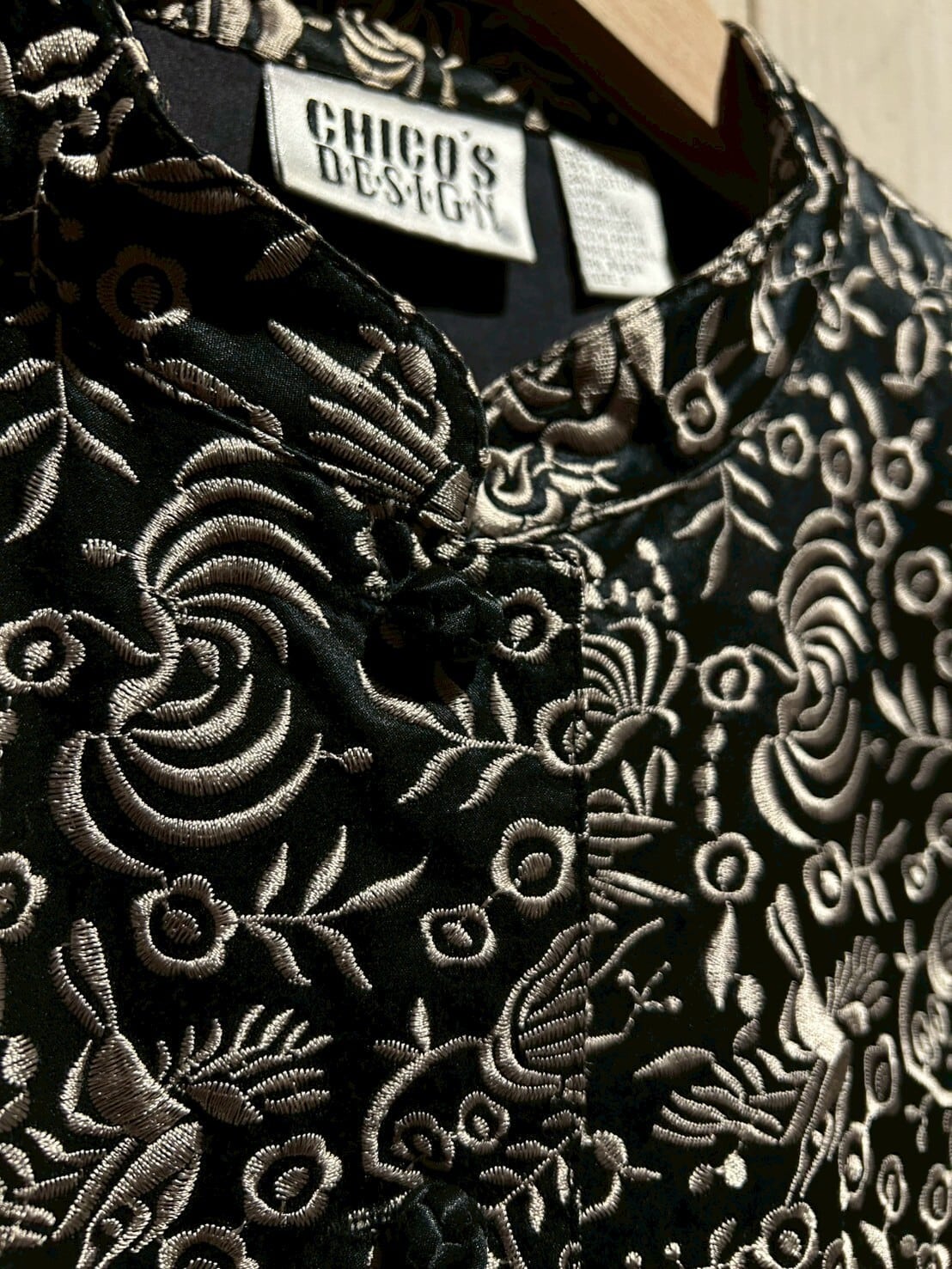 極上の素材に美しい花の刺繍を芸細やかに、繊細にみっちりと刻み込んだ、"CHICO'S'ならではの高いデザイン性、ファッション性を兼ね備えたスペシャルな1着です。