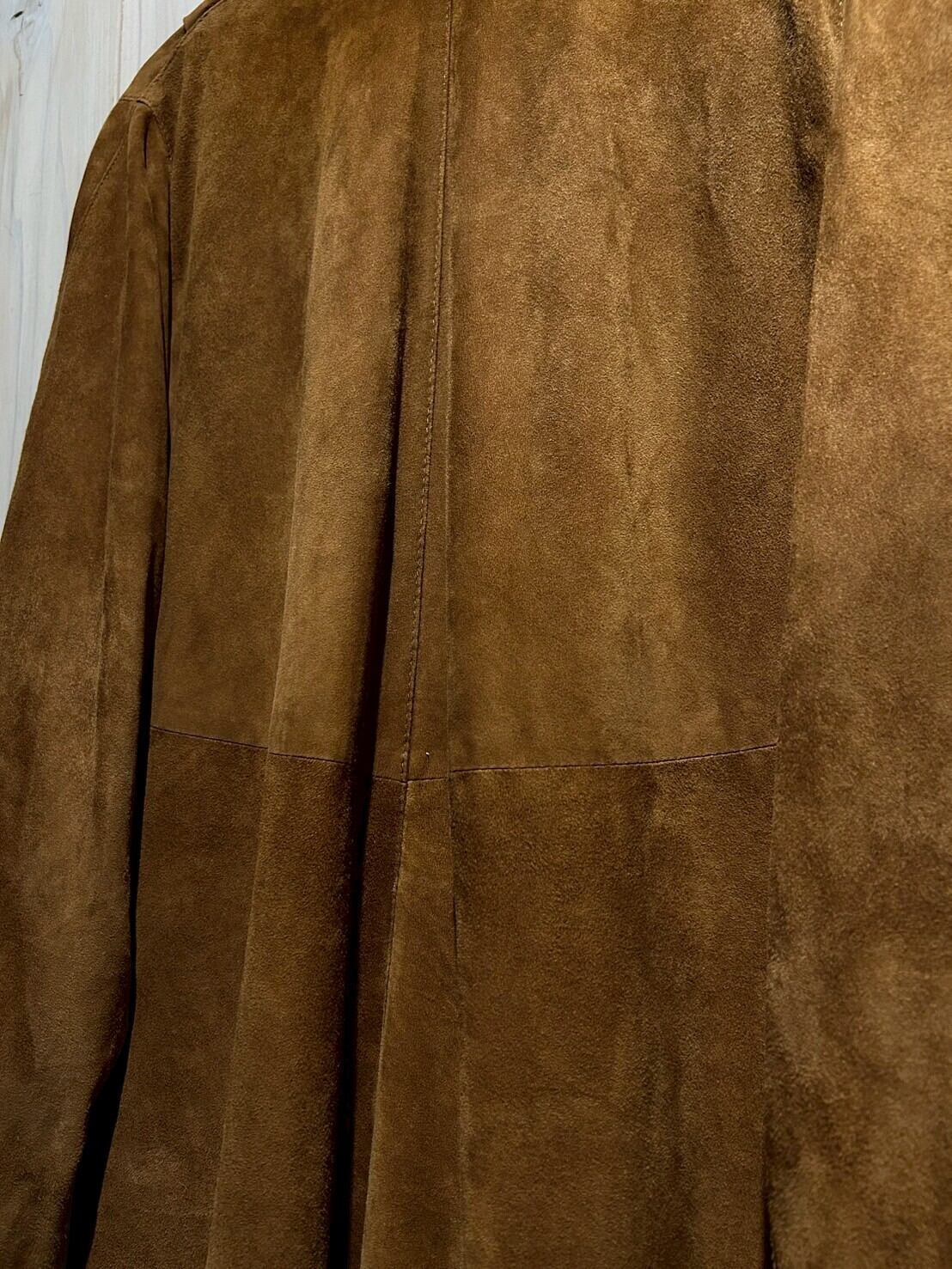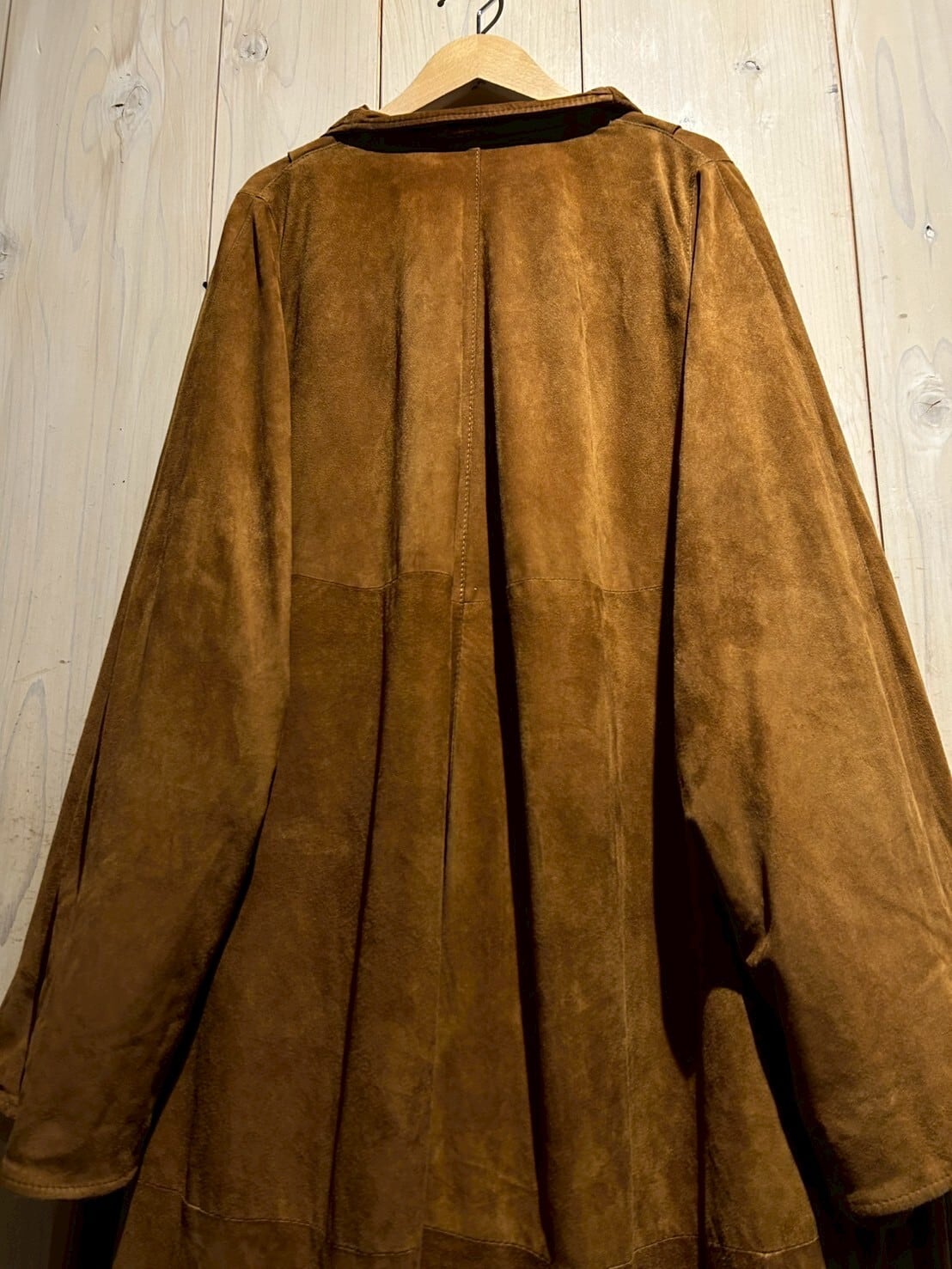 薄手でしなやか、上質なスエードレザーを用いたことで生まれゆくドレープが素晴らしい、、、デザインこそシンプルですが、着用時のシルエットには惚れ惚れしてしまいます。