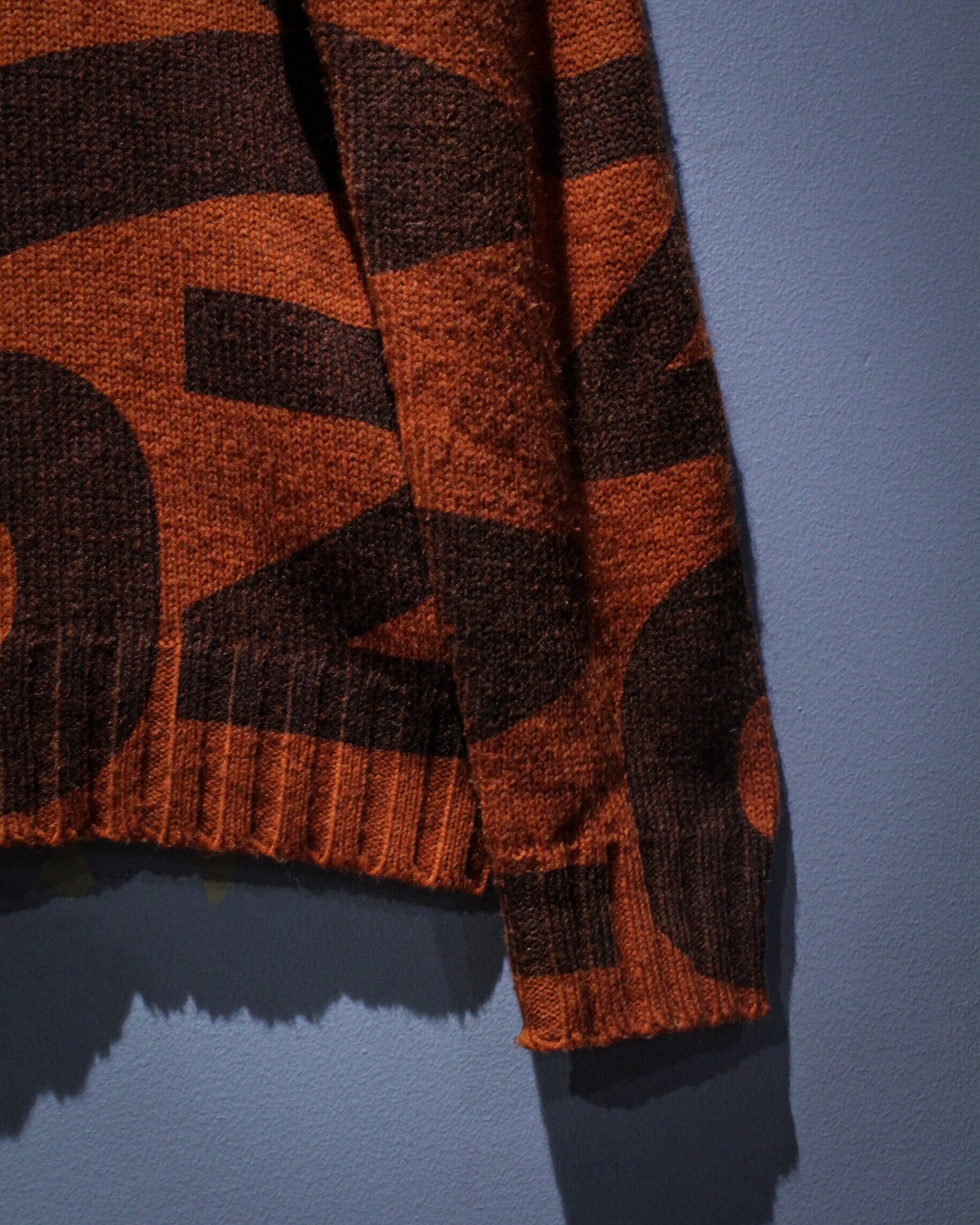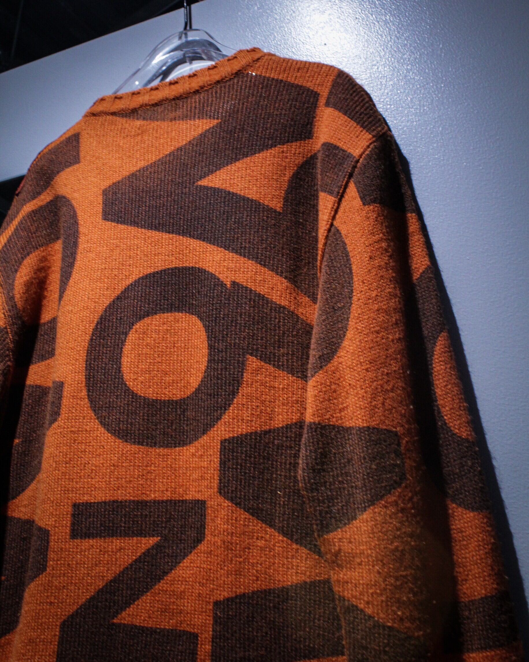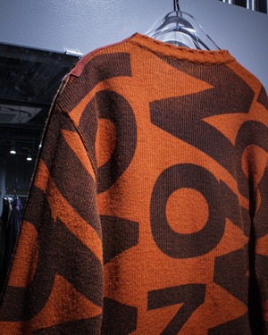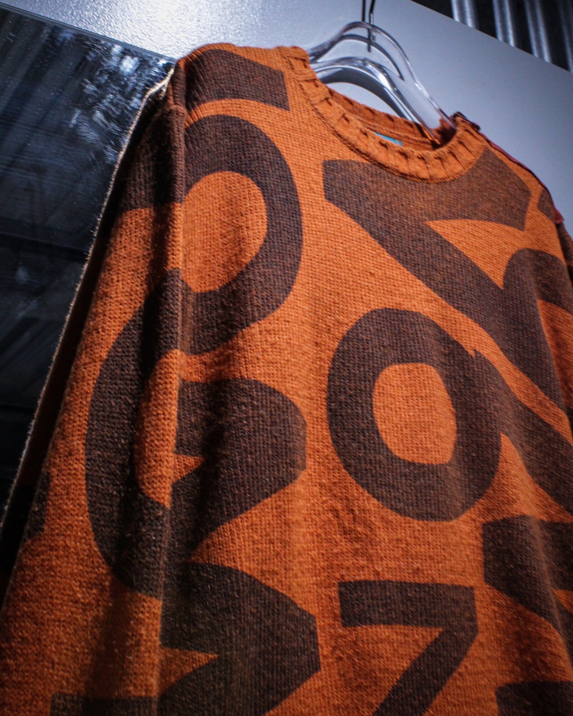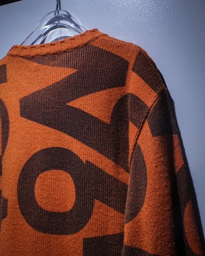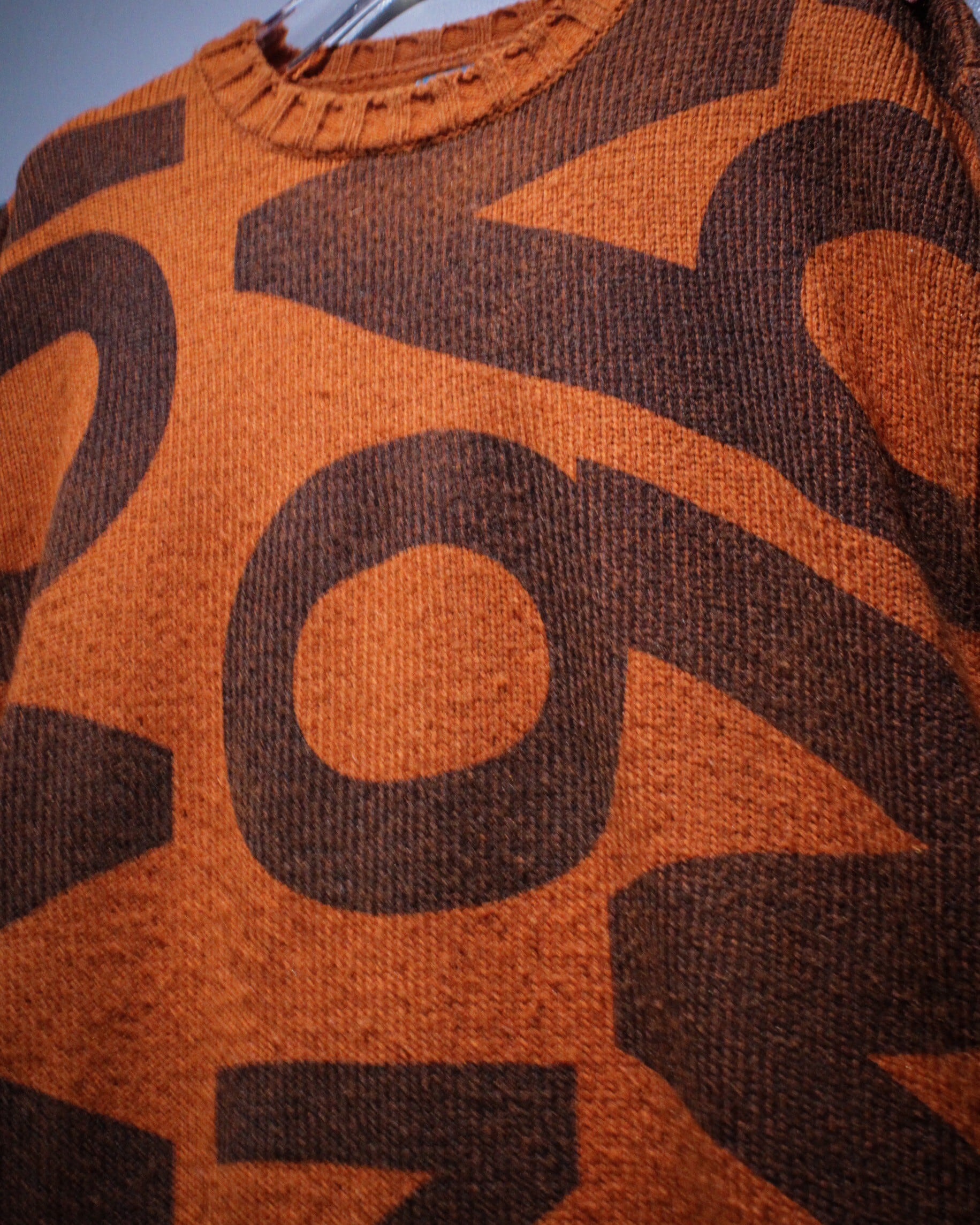 パキッと発色の良いオレンジカラーのニット素材をベースに、茶色のレタリングが全面に施されたプルオーバーニット。