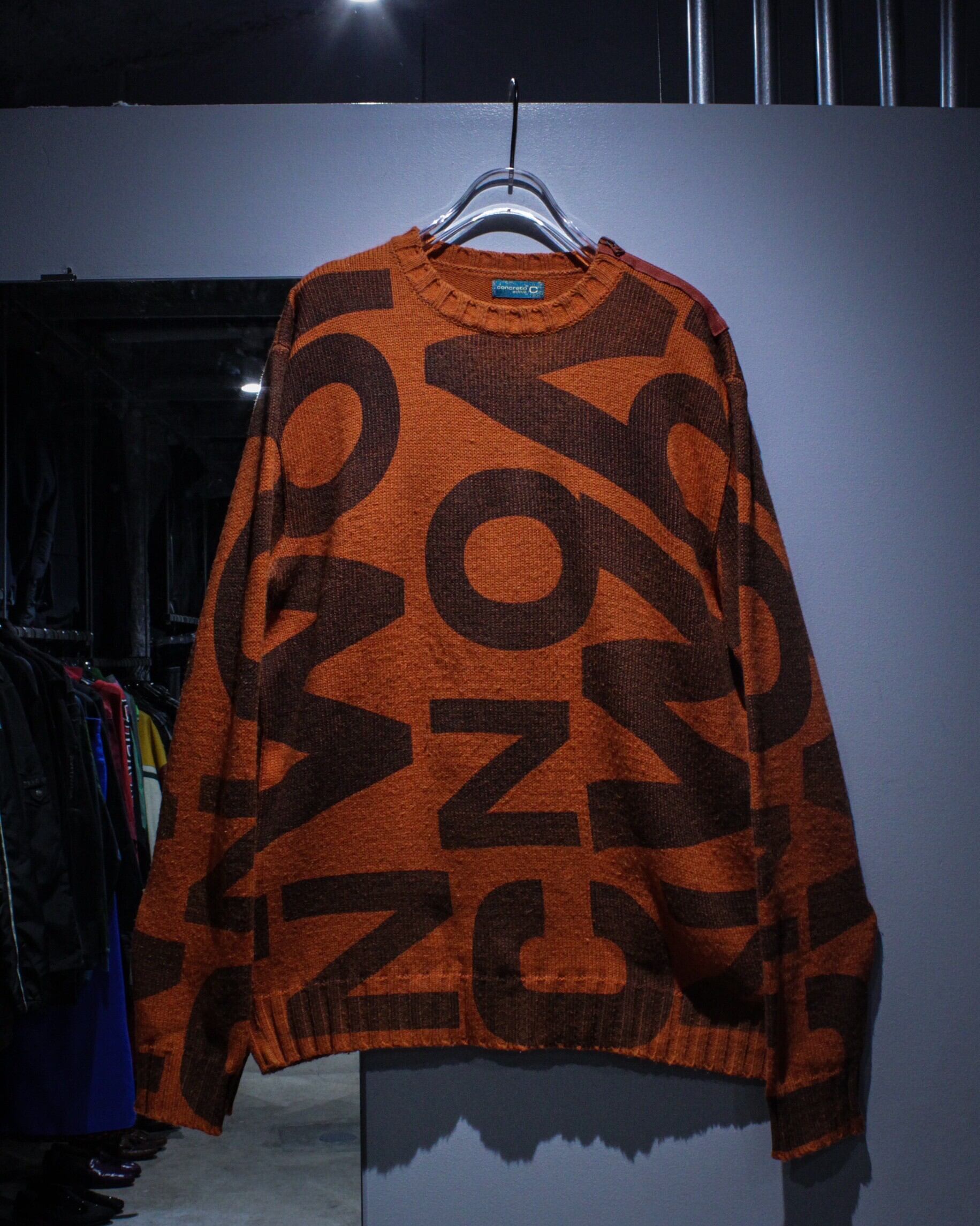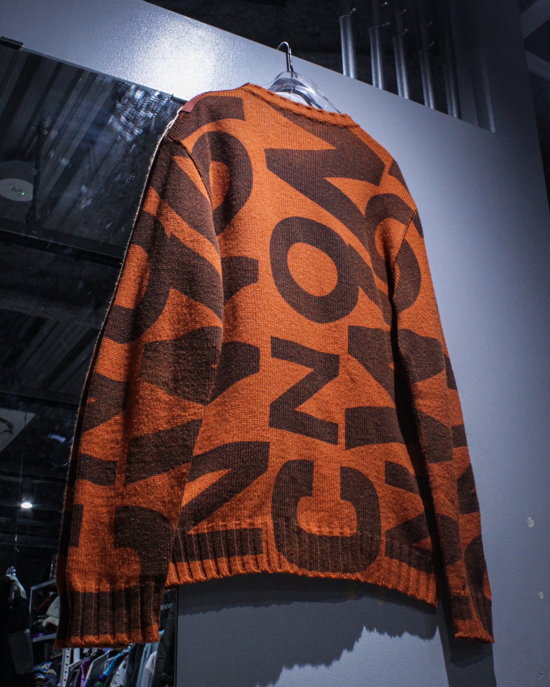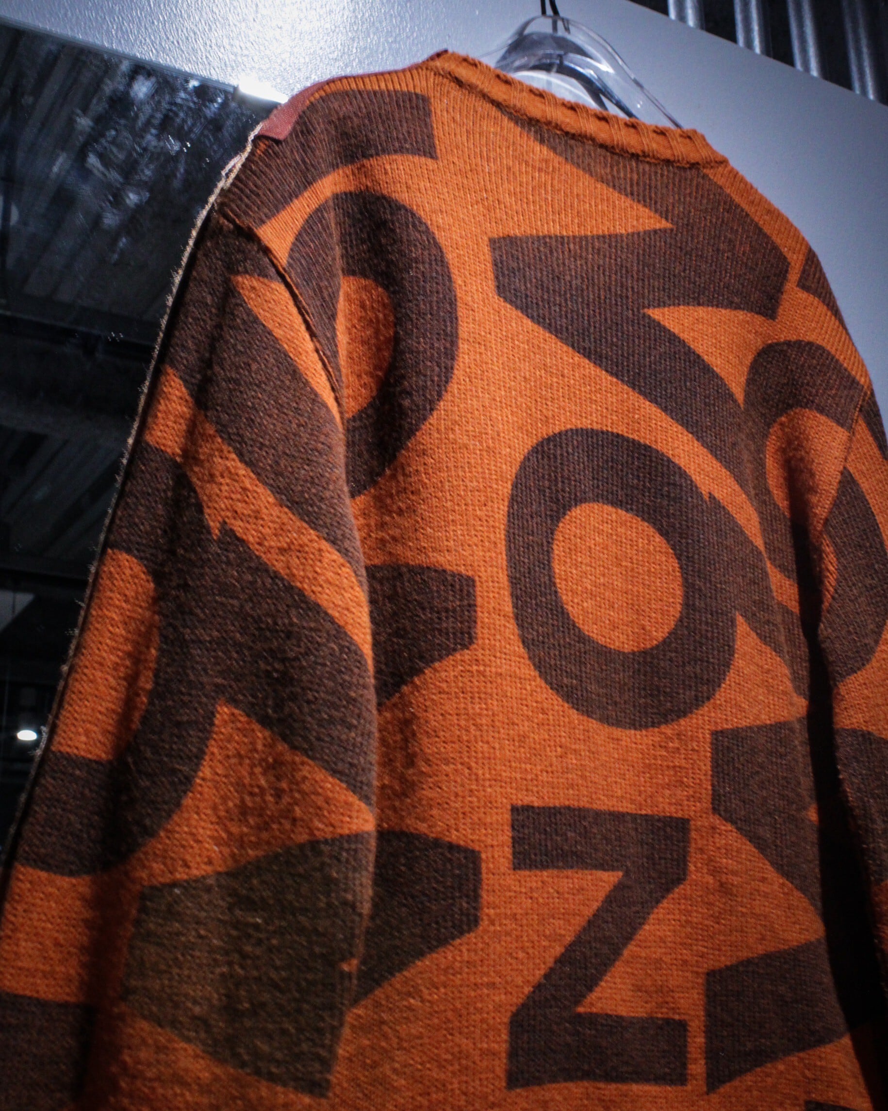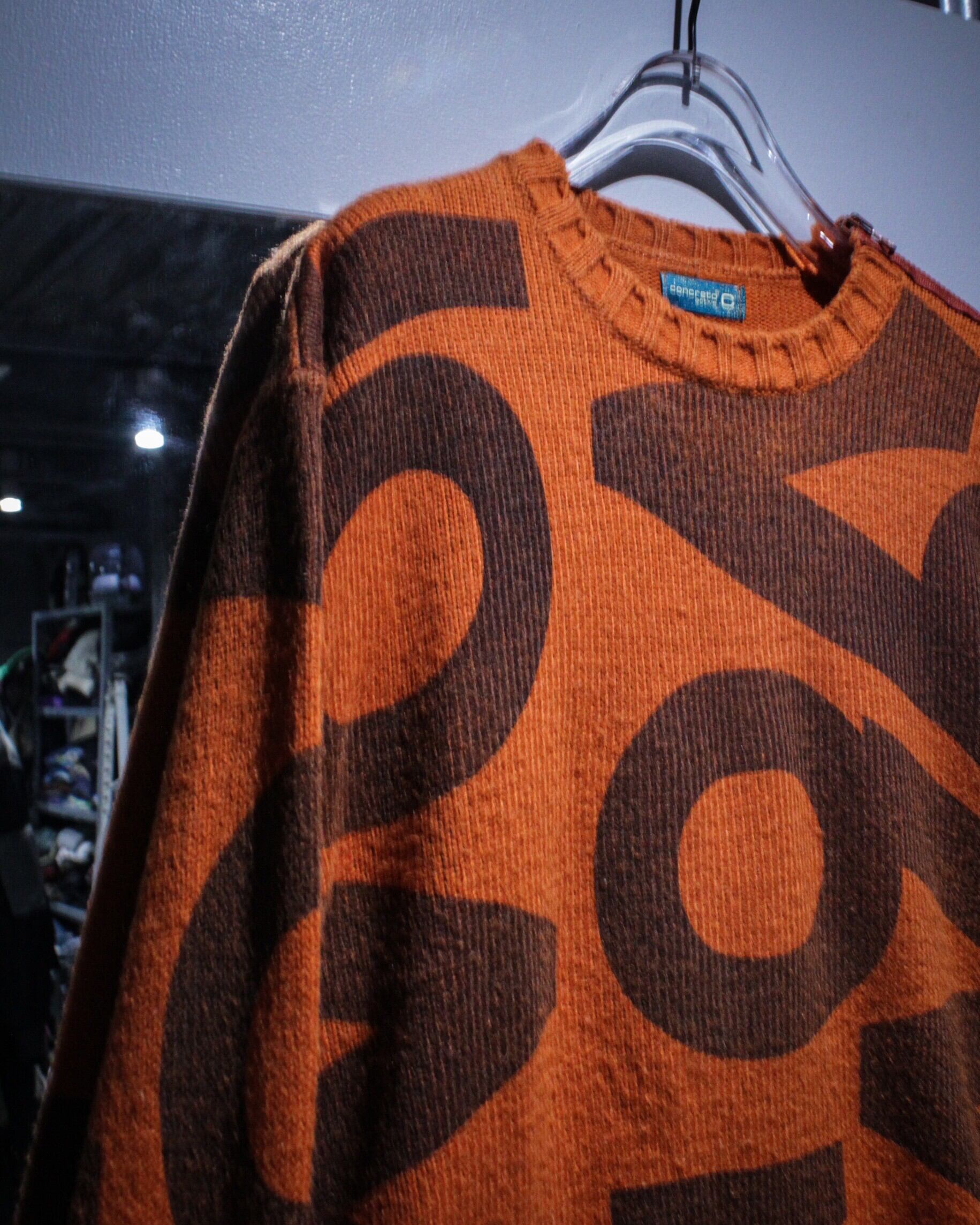 パキッと発色の良いオレンジカラーのニット素材をベースに、茶色のレタリングが全面に施されたプルオーバーニット。