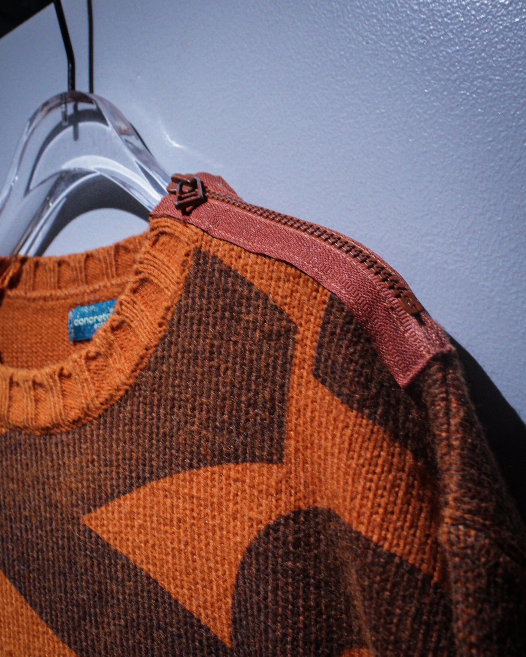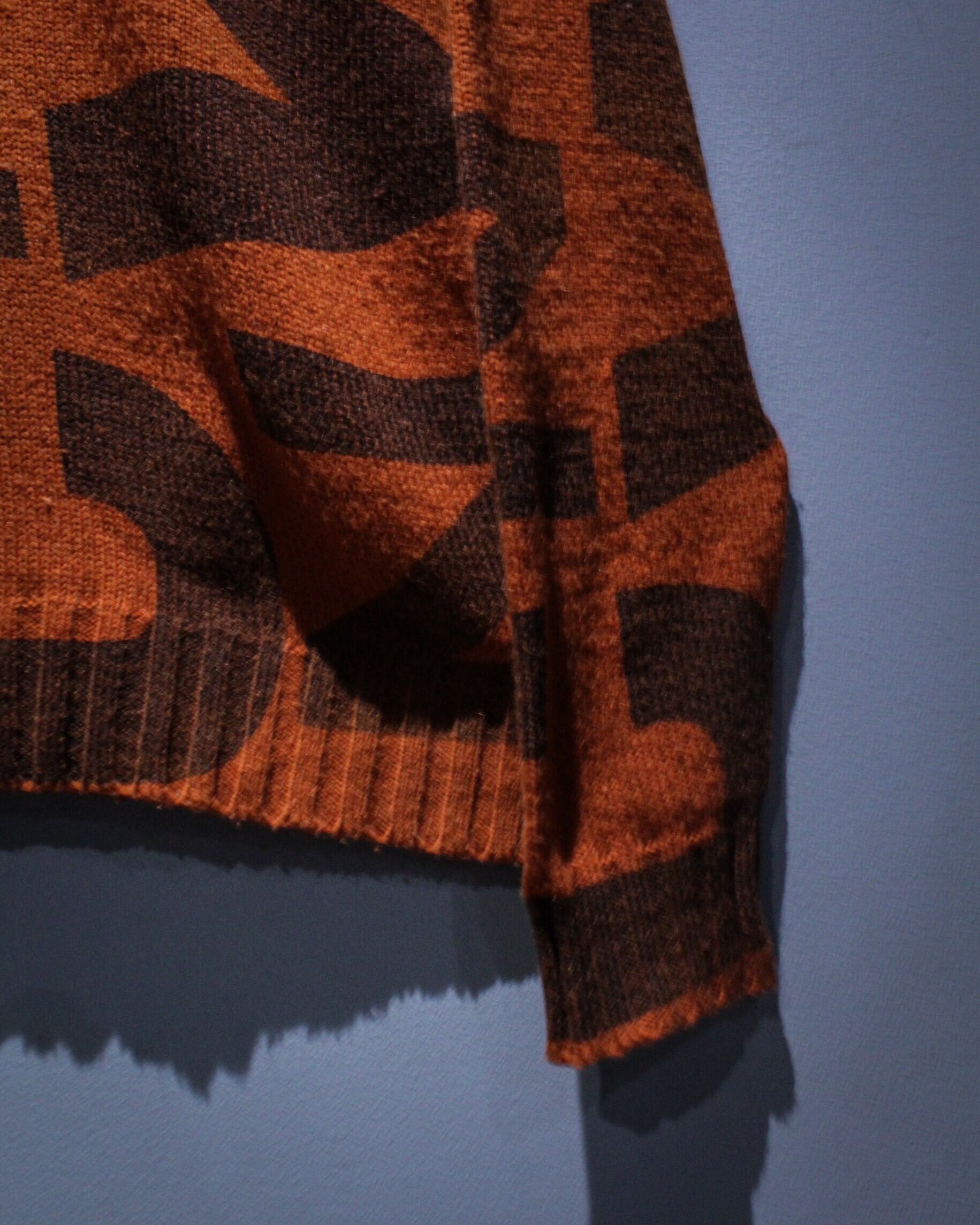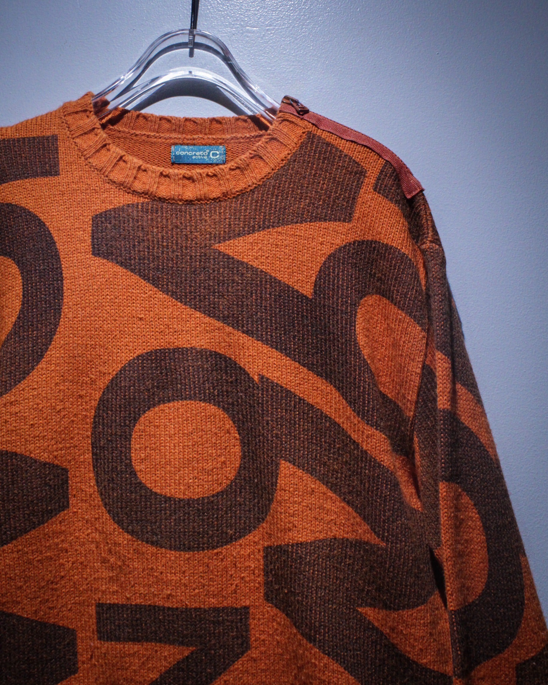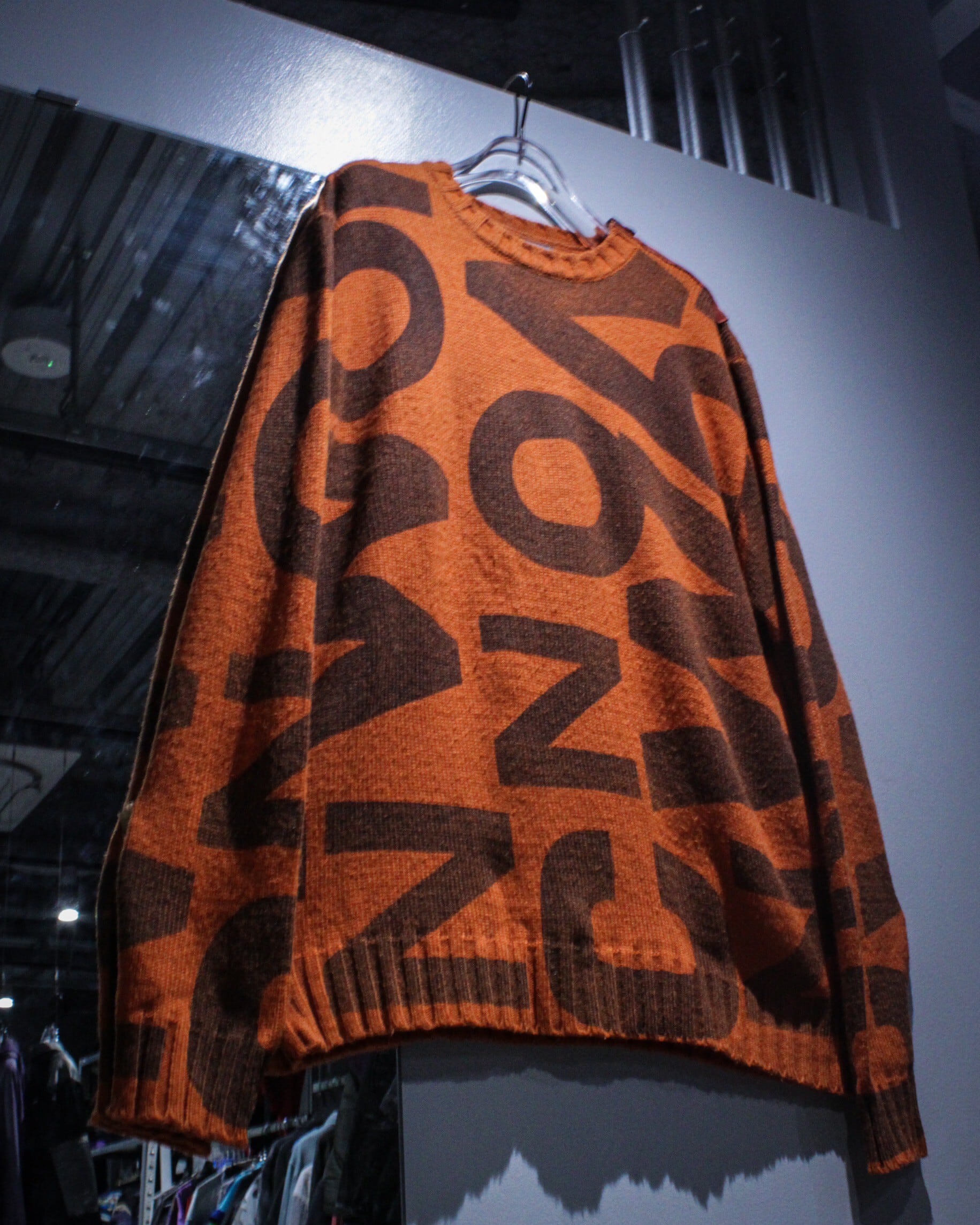 パキッと発色の良いオレンジカラーのニット素材をベースに、茶色のレタリングが全面に施されたプルオーバーニット。