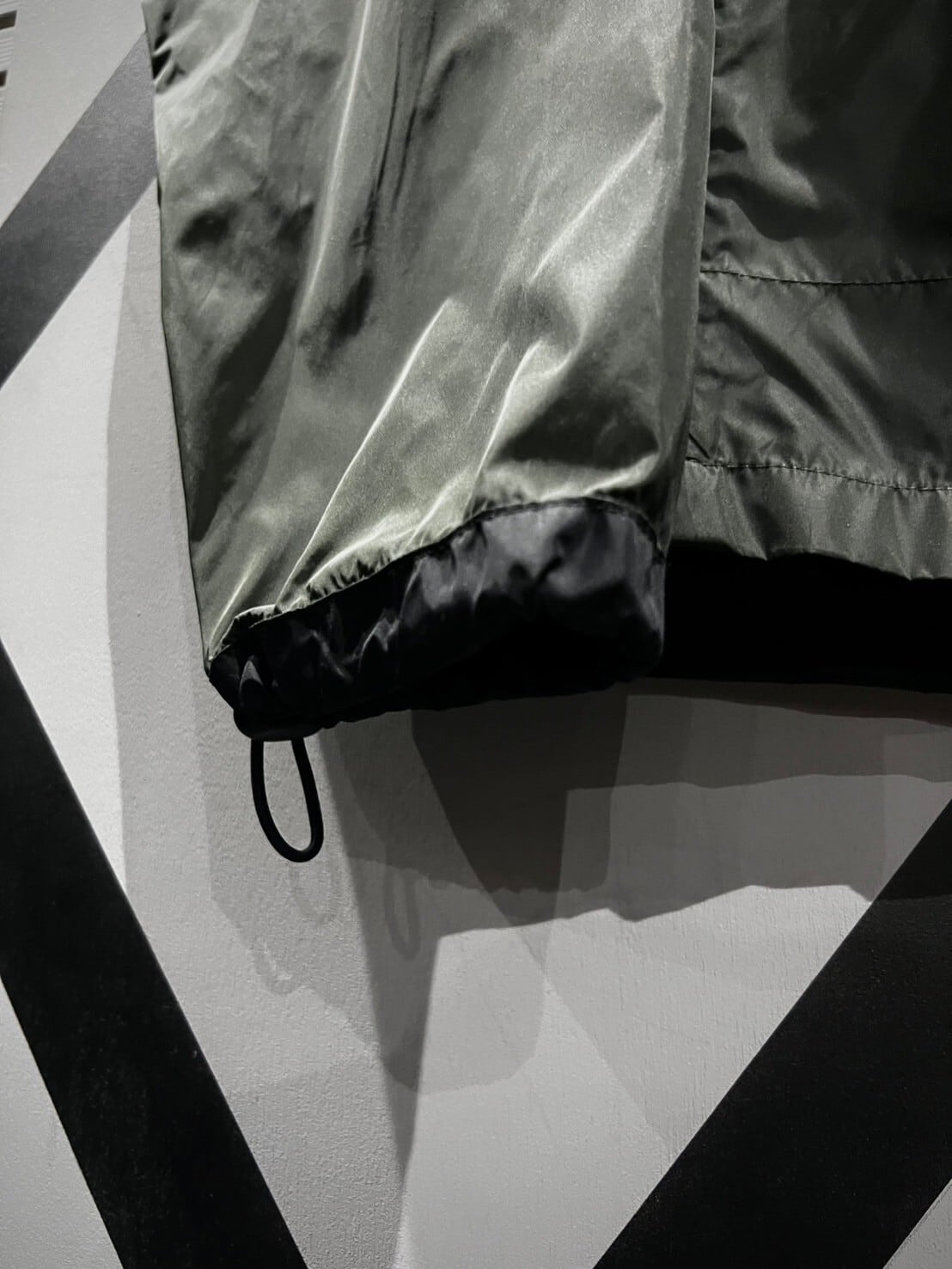 ブラックのナイロンボディをベースに、左アームにはブランドロゴの刺繍、背面にはパイピングやパッチデザインを施した洗練されたデザインの1着。