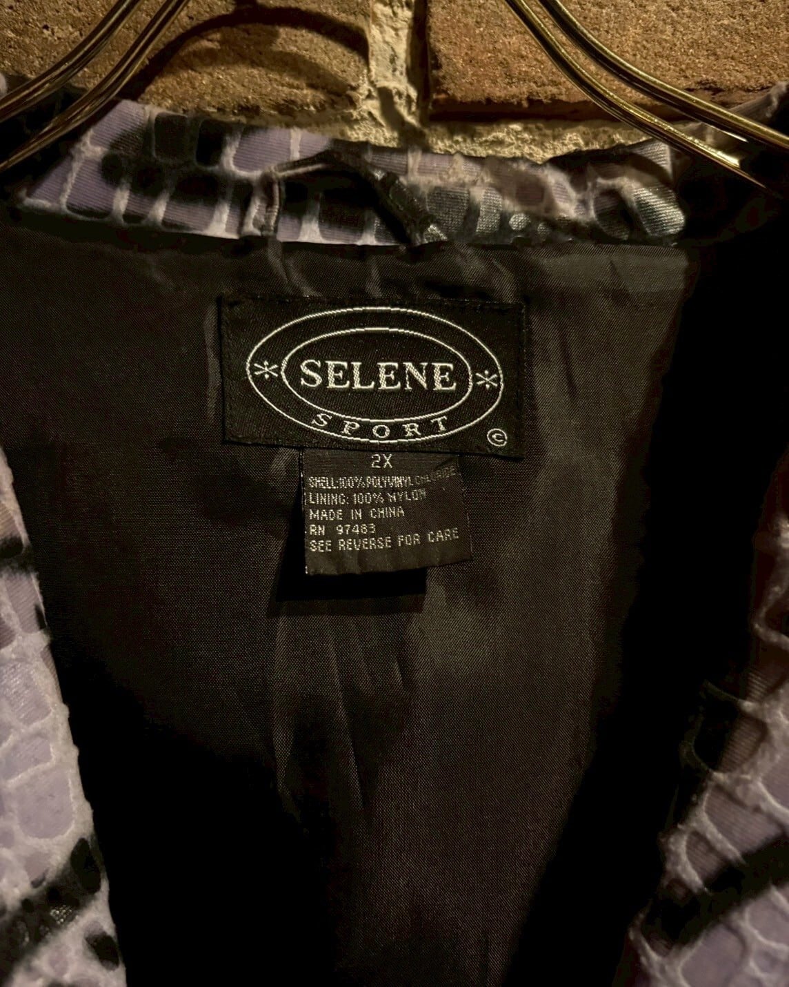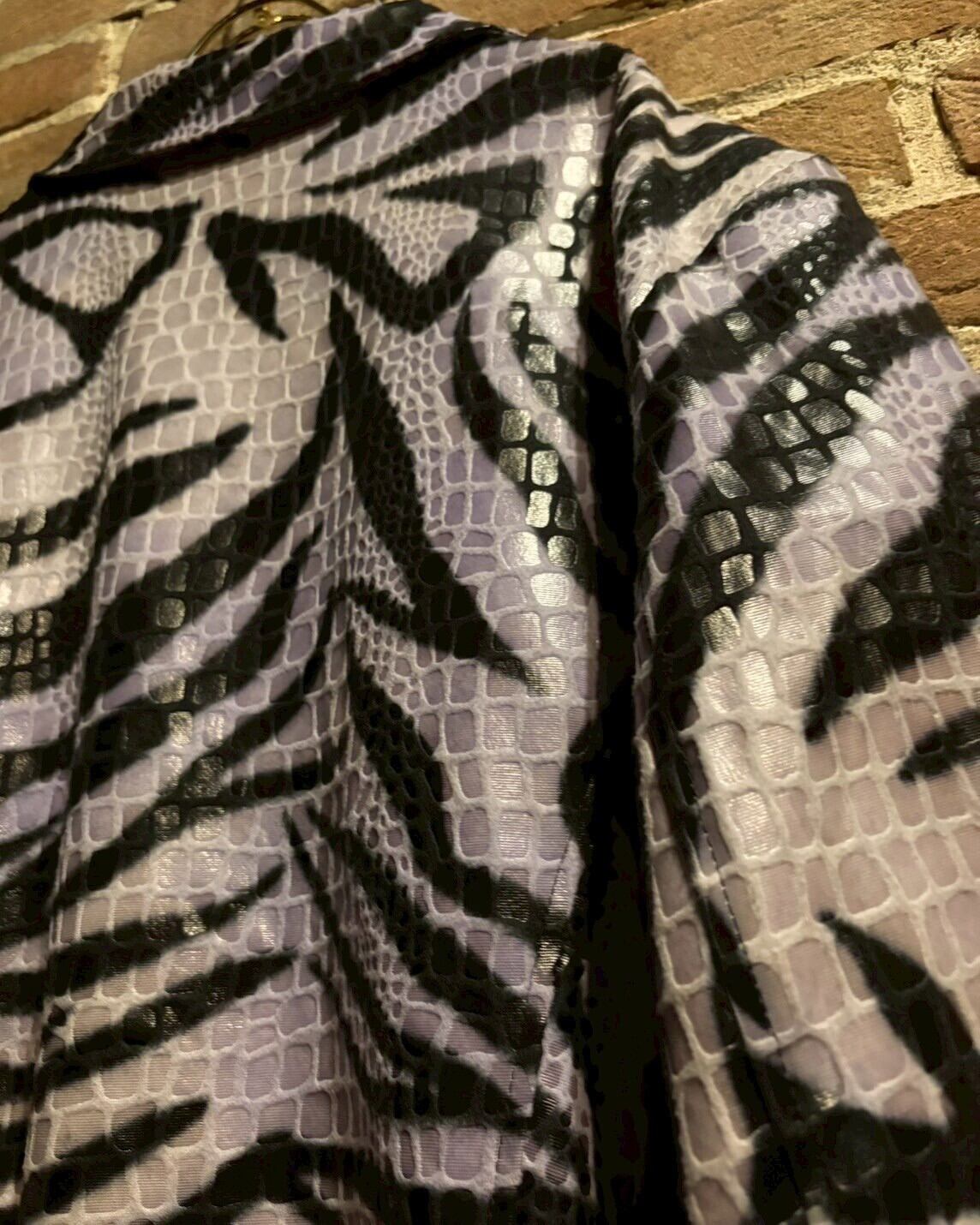 フワッと着用感の軽いシーズンレスなポリエステル素材にタイガーパターンを載せ、その上からウレタンコーティングによってパイソン柄のコーティングを施したジャケット。