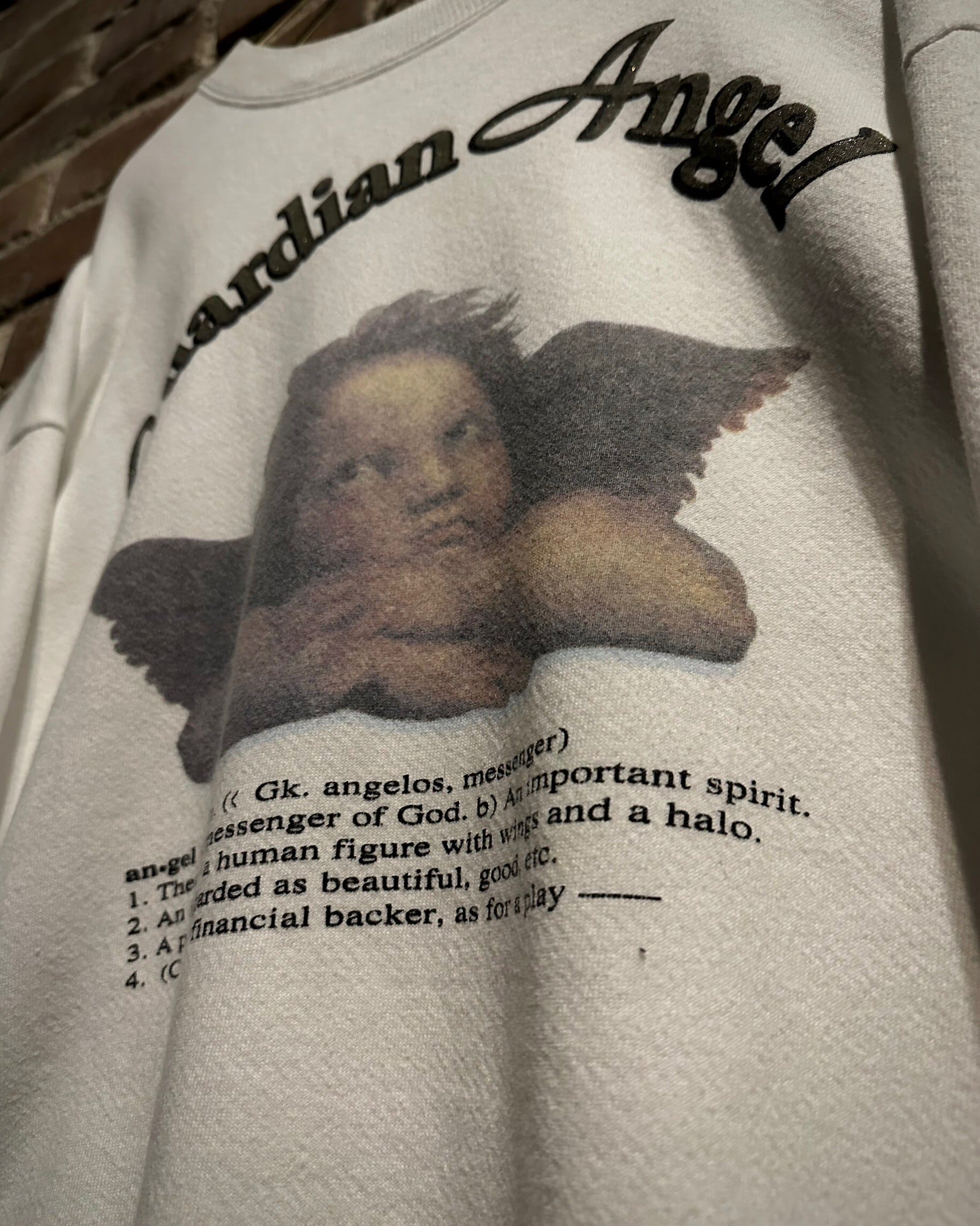 ホワイトのボディをベースに、"Guardian Angel"(守護天使)のデザインをプリントで載せたスウェット。