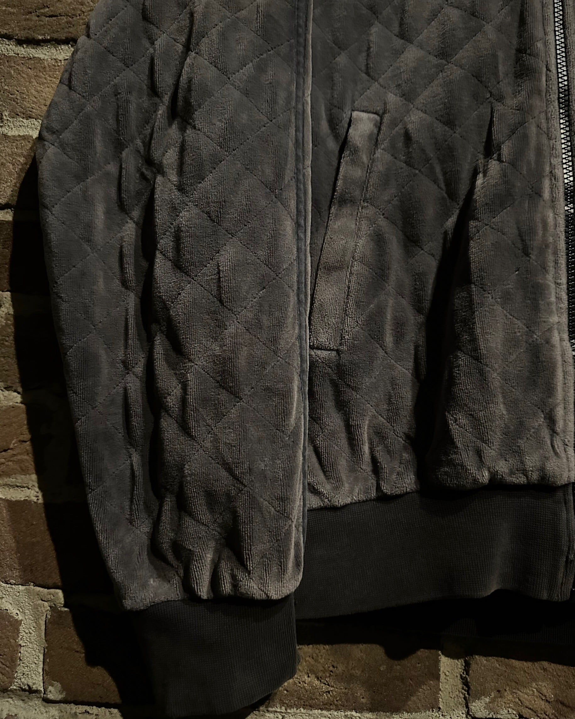 鈍く光沢を放つグレーのキルティングベロアを用いたトラックジャケット。同ブランドのトラックジャケットの中でも異素材モノって中々お目にかかれません。