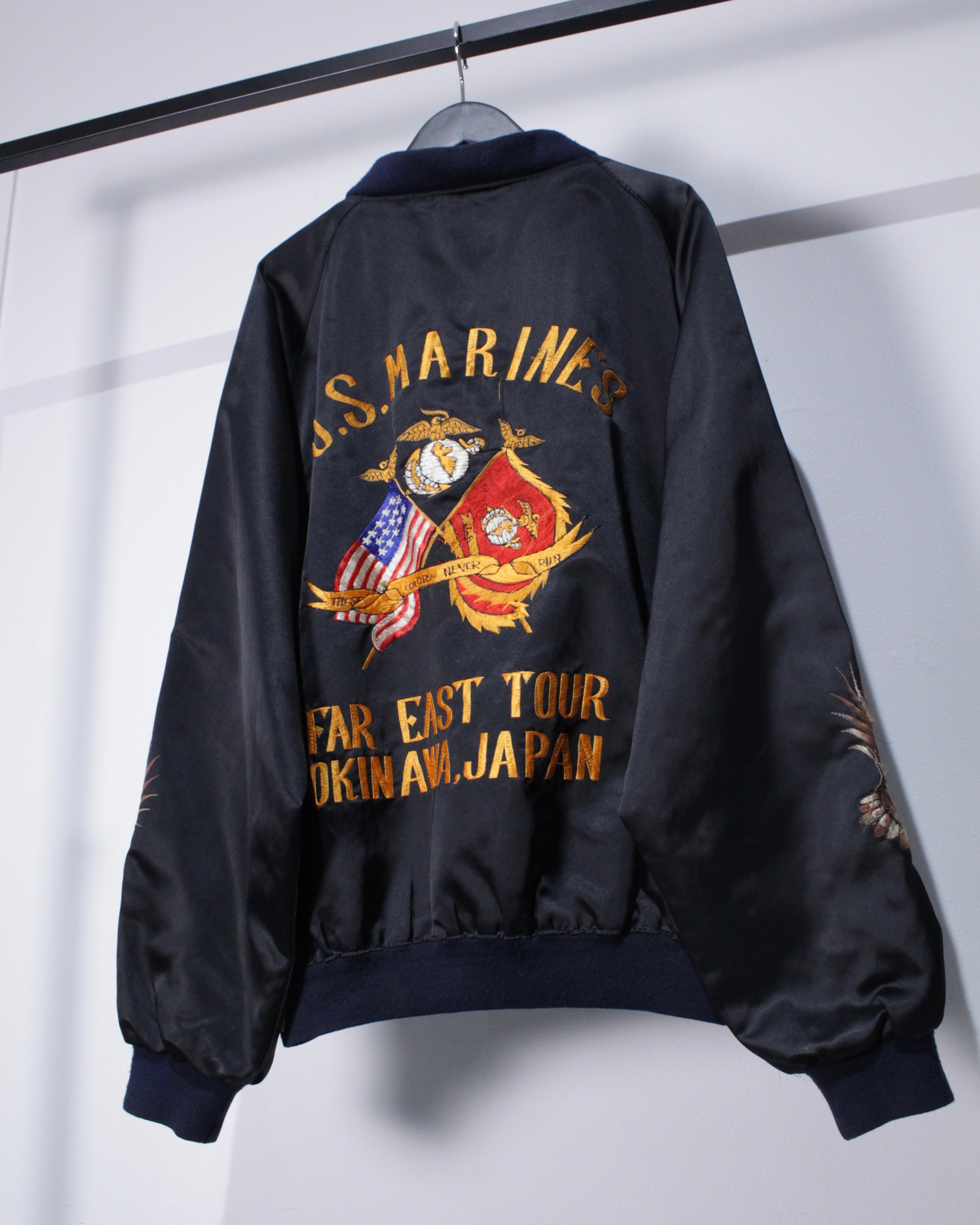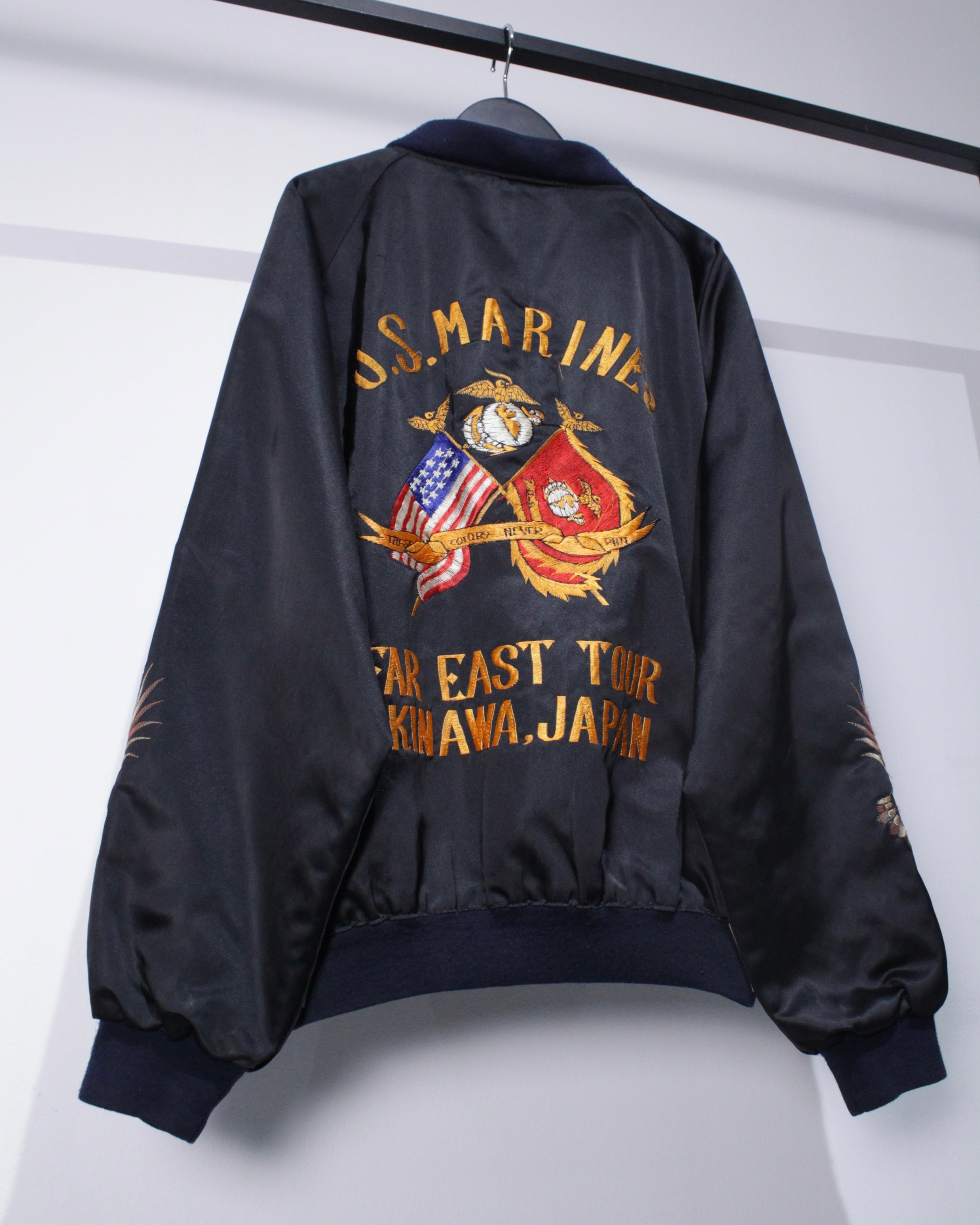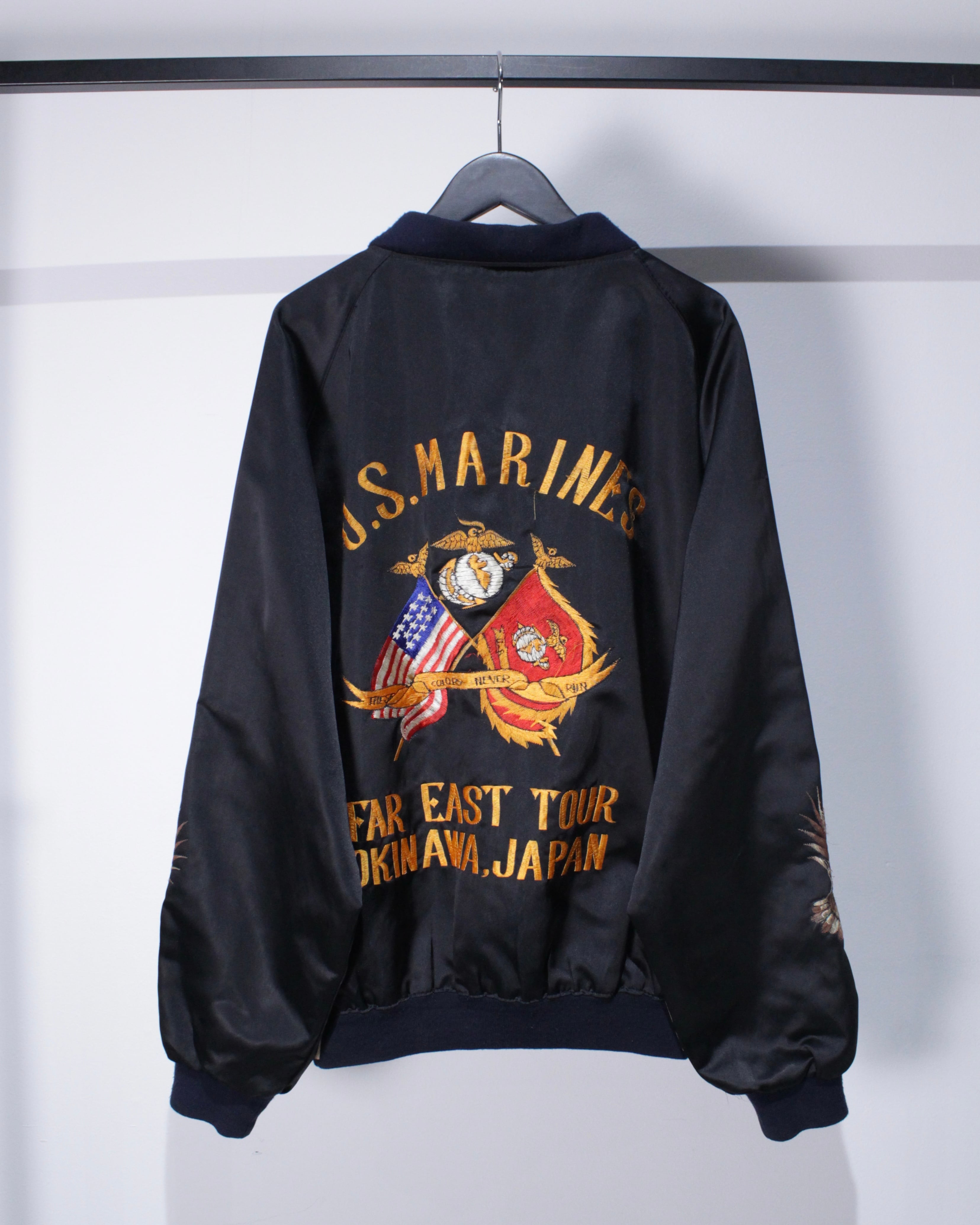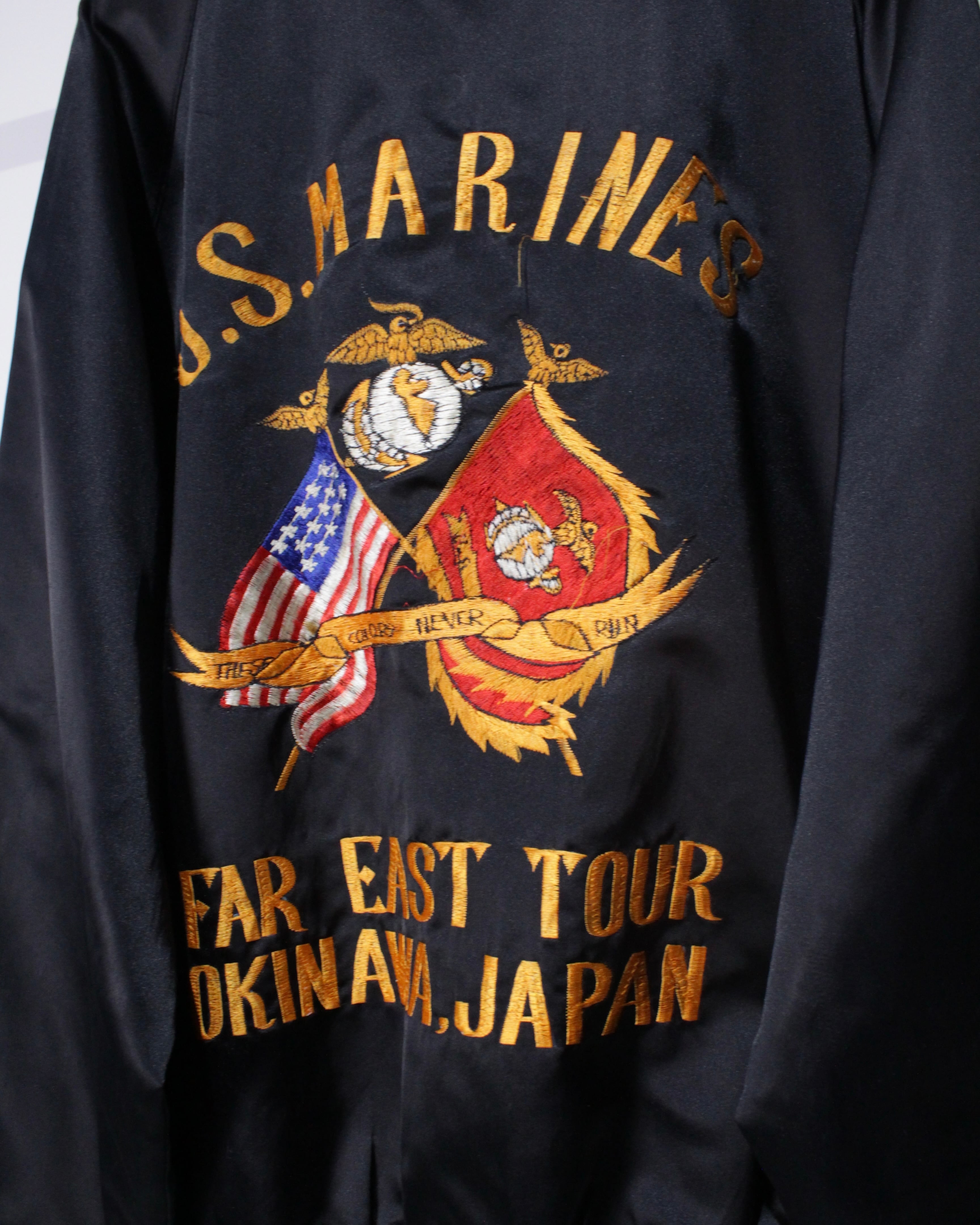 ツルッとした特有の光沢を帯びた素材のボディをベースに、背面にU.S MARINESとOKINAWA JAPANの文字を刺繍によって施したデザインの1着。