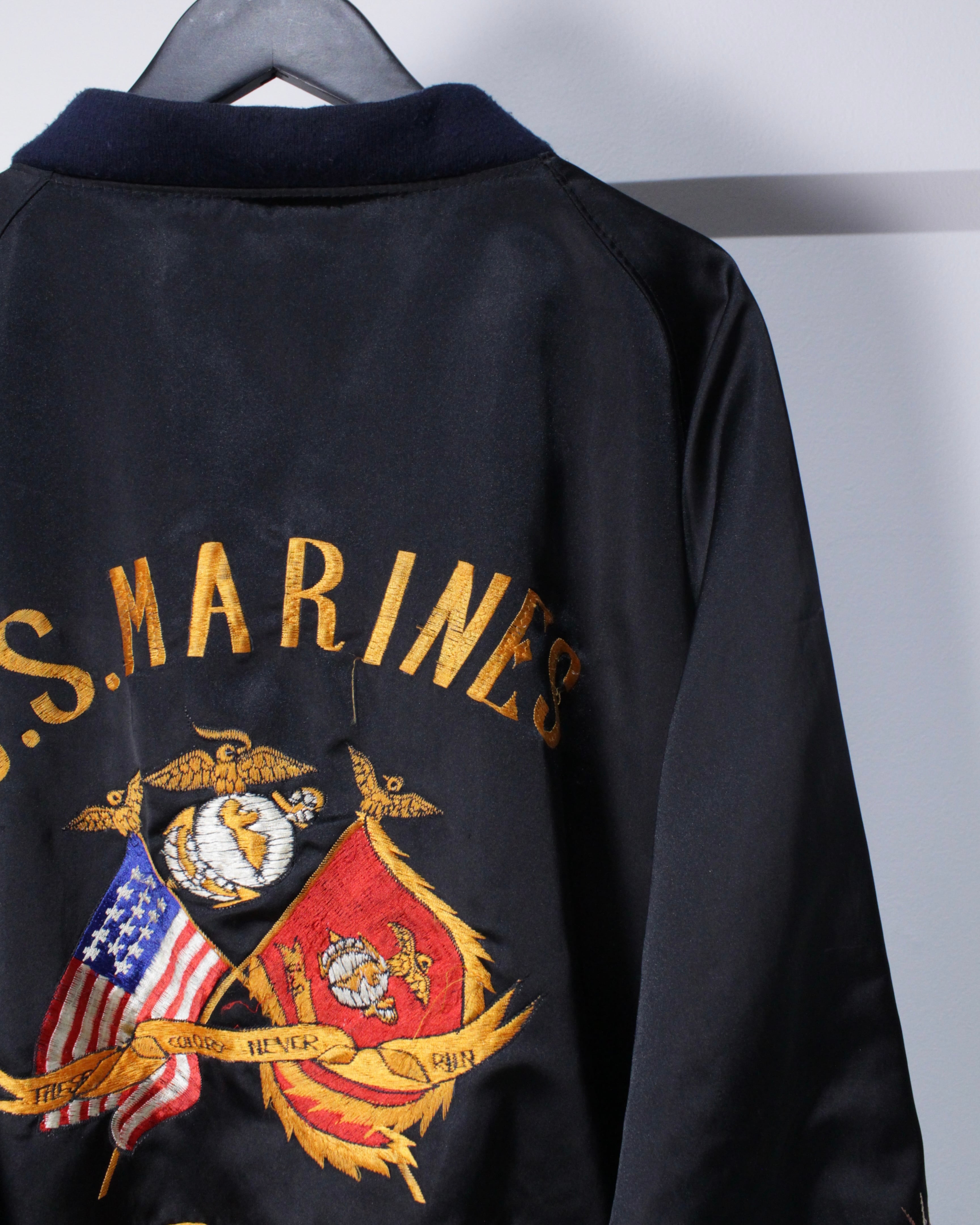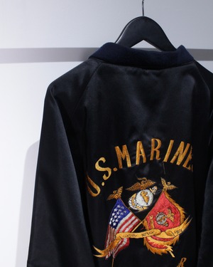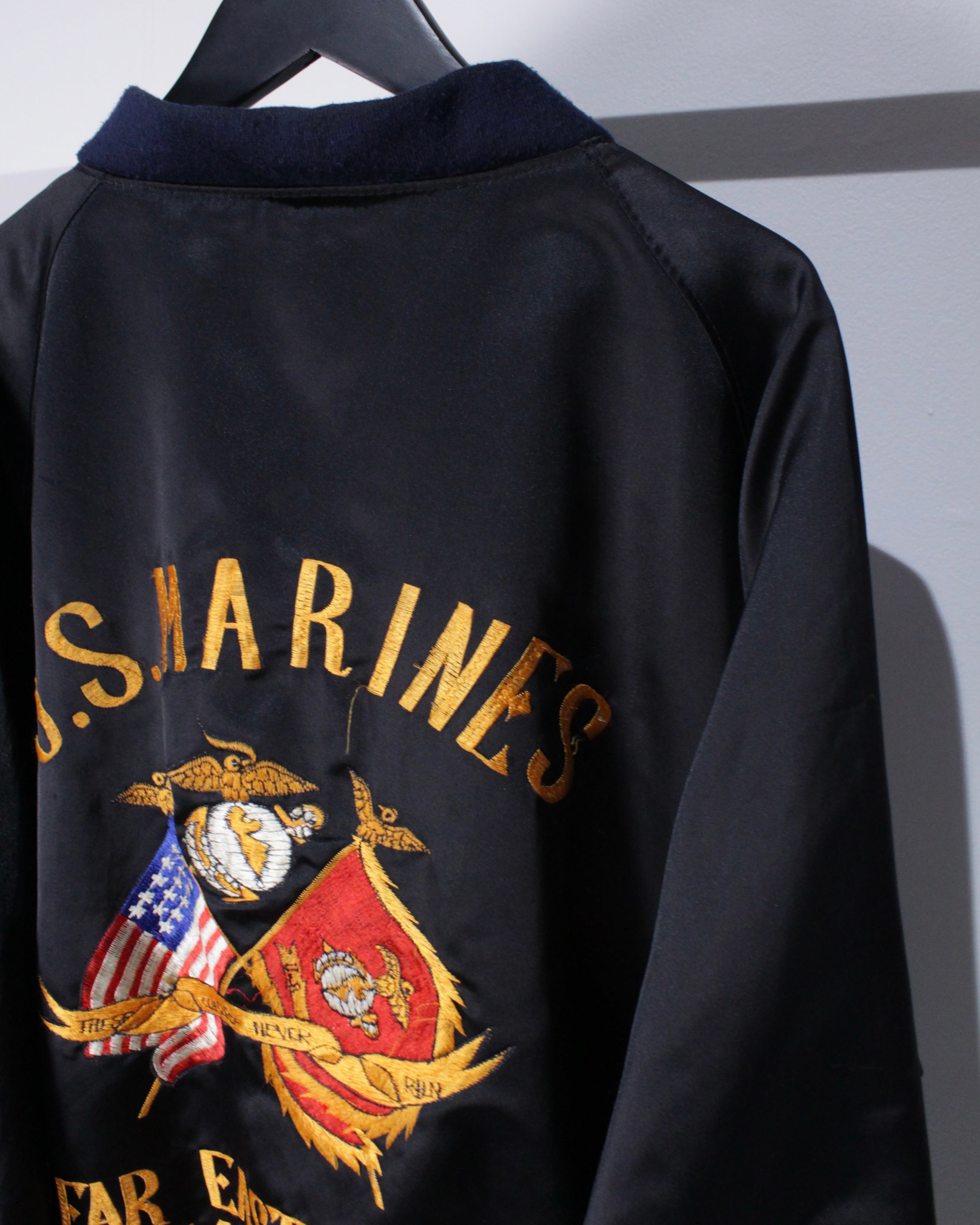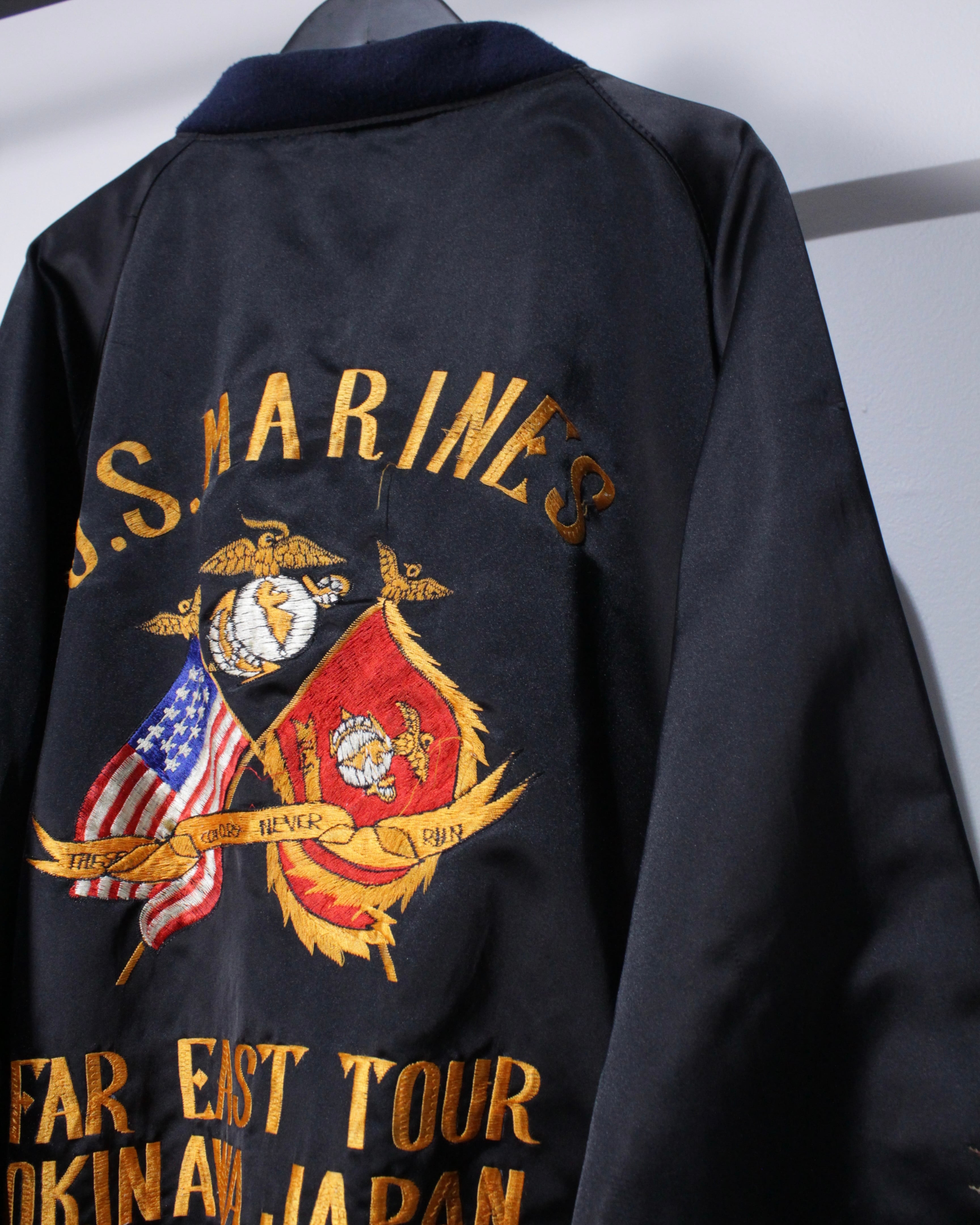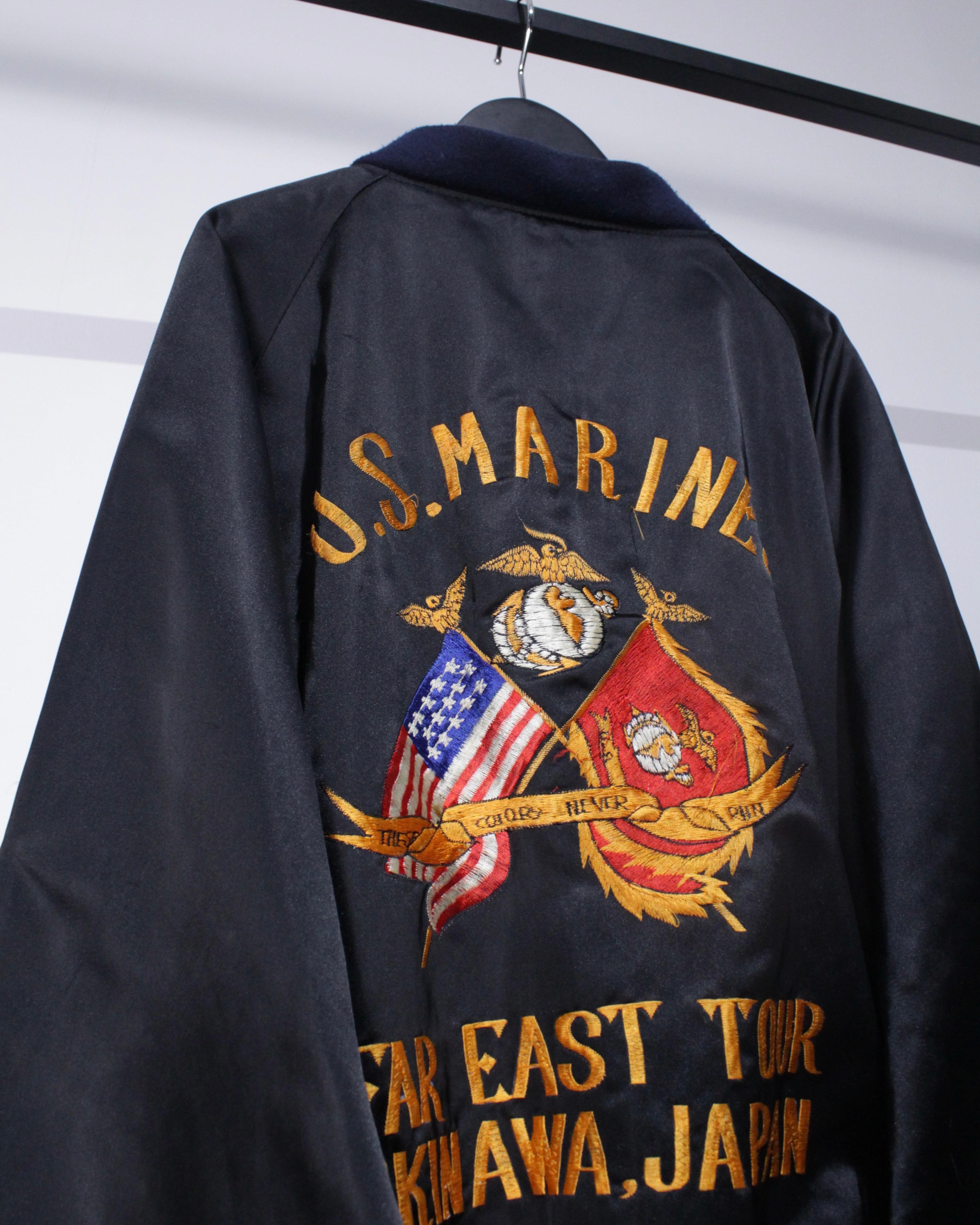 ツルッとした特有の光沢を帯びた素材のボディをベースに、背面にU.S MARINESとOKINAWA JAPANの文字を刺繍によって施したデザインの1着。