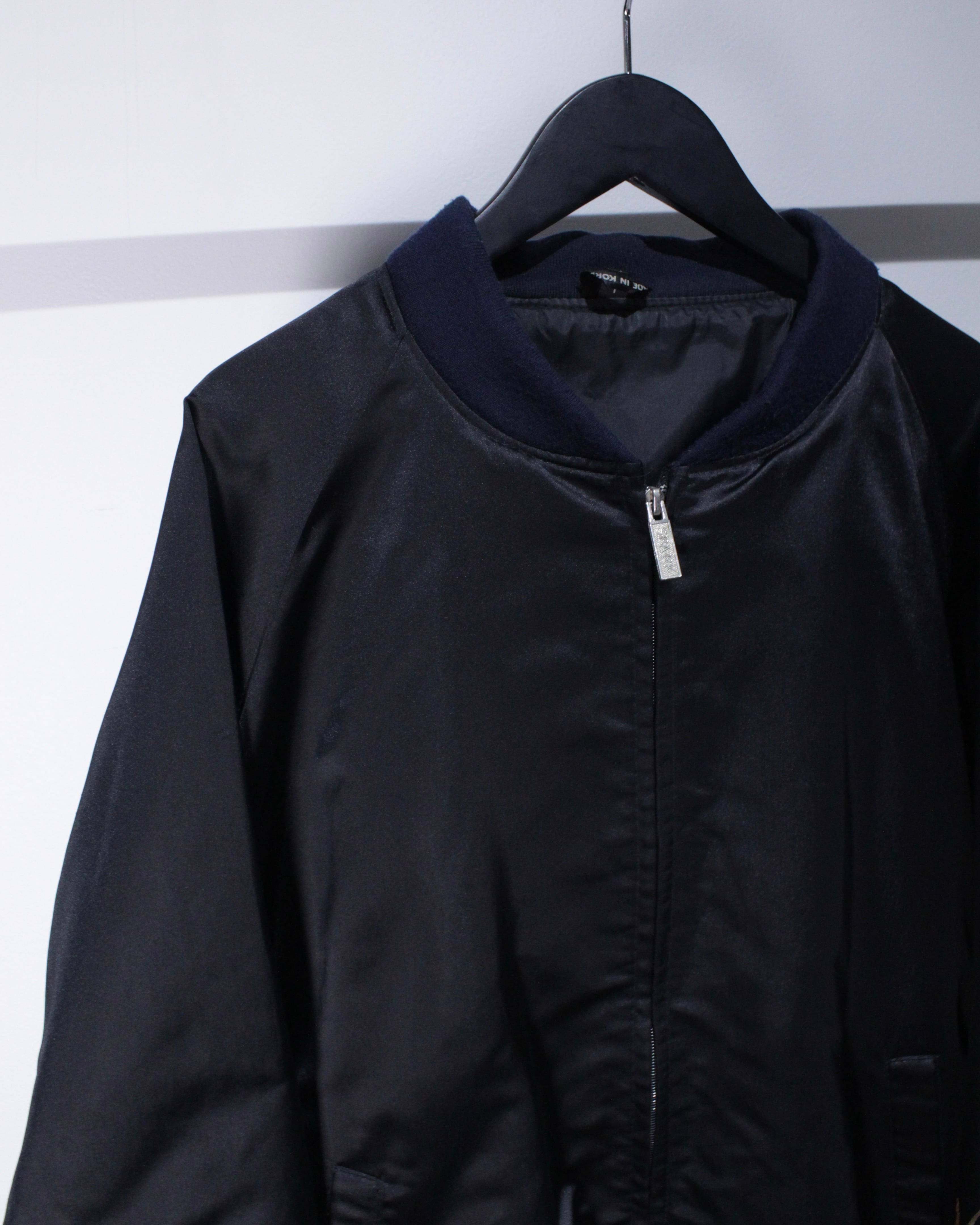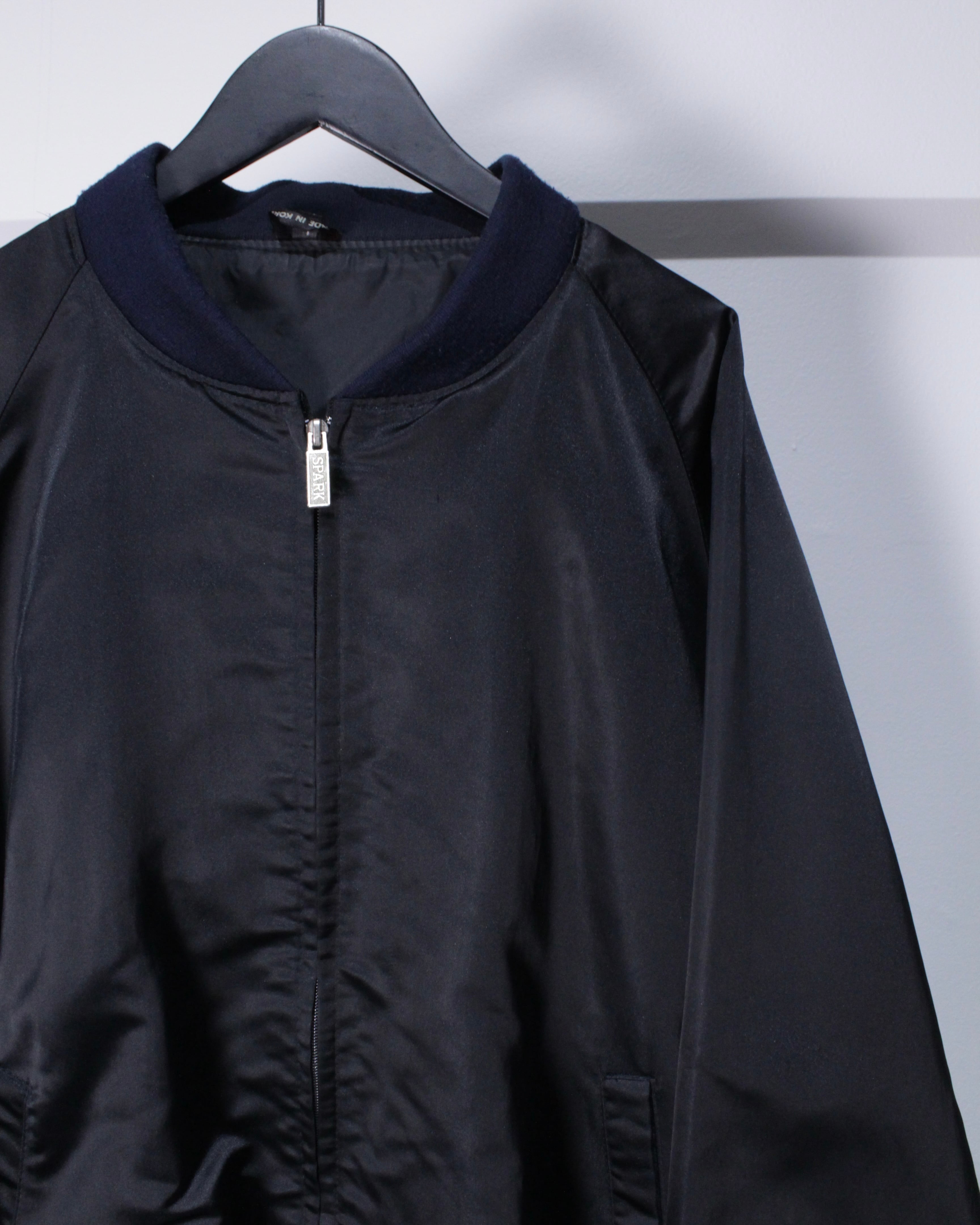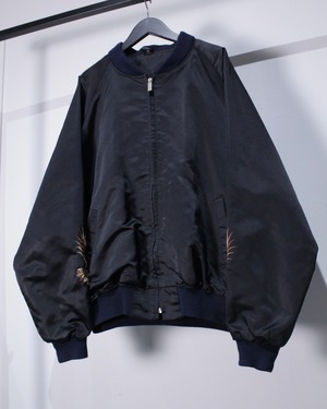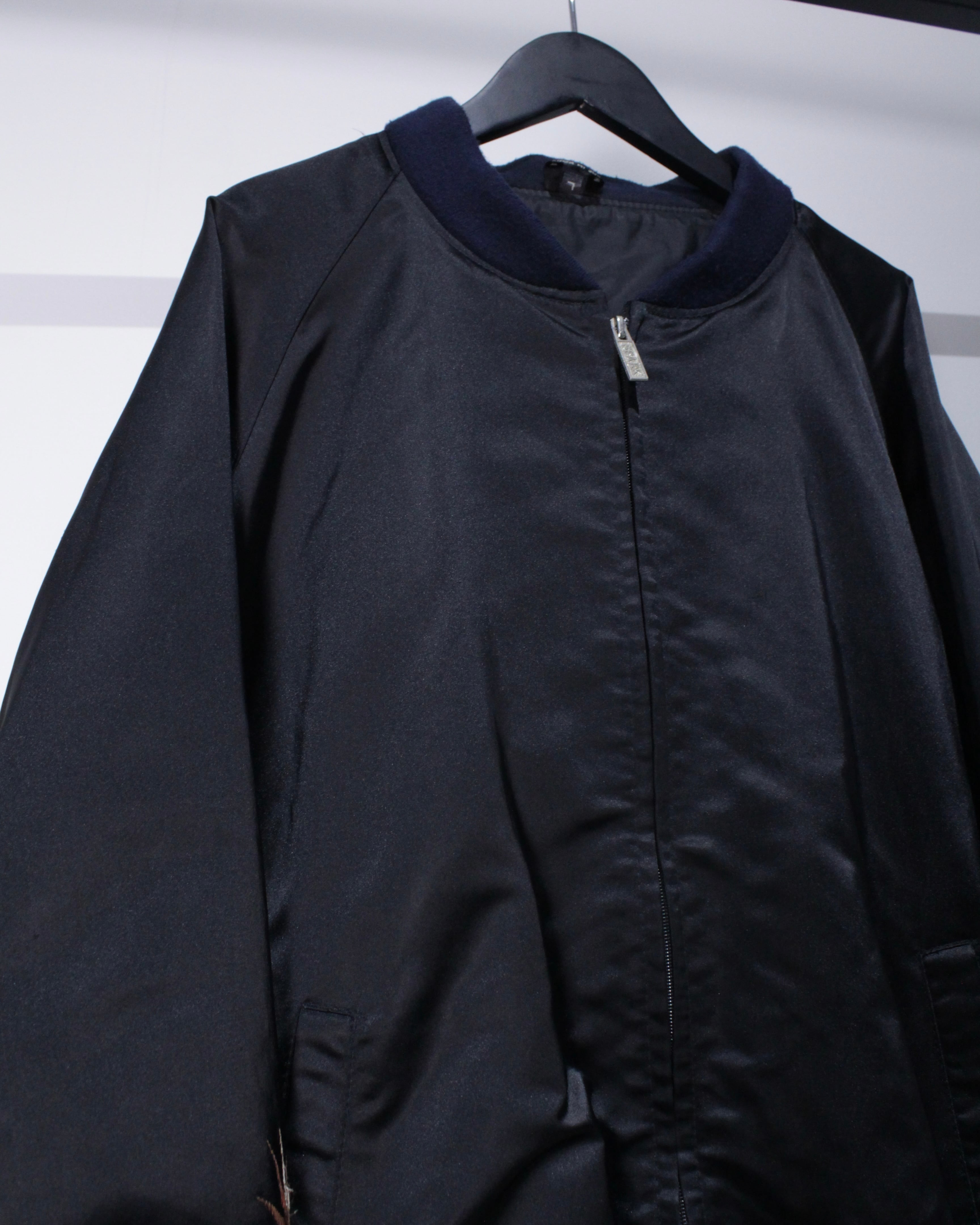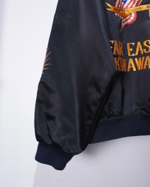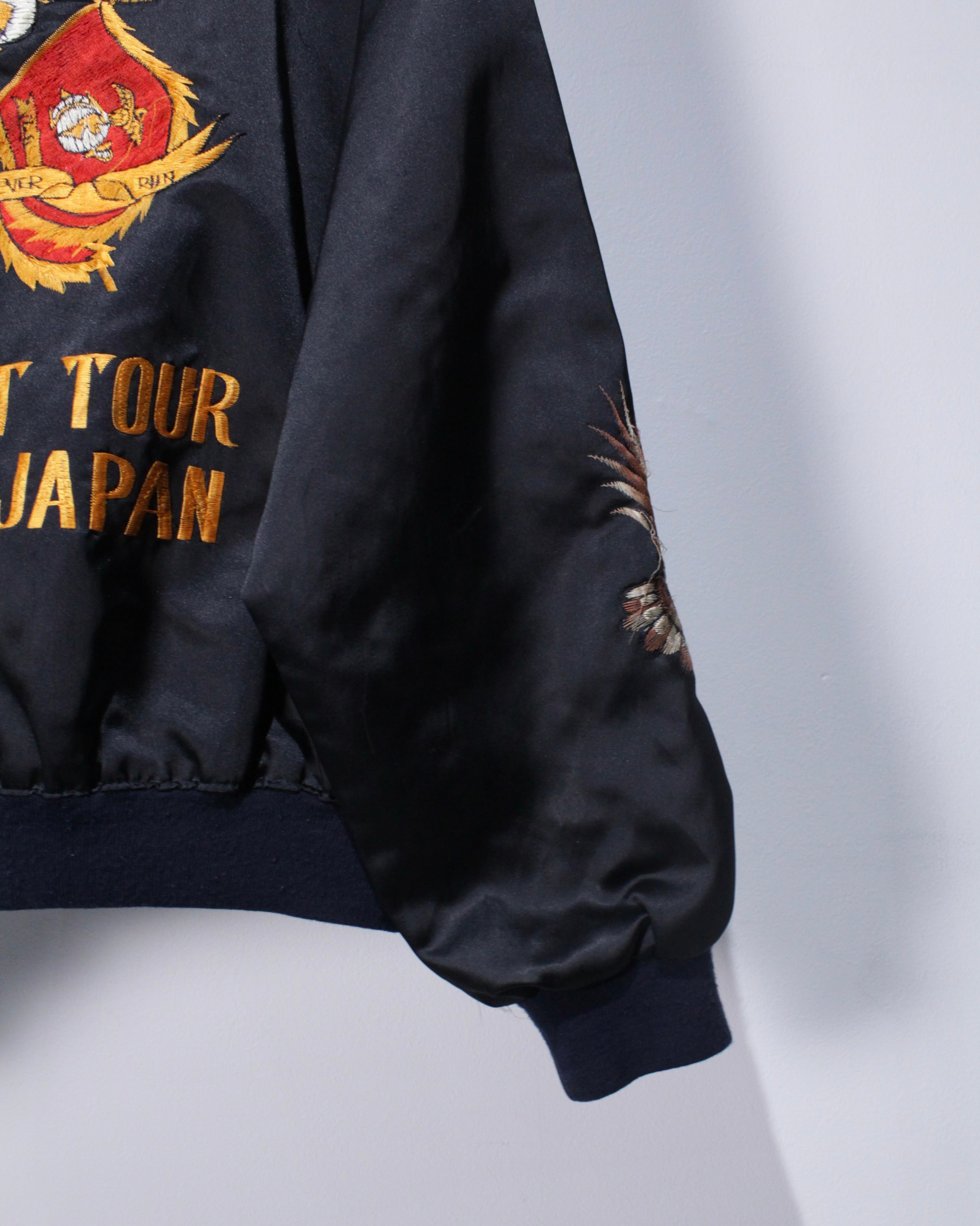 ツルッとした特有の光沢を帯びた素材のボディをベースに、背面にU.S MARINESとOKINAWA JAPANの文字を刺繍によって施したデザインの1着。