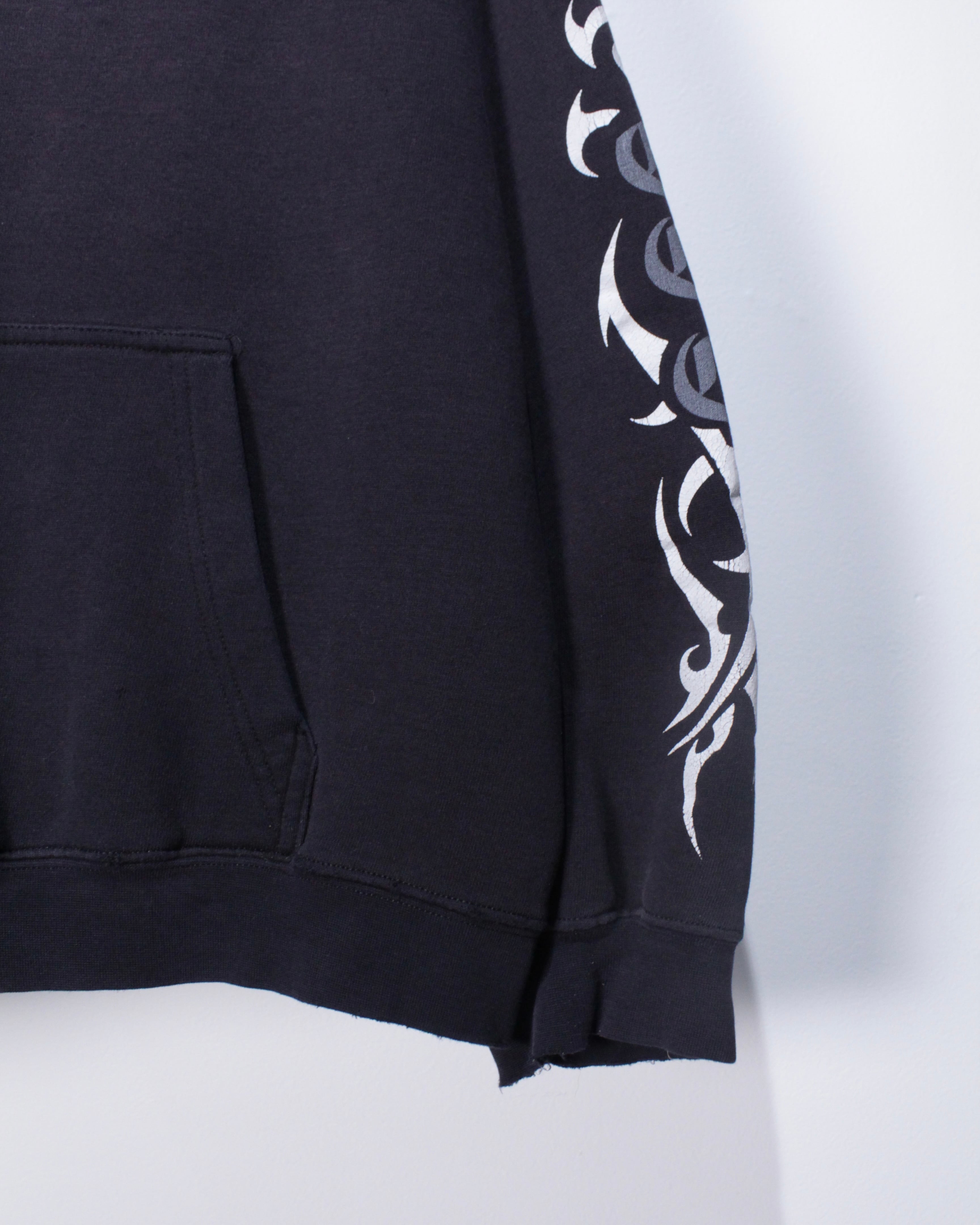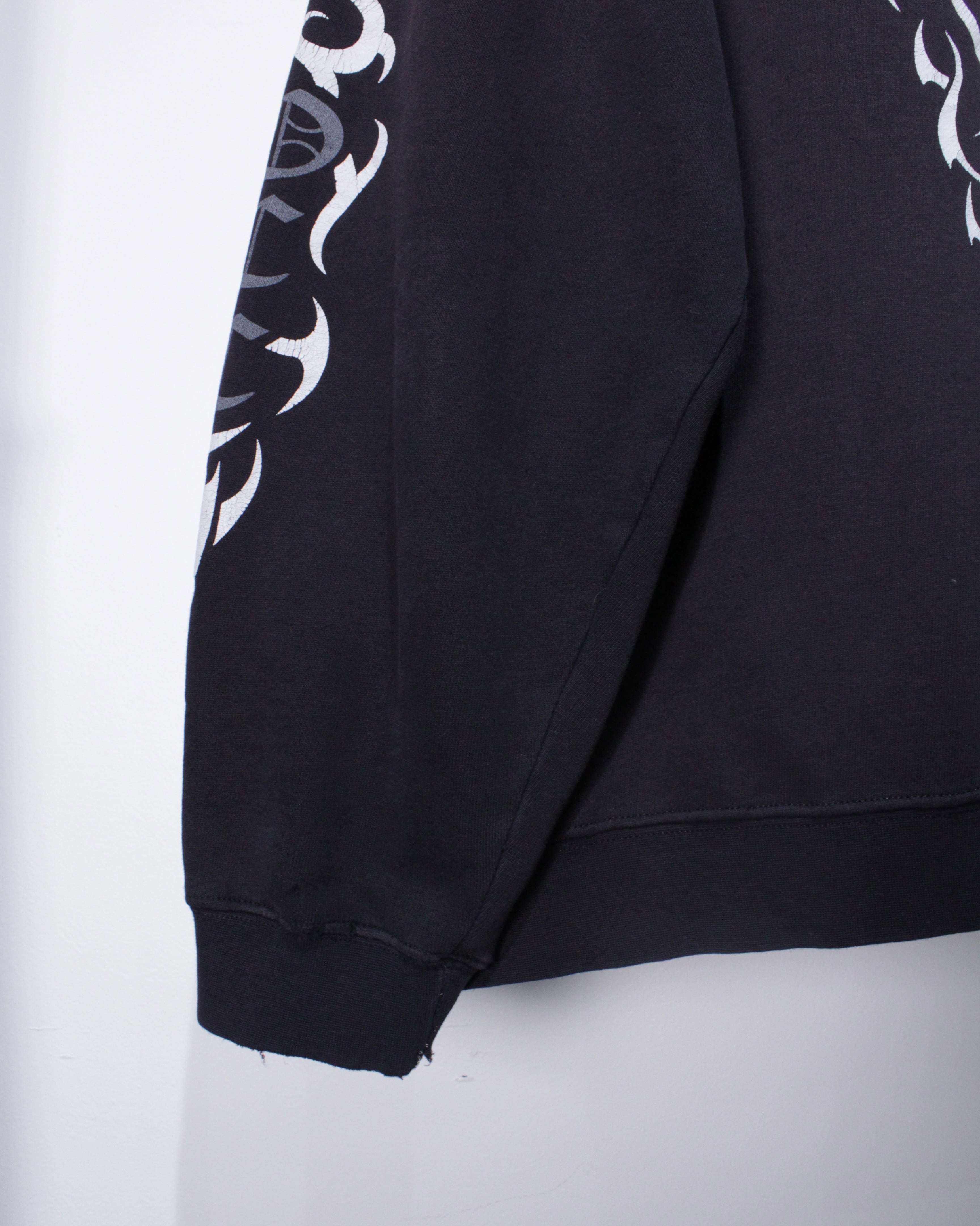 ブラックのスウェット地のボディに、メーカーネームとチョッパーのバイクをプリントによって施したスウェットフーディー。フェードの効いたボディも雰囲気マシマシ。