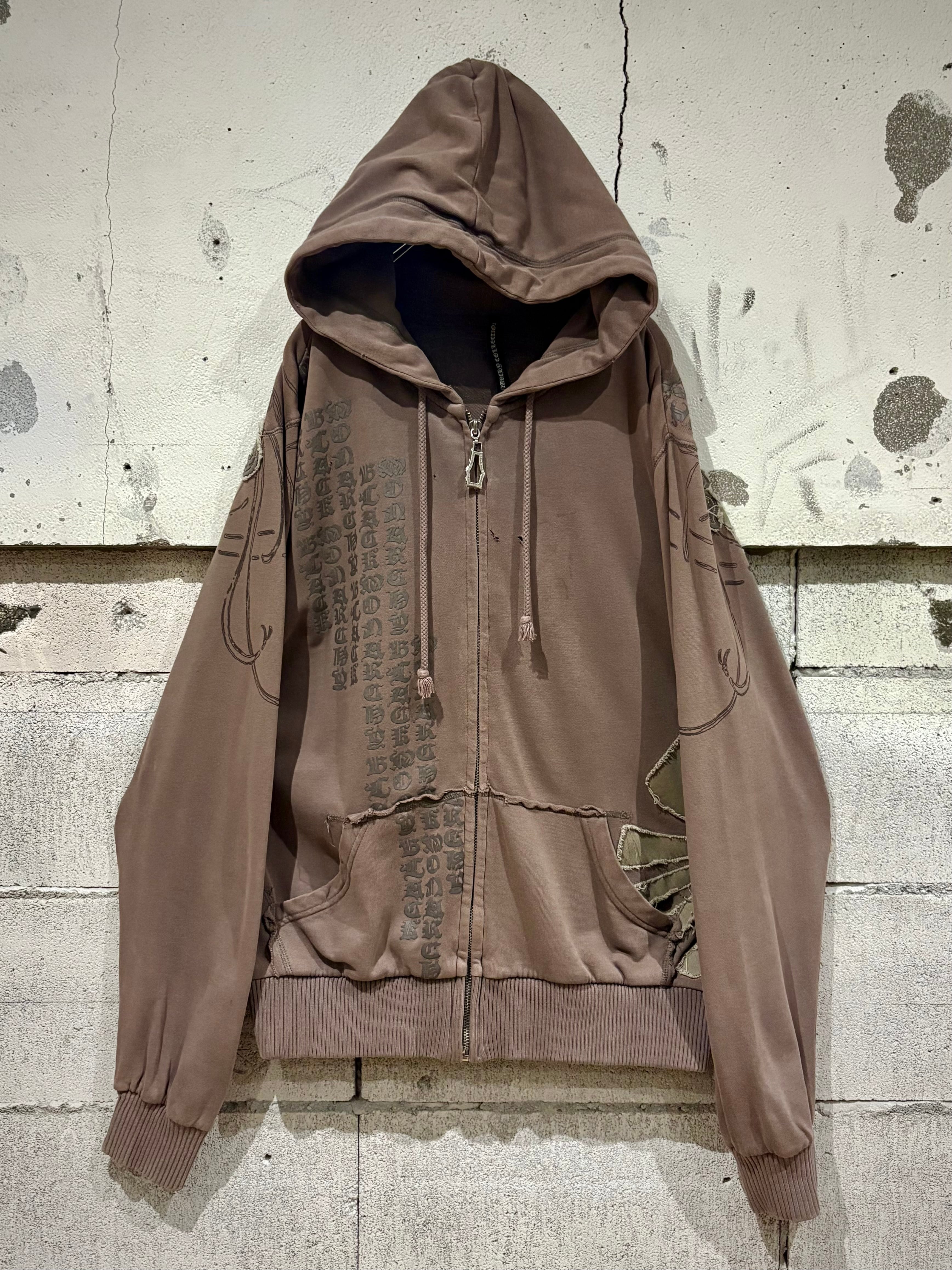 フェードブラウンのボディをベースに、トレンド感のあるゴシックなデザインを載せたジップアップフーディ。