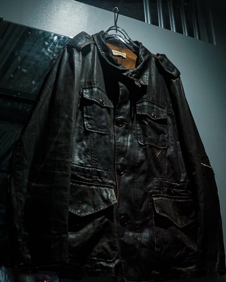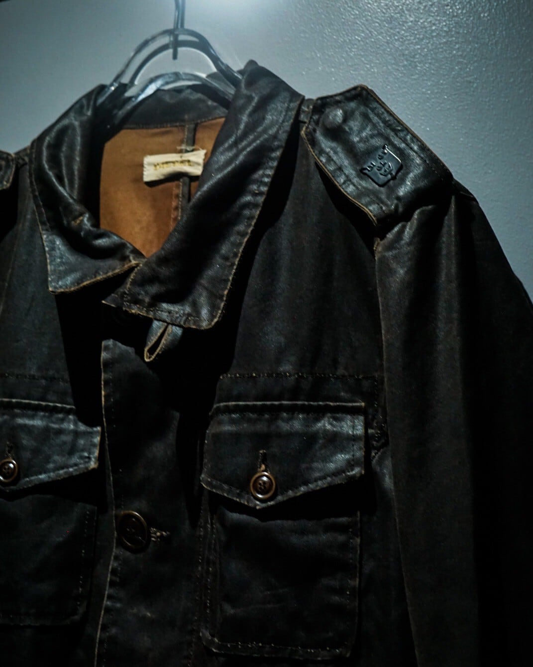 濃く深みのあるブラウンのコットン素材を用い、コーティングが施され特有の光沢を持った素材感のボディ。そこに、アームのポケットやエポレット、ハイネックへの変更可能な襟のディテール等、オリジナルと同様のディテールを搭載した、機能性に加えてデザイン面でも素晴らしい逸品。