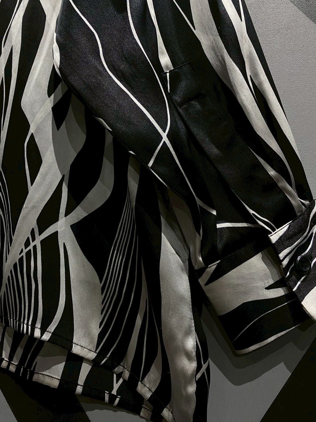 ツルッと滑らかなボディに、白×黒のモノトーンのカラーリングで、流動感、躍動感のある美しいストライプ調のパターンを載せた1着。平面の中に立体感を表現したデサイン性が素晴らしいですね。