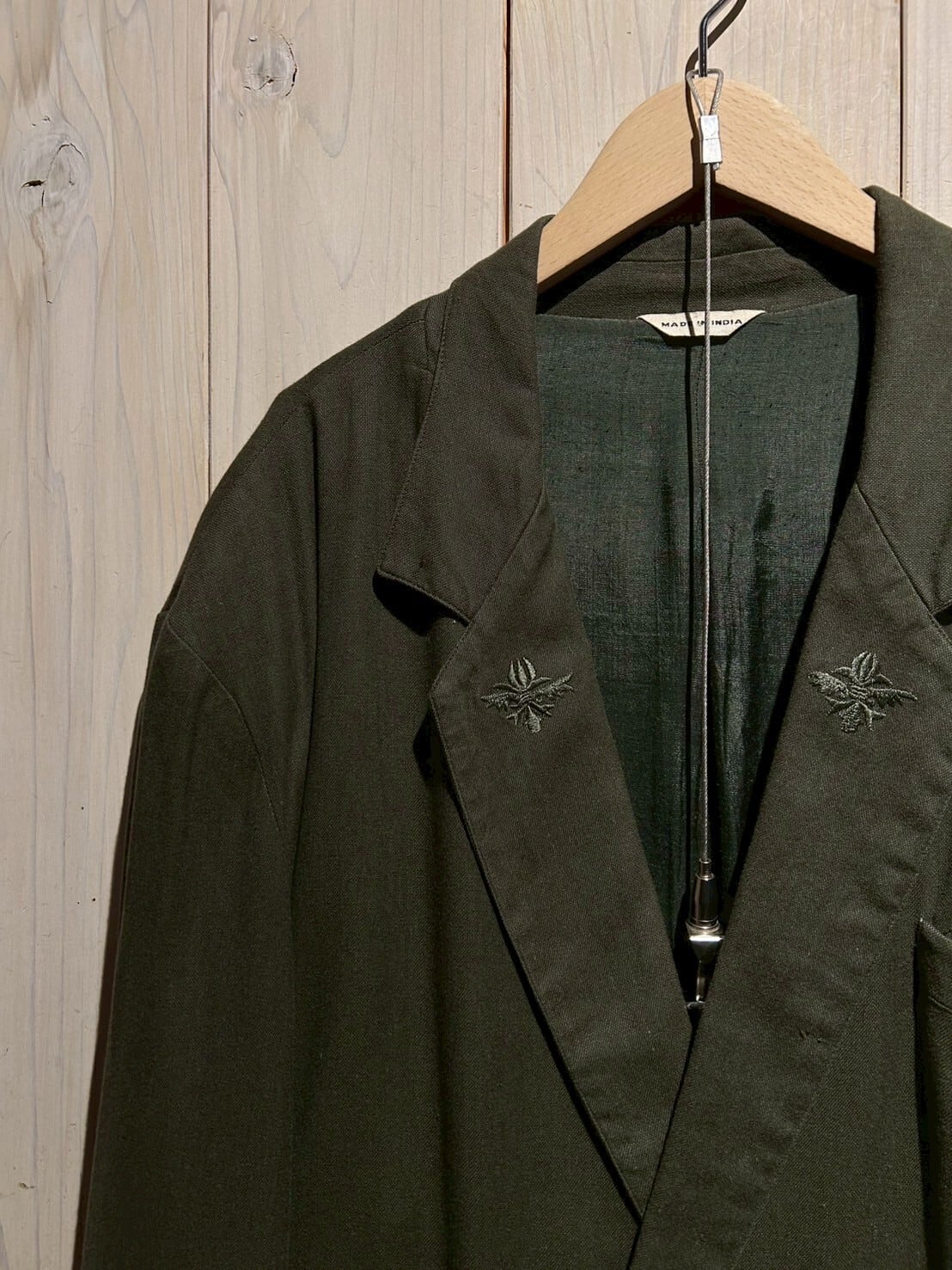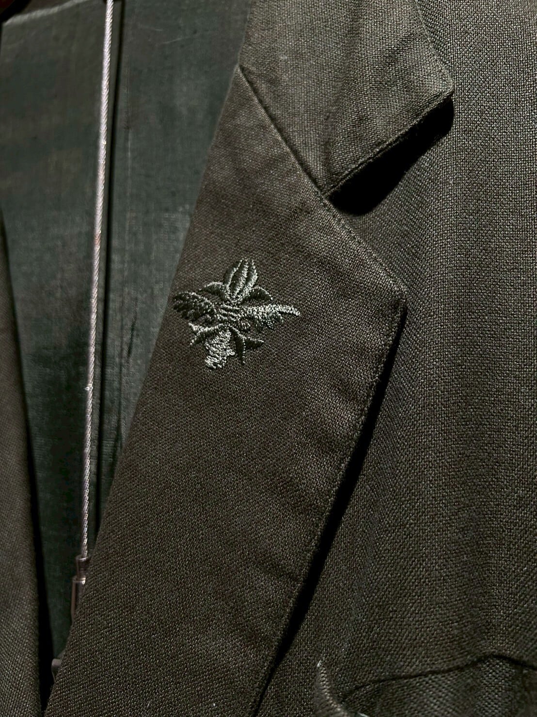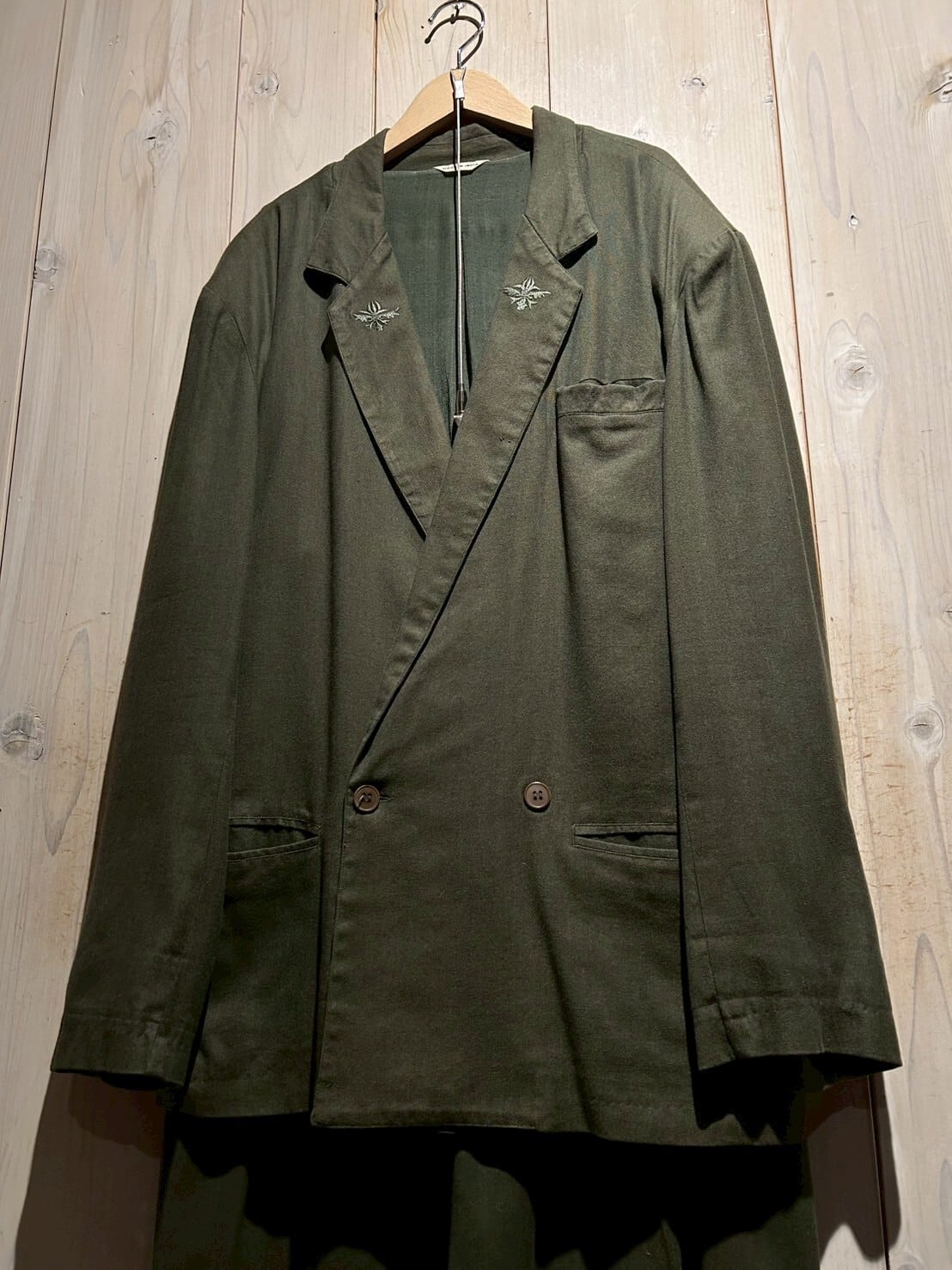ジャケットのラペルにはワンポイントの刺繍。肩パッドは入っていますが、生地が柔らかくカチッと要素が控えめな点がこのアイテムのポイント。ラフに身に纏えるのが最高です。