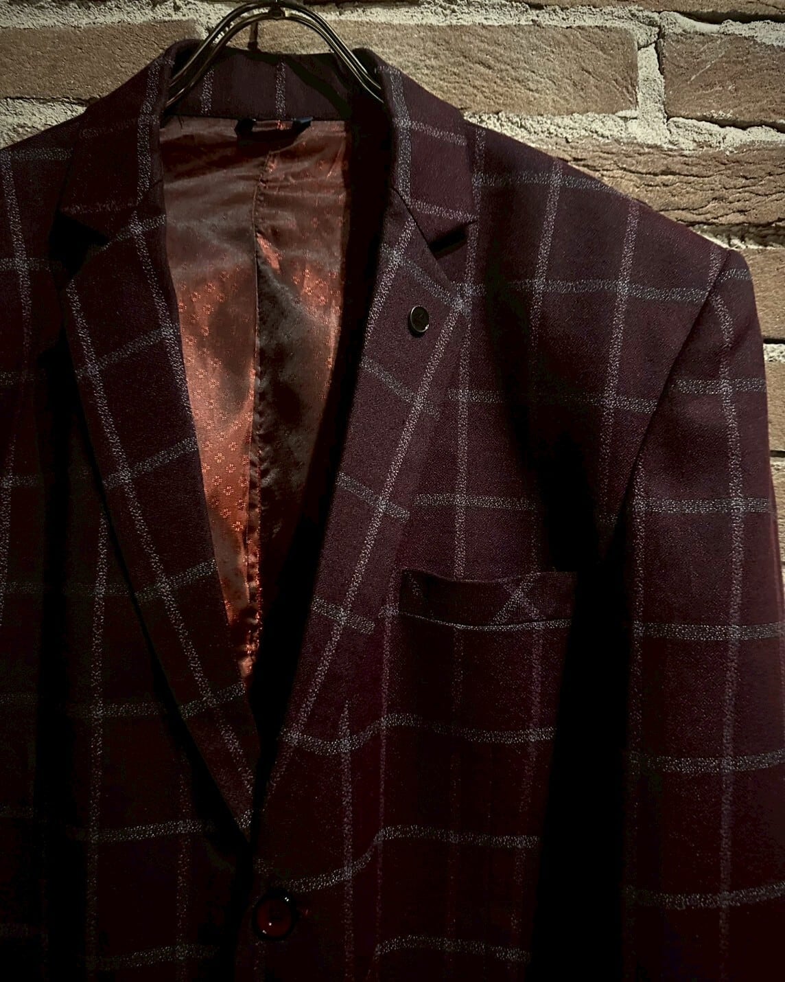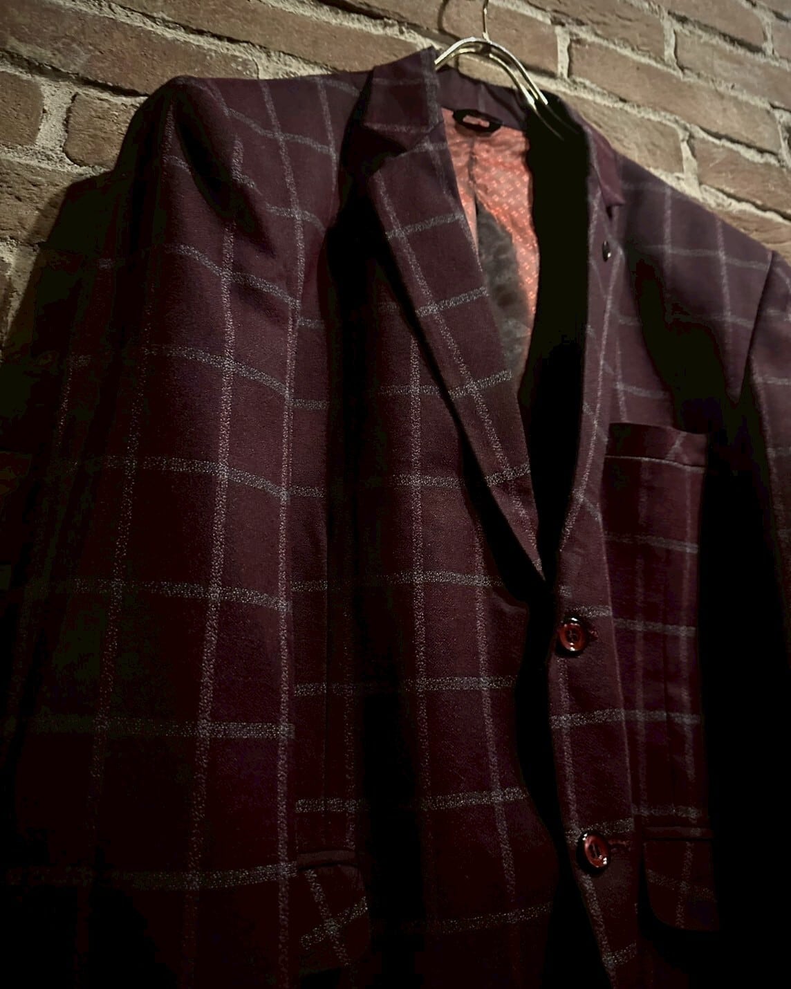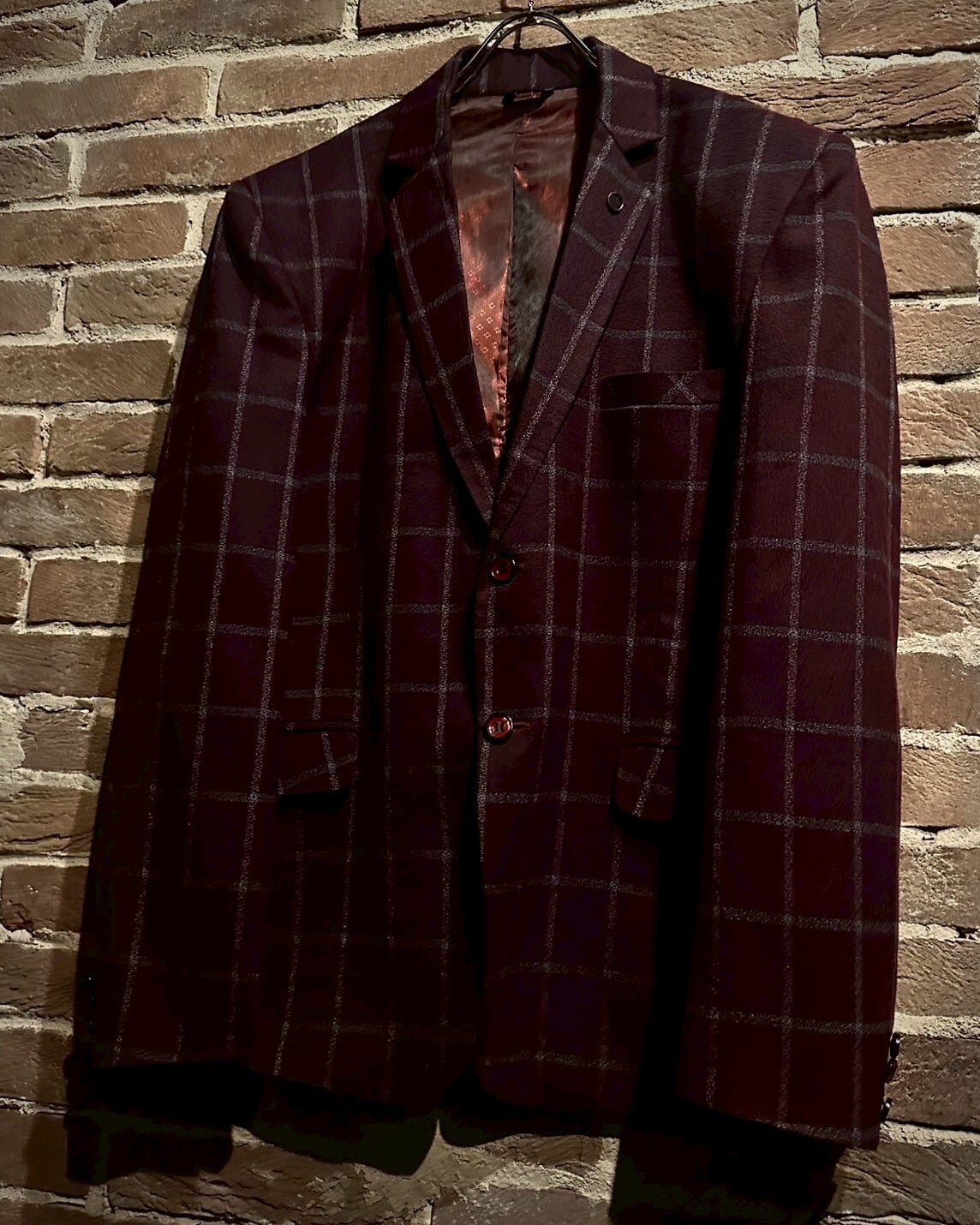 深みのある赤色のボディをベースに白色でチェック柄を載せたテーラードジャケット。