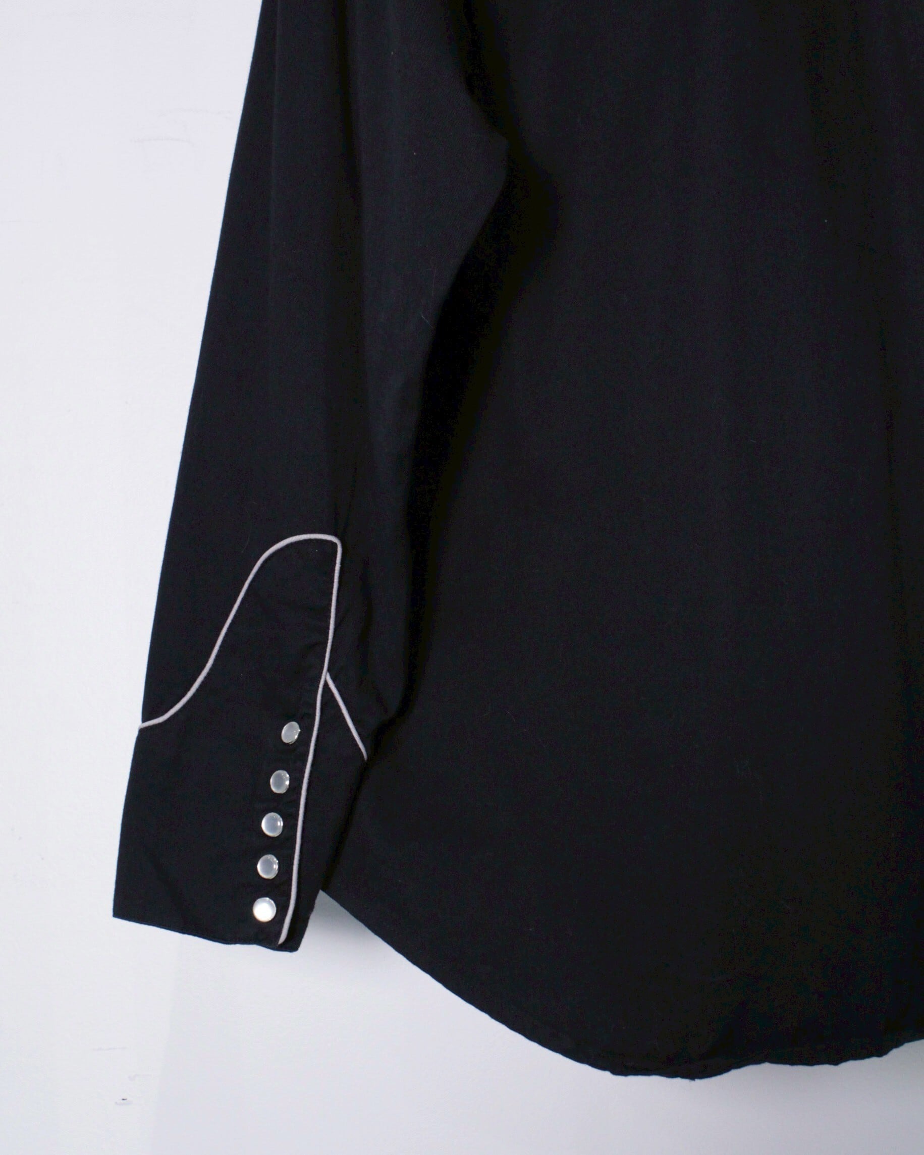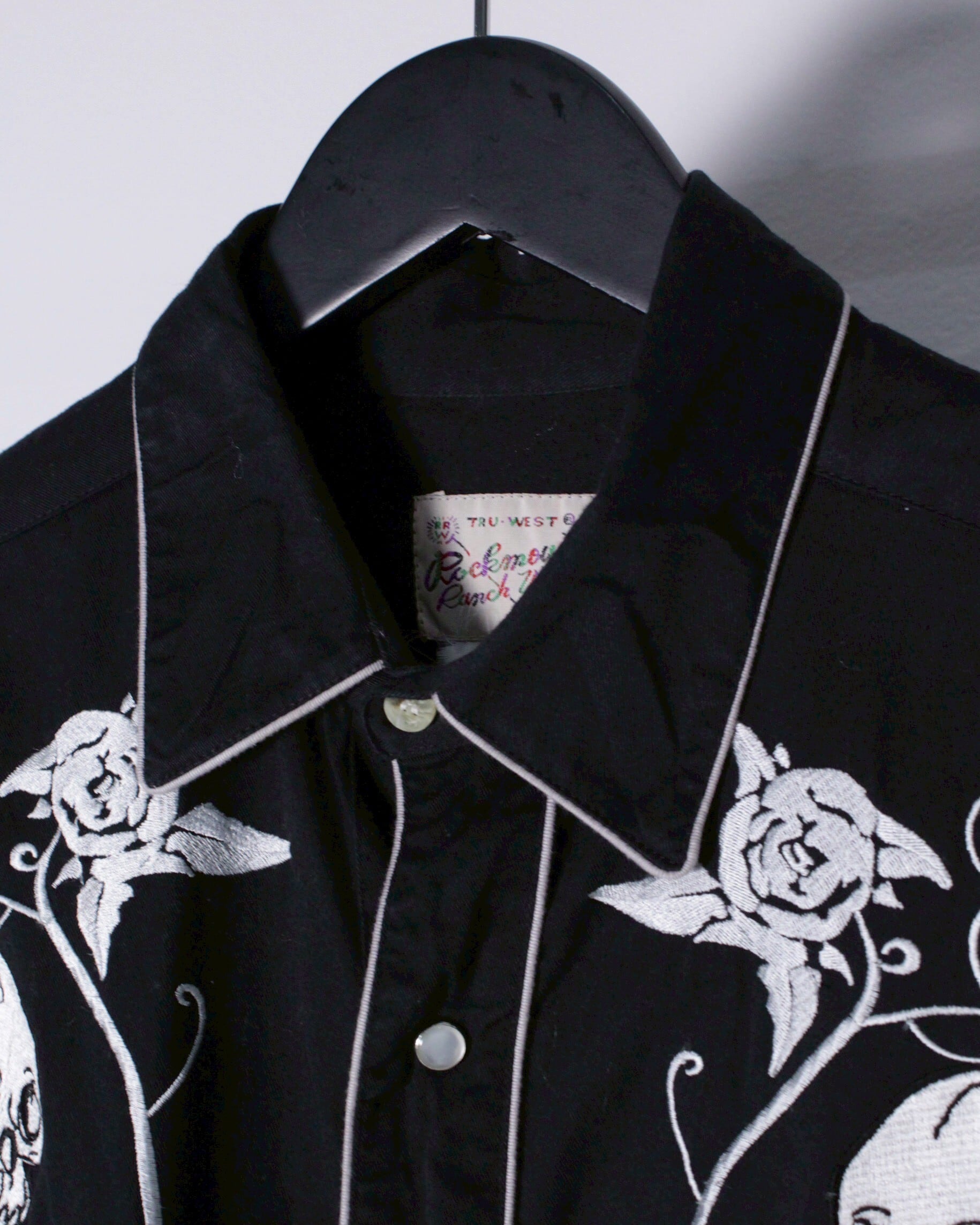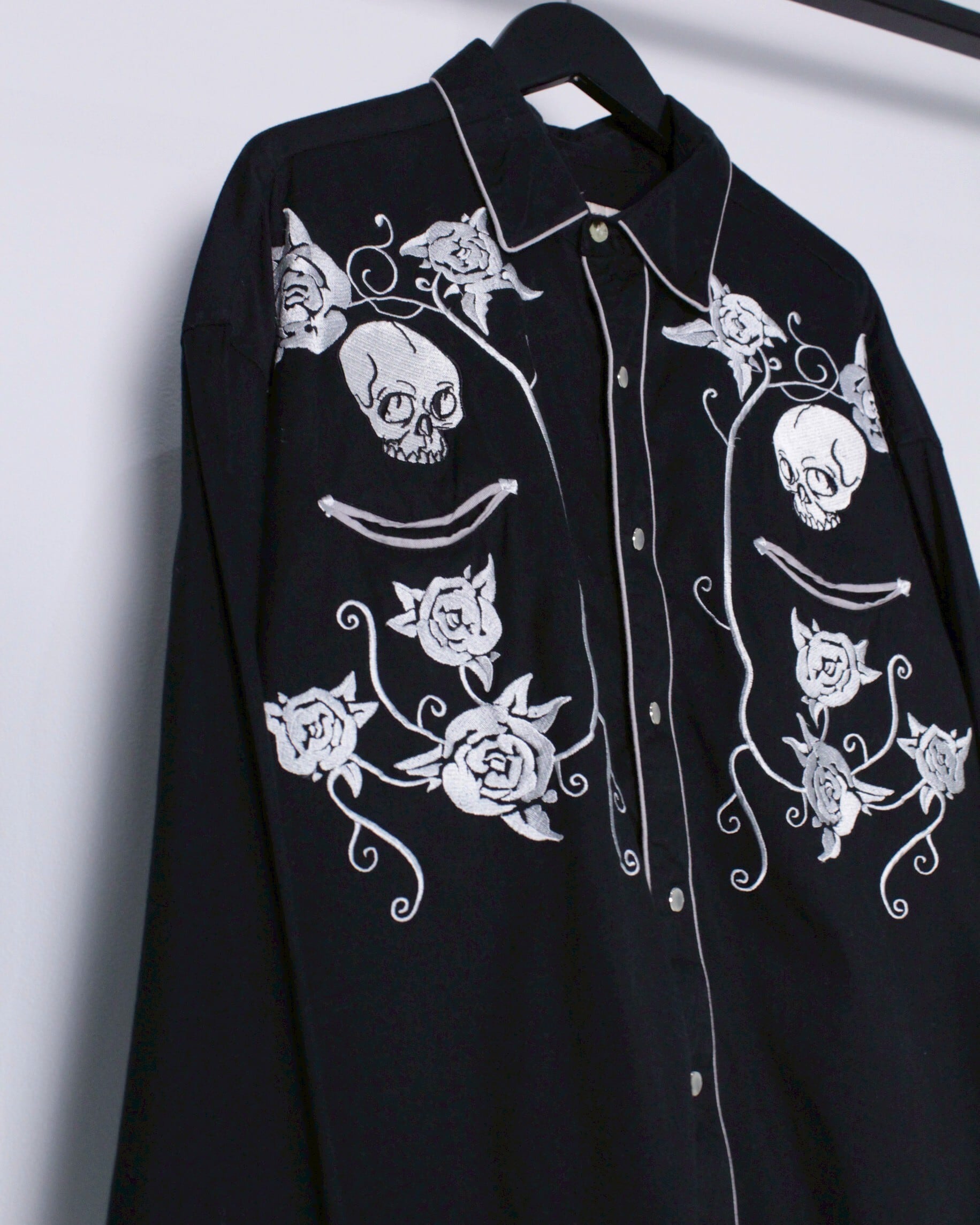 柔らかくもハリのあるブラックのボディをベースに、シルバーの糸によって薔薇とスカルの刺繍デザインを施したウエスタンシャツ。