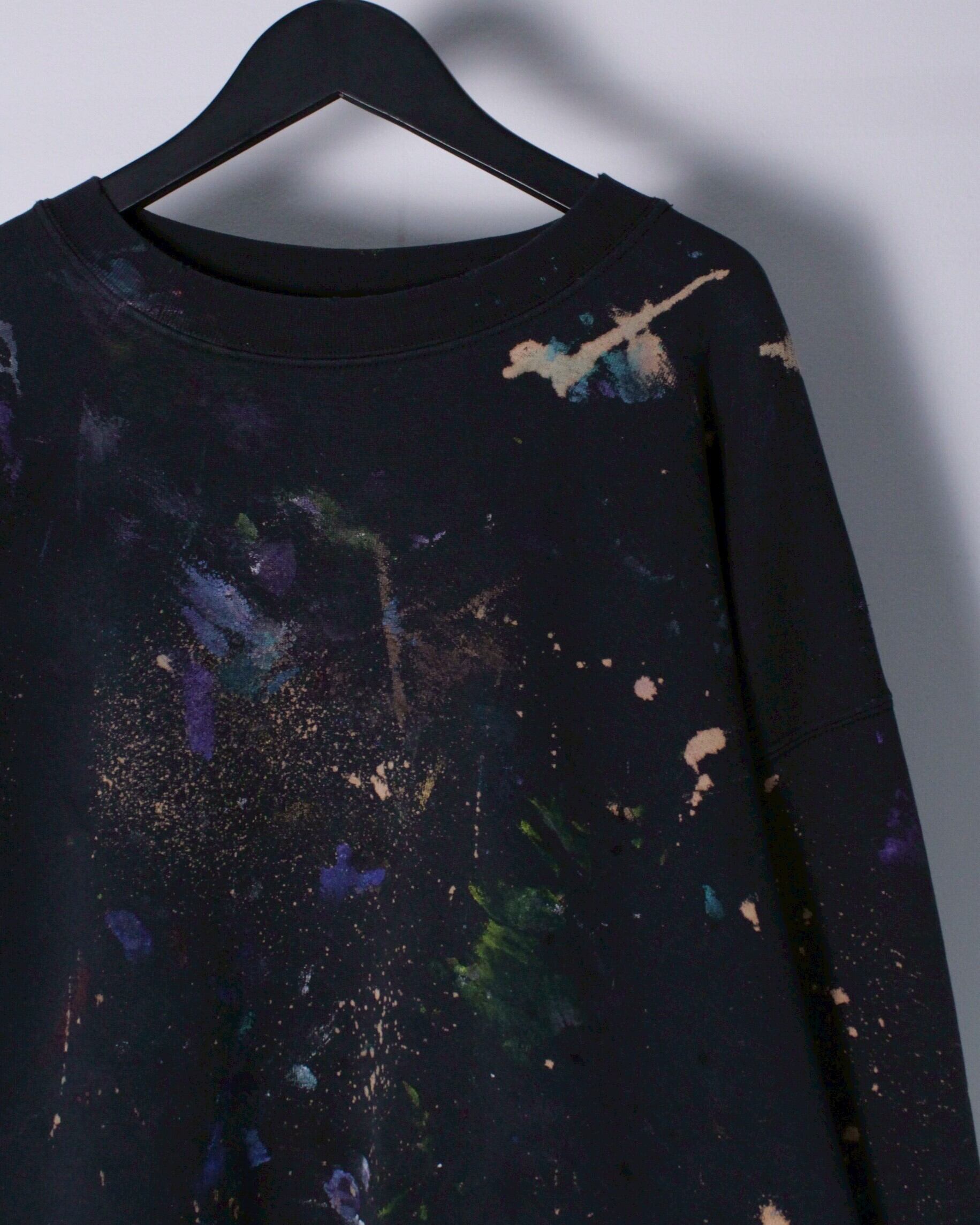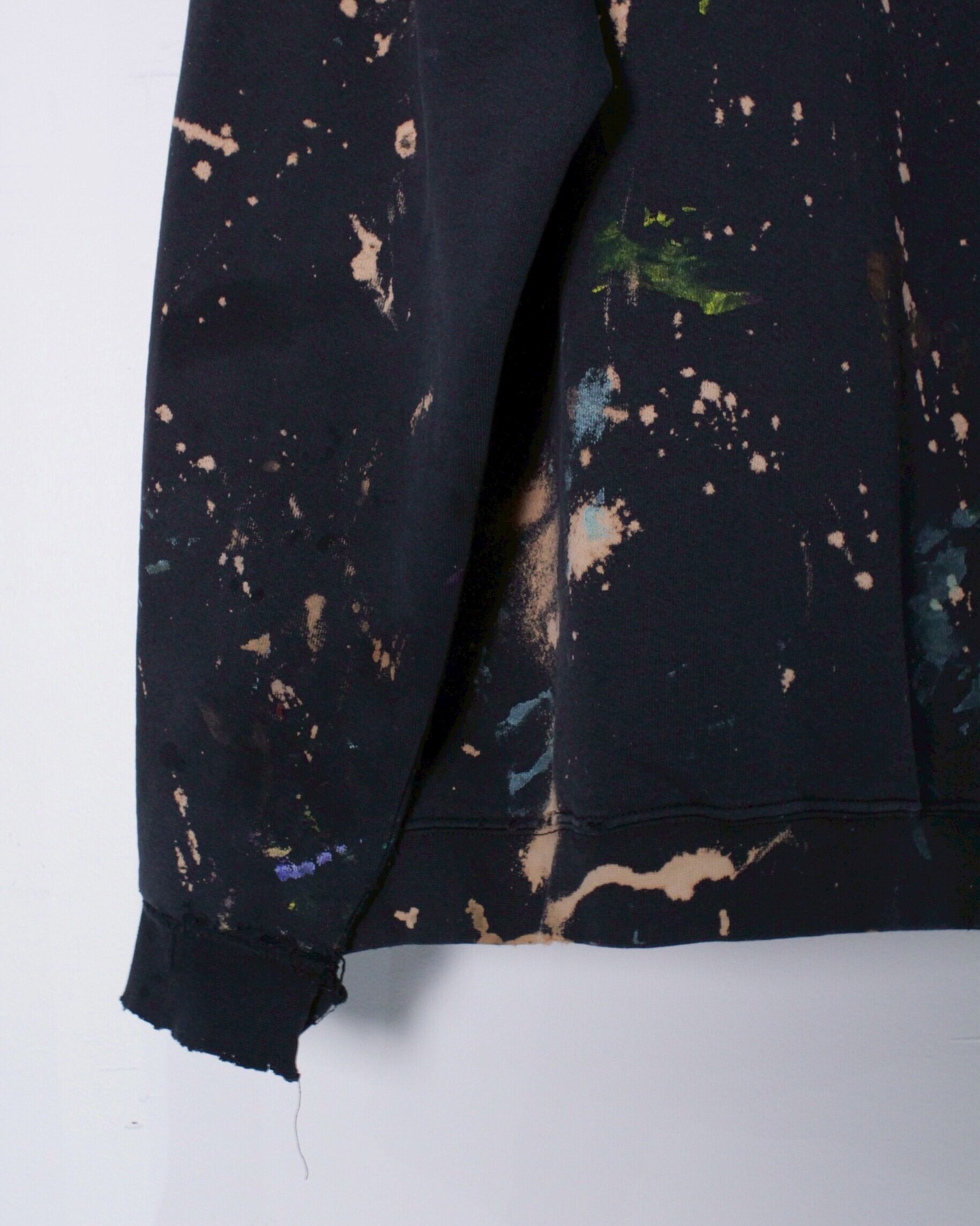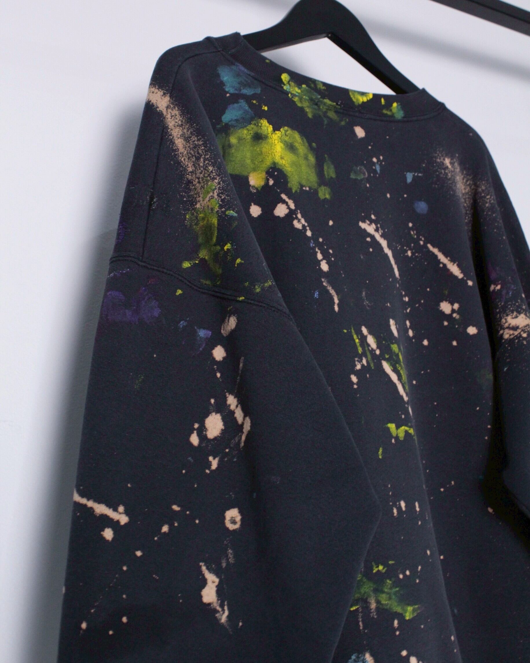 経年変化によるダメージ、フェードが効いたボディに、ドリッピングペイントが施されたスウェット。