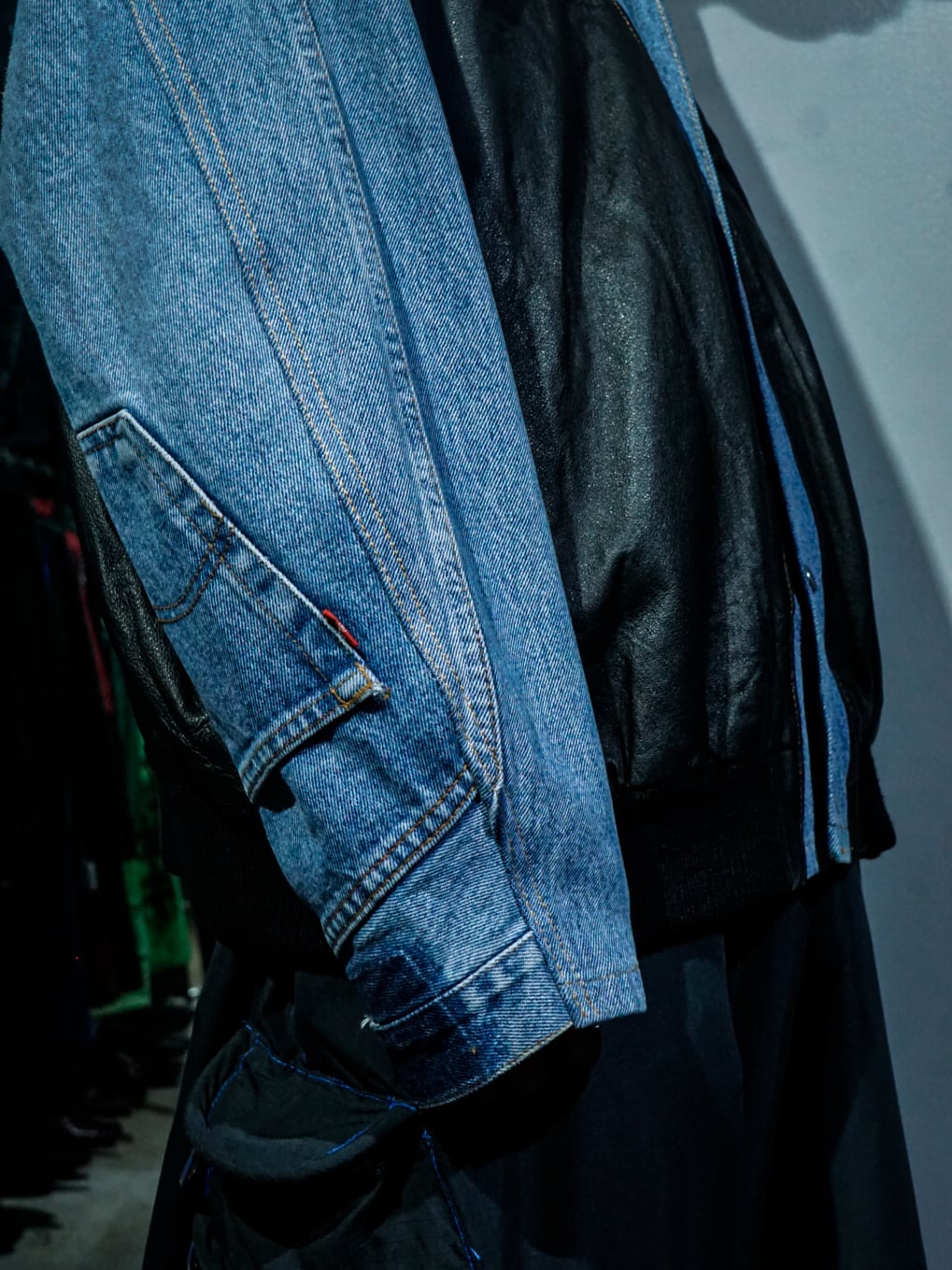 左胸にはジップポケット、アームには元のパンツのポケットと、本来のボディのディテールがデザインに生かされつつ、レザーとデニムのコントラストが際立っています。