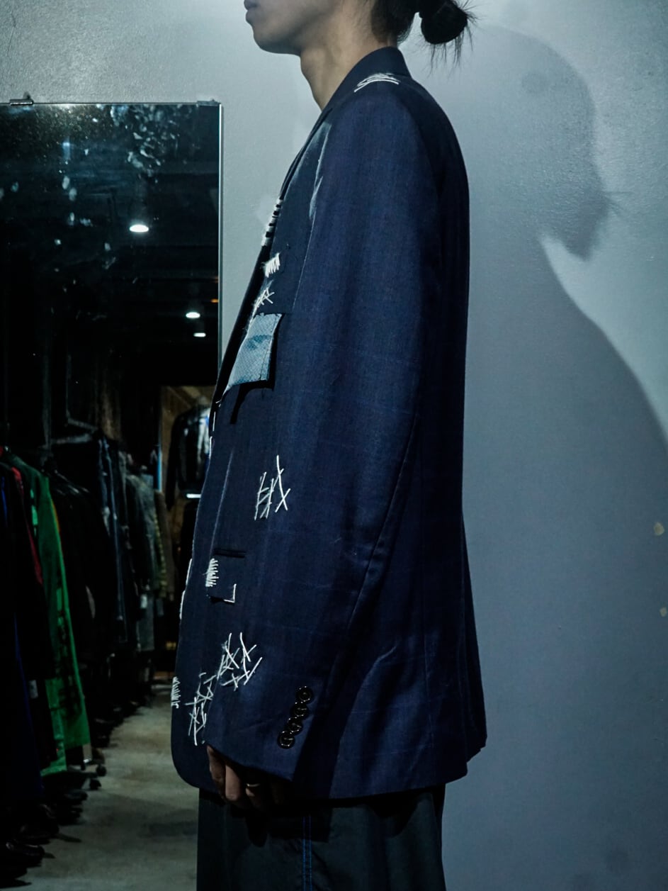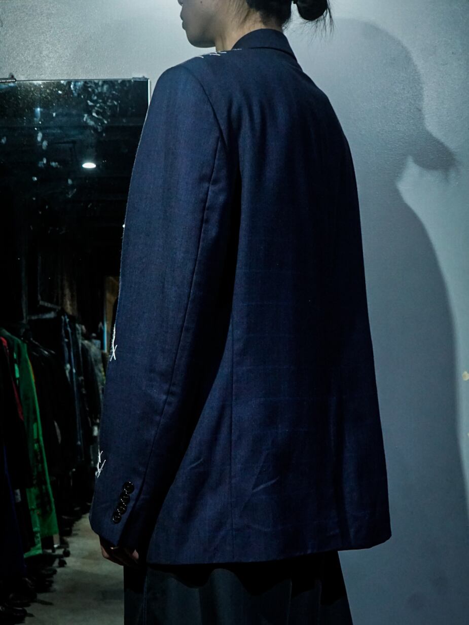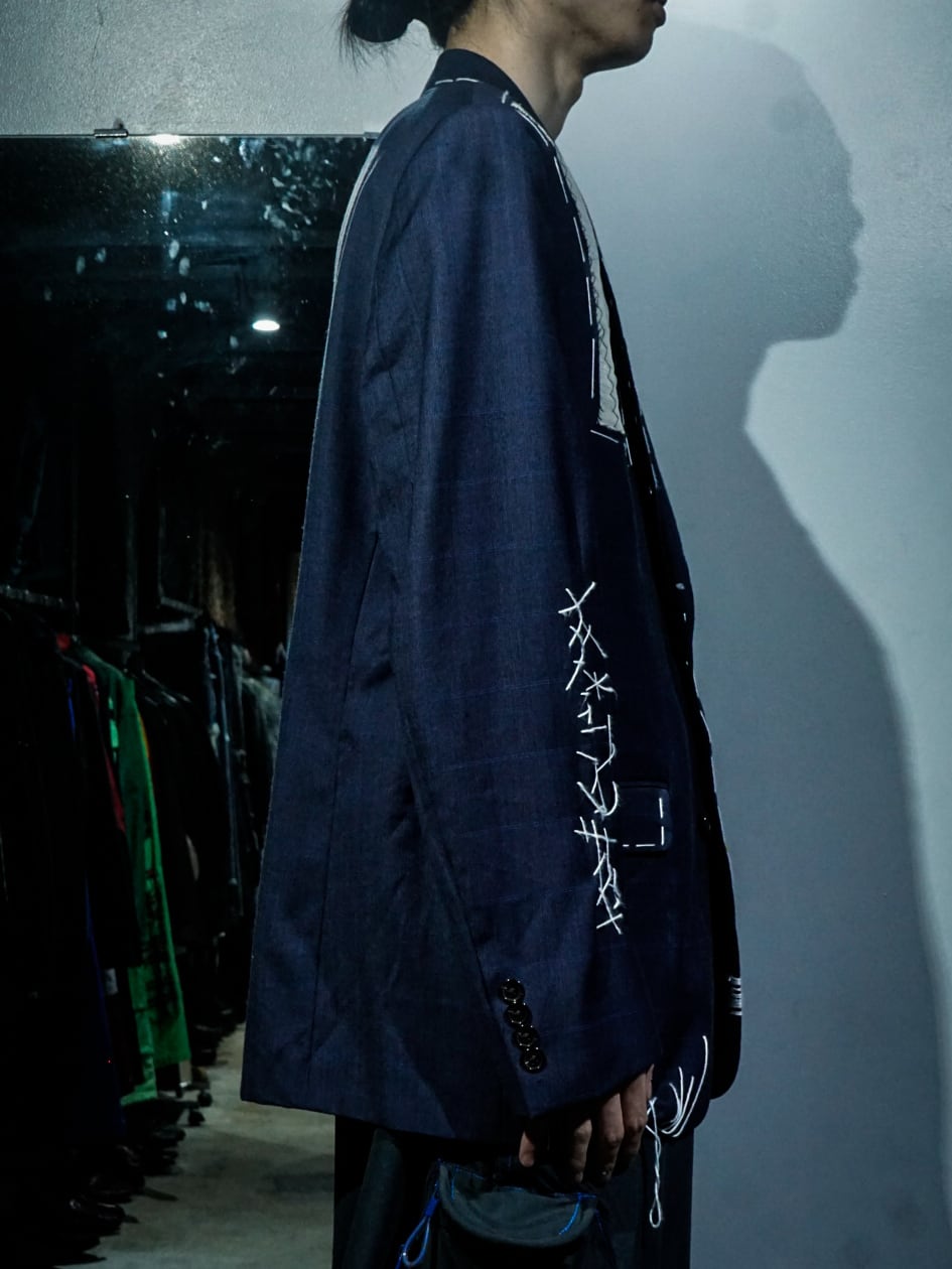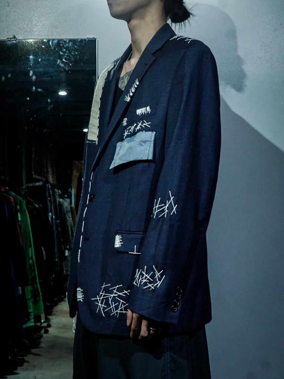 チェックを載せたネイビーのテーラードジャケットに、ボディの随所にハンドステッチでデザインを落とし込み、右ヨークにはボディとは異なる生地をON。胸ポケットの裏地を出して装飾に活かすなど、作り手のハイなデザインセンスが光る1着。