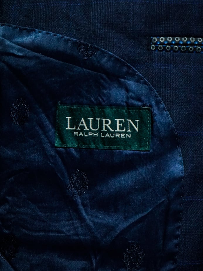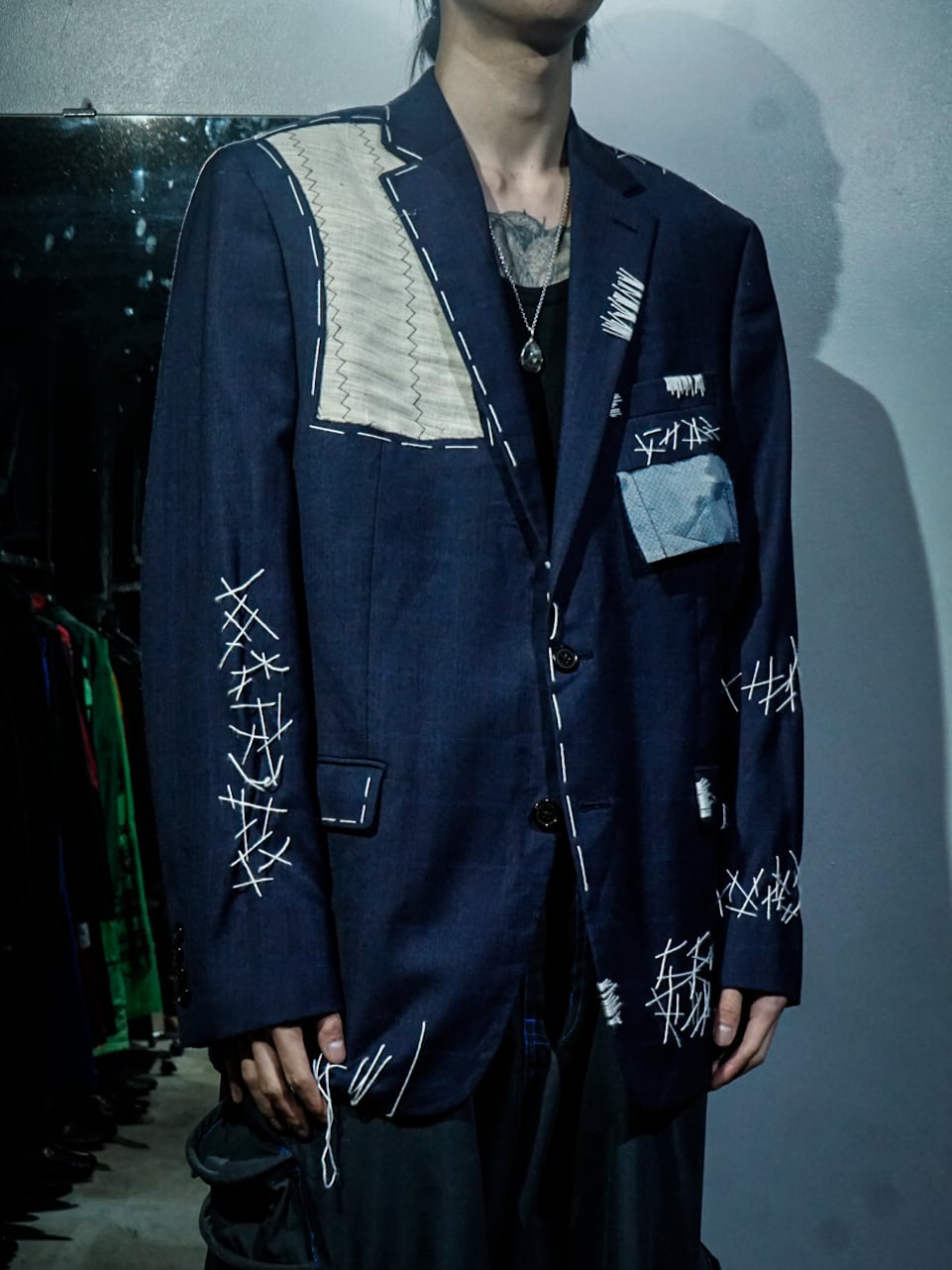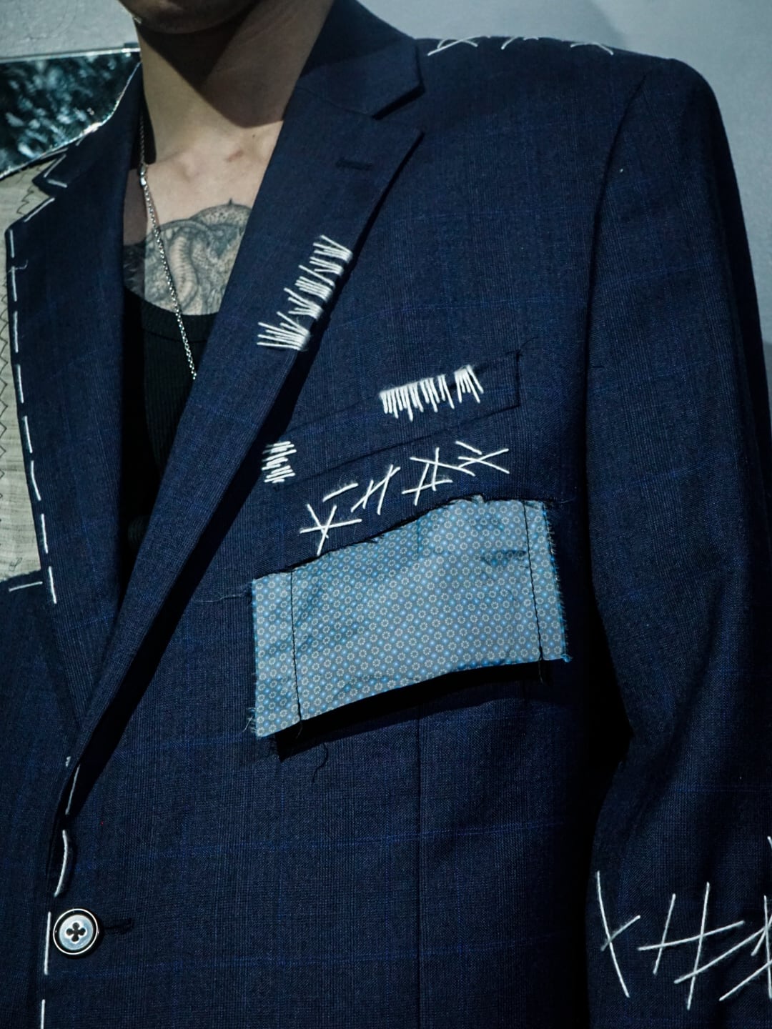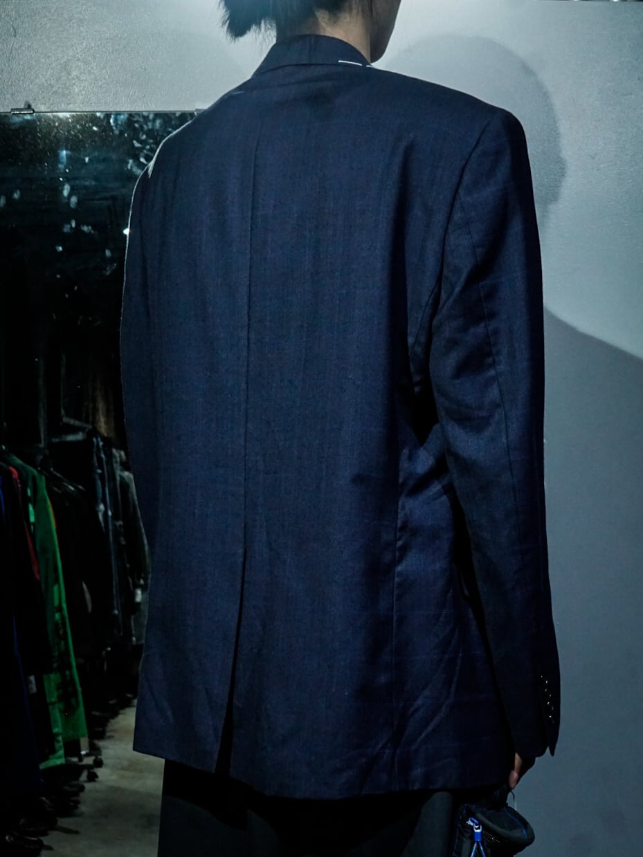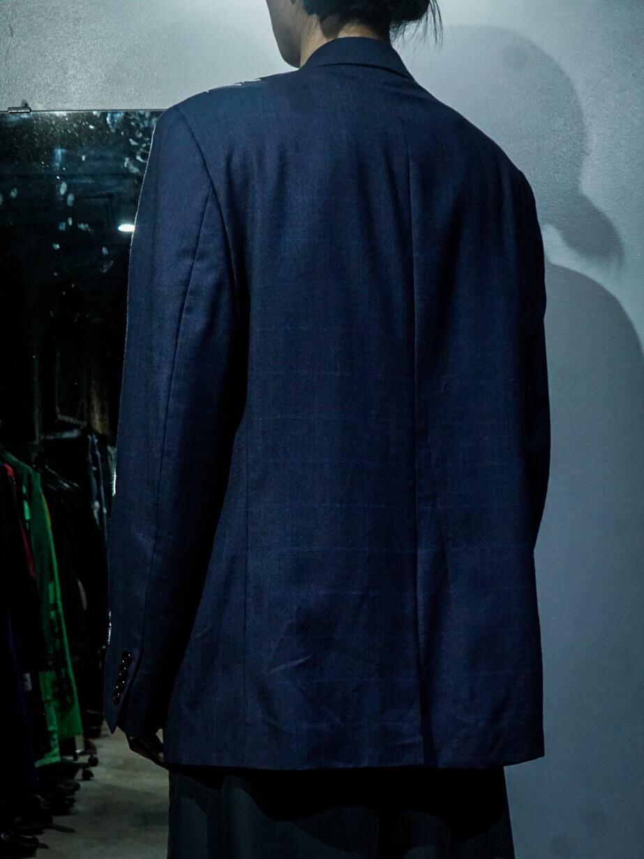 チェックを載せたネイビーのテーラードジャケットに、ボディの随所にハンドステッチでデザインを落とし込み、右ヨークにはボディとは異なる生地をON。胸ポケットの裏地を出して装飾に活かすなど、作り手のハイなデザインセンスが光る1着。