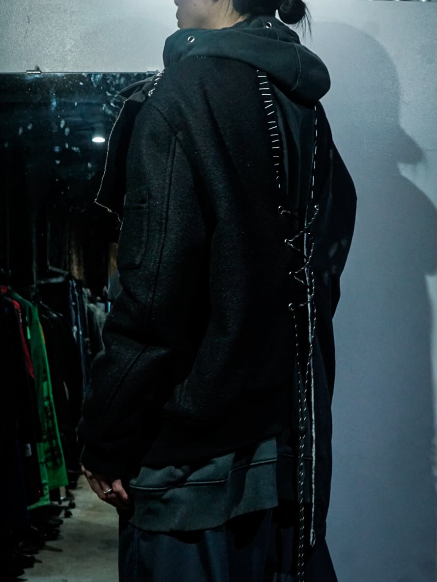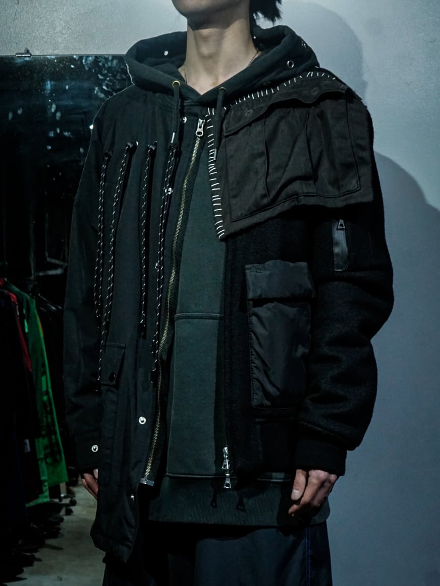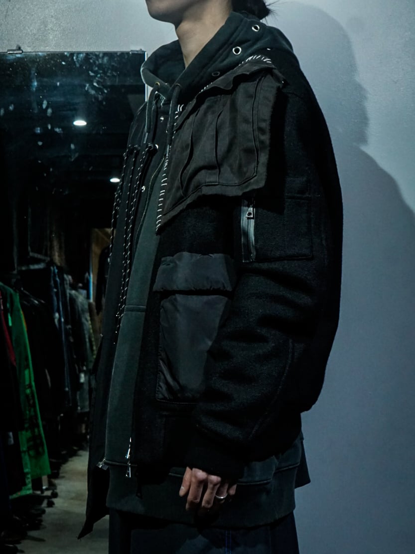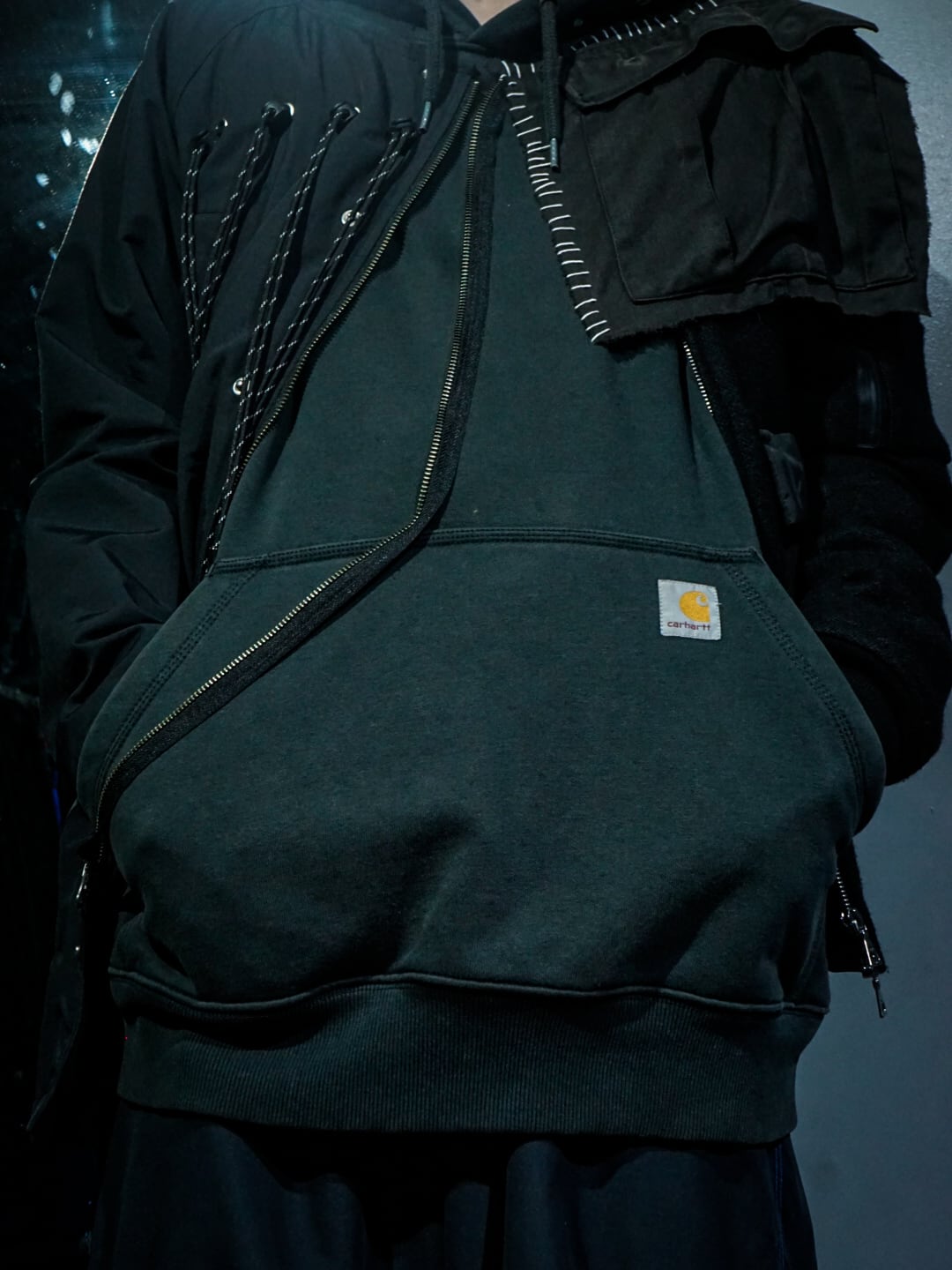 トレンドでもある"Carhartt"のフーディをベースに、左肩部分にはジャケットのポケット部分、ミドル丈のジャケットとウールのボンバージャケットを解体、ドッキングしたプルオーバー。