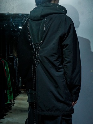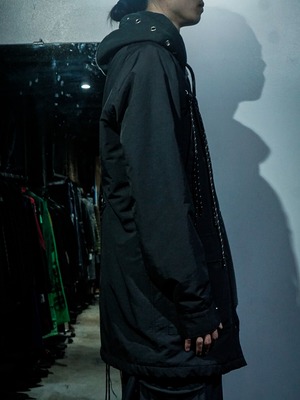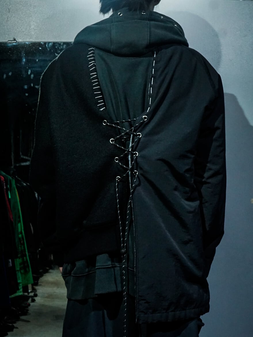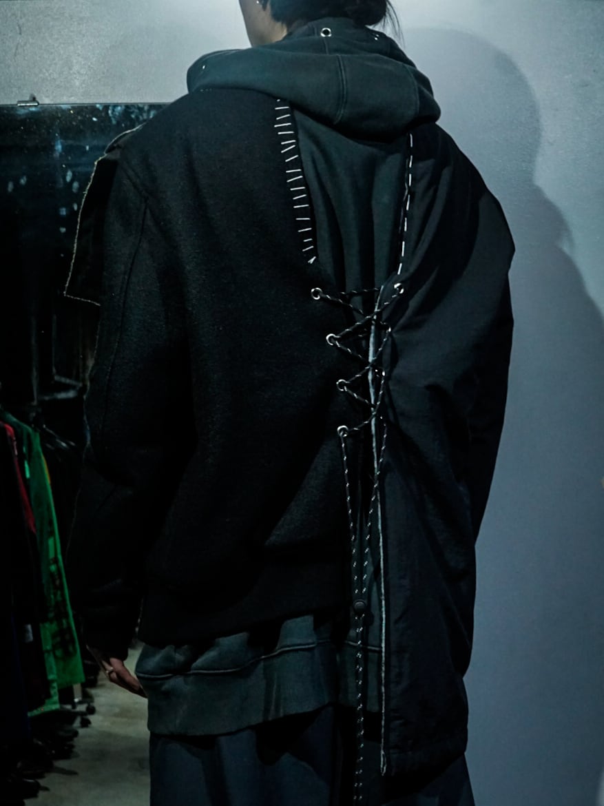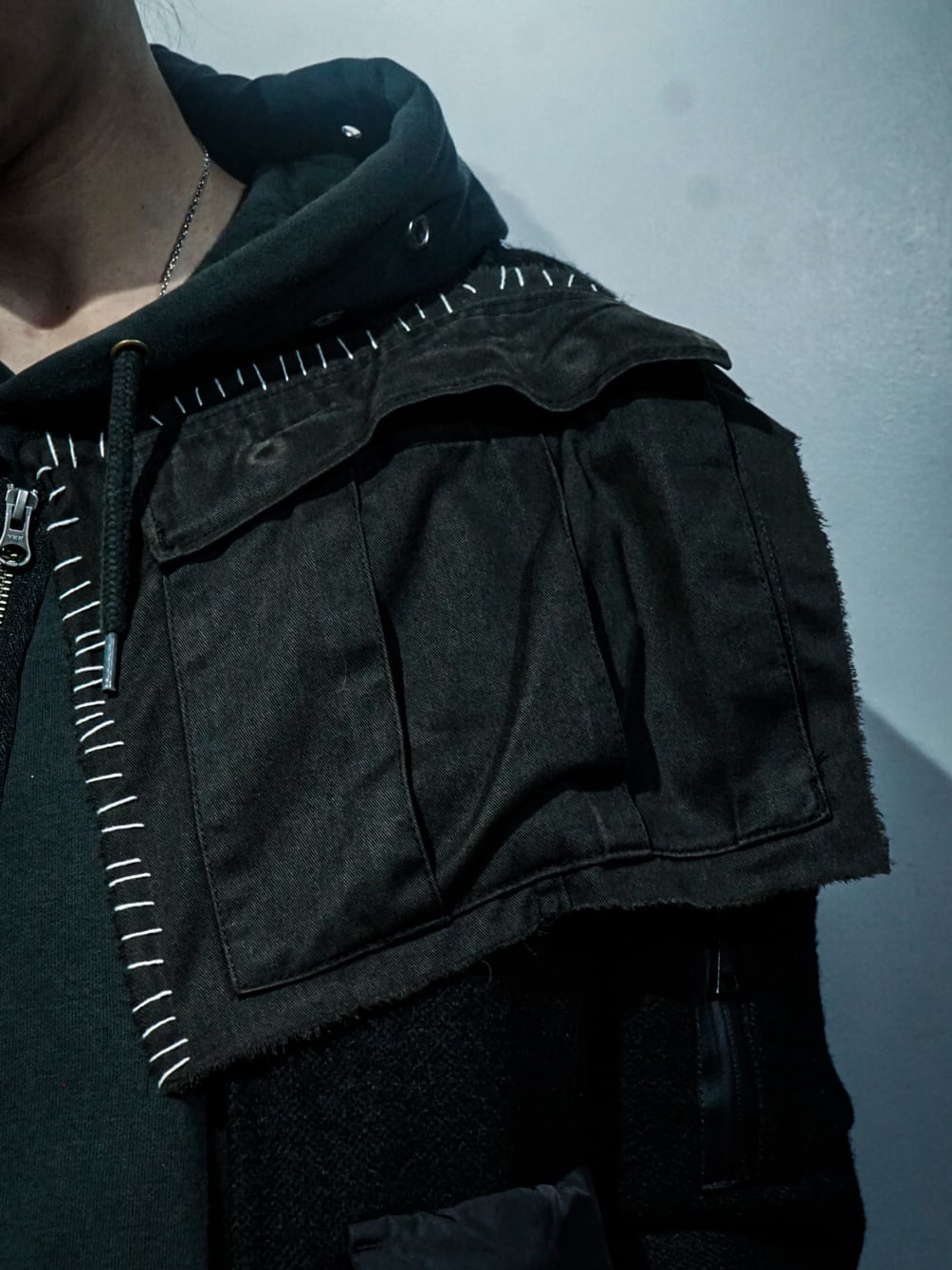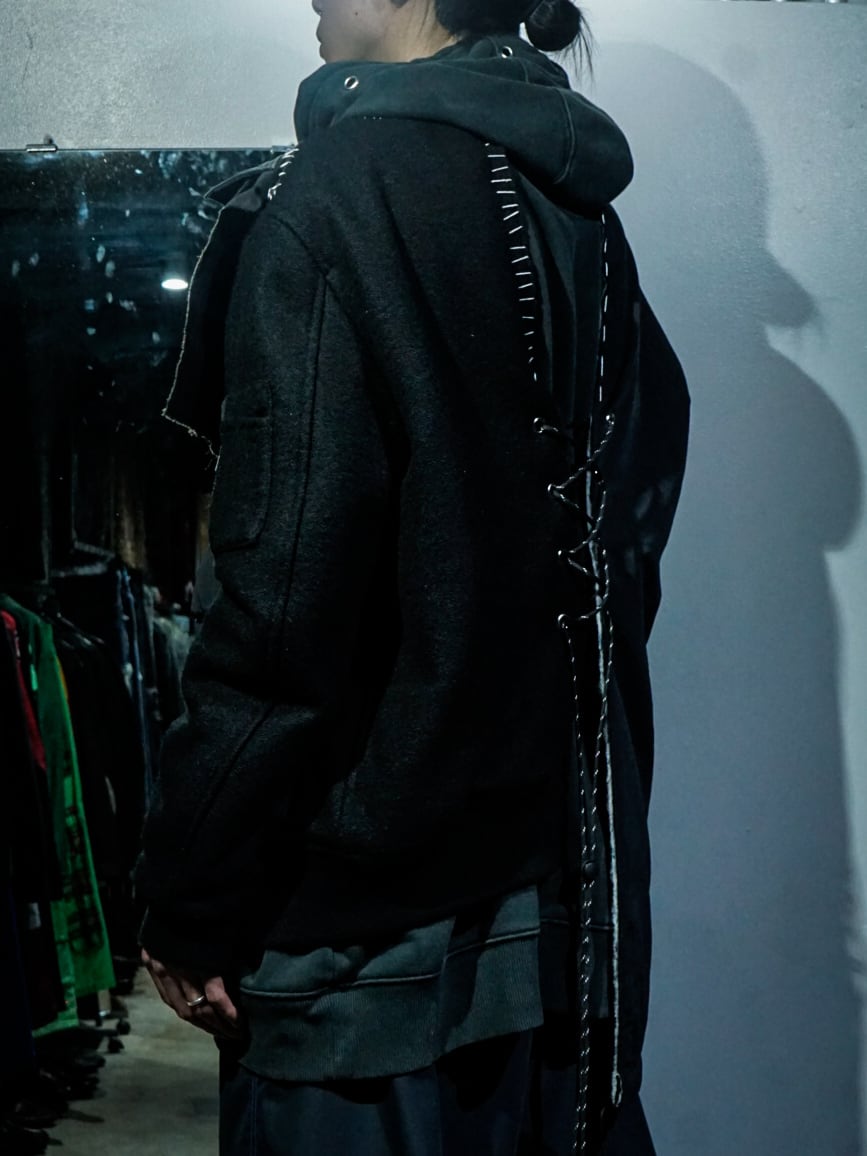 トレンドでもある"Carhartt"のフーディをベースに、左肩部分にはジャケットのポケット部分、ミドル丈のジャケットとウールのボンバージャケットを解体、ドッキングしたプルオーバー。