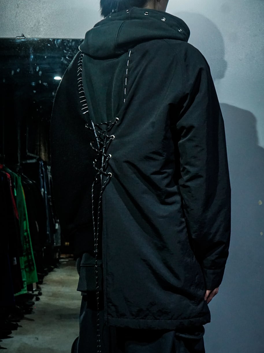 随所にはハンドステッチのデザイン、ボディ右部分、背面にはドローコートが施されており、シルエットに変化をつける事ができるギミックを搭載。
