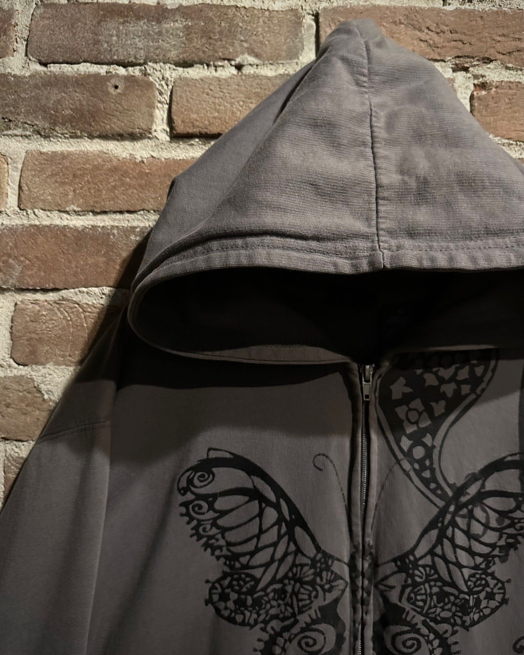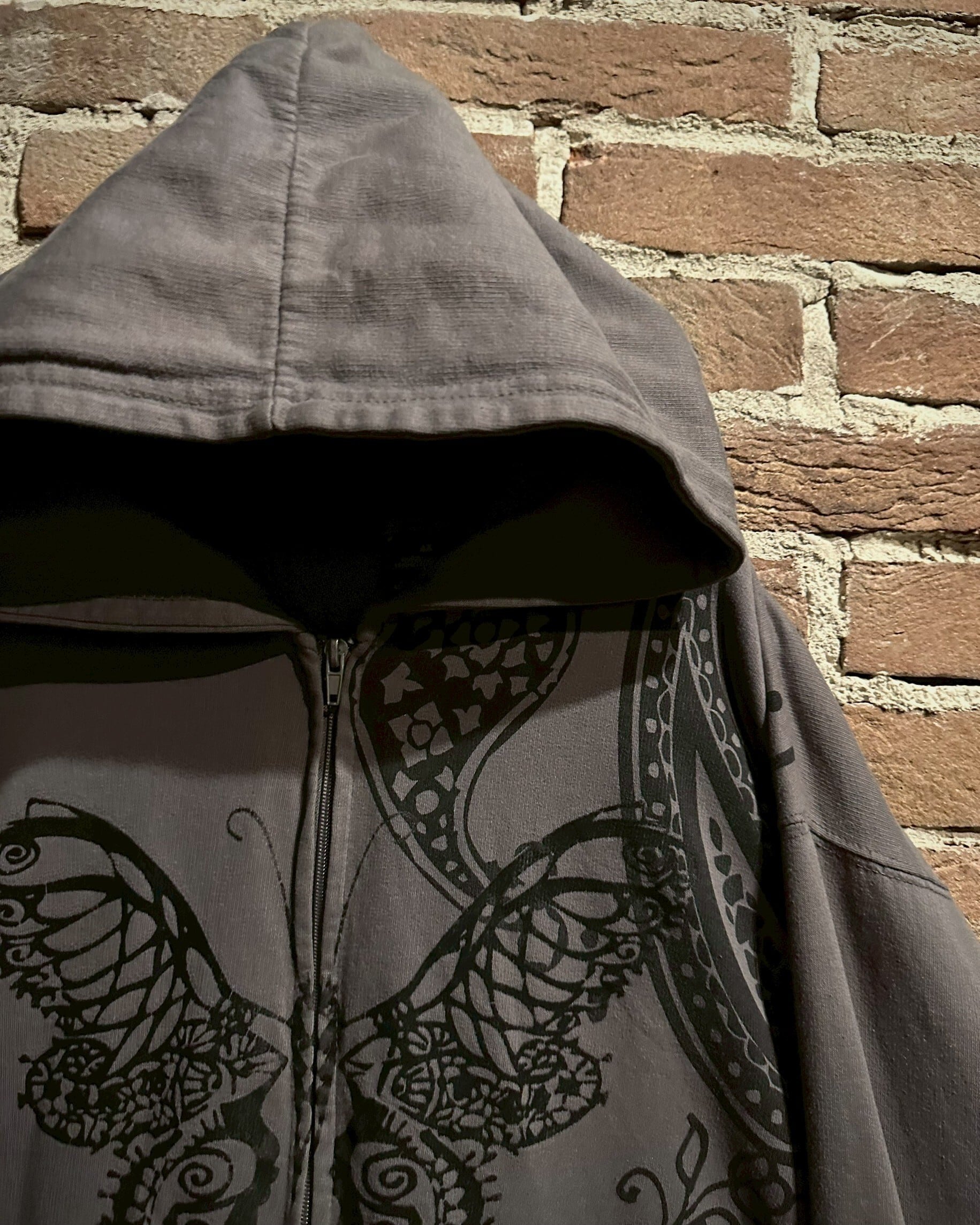 フェードグレーのボディをベースに、蝶々、花、ペイズリー柄をプリントで載せたジップアップフーディ。