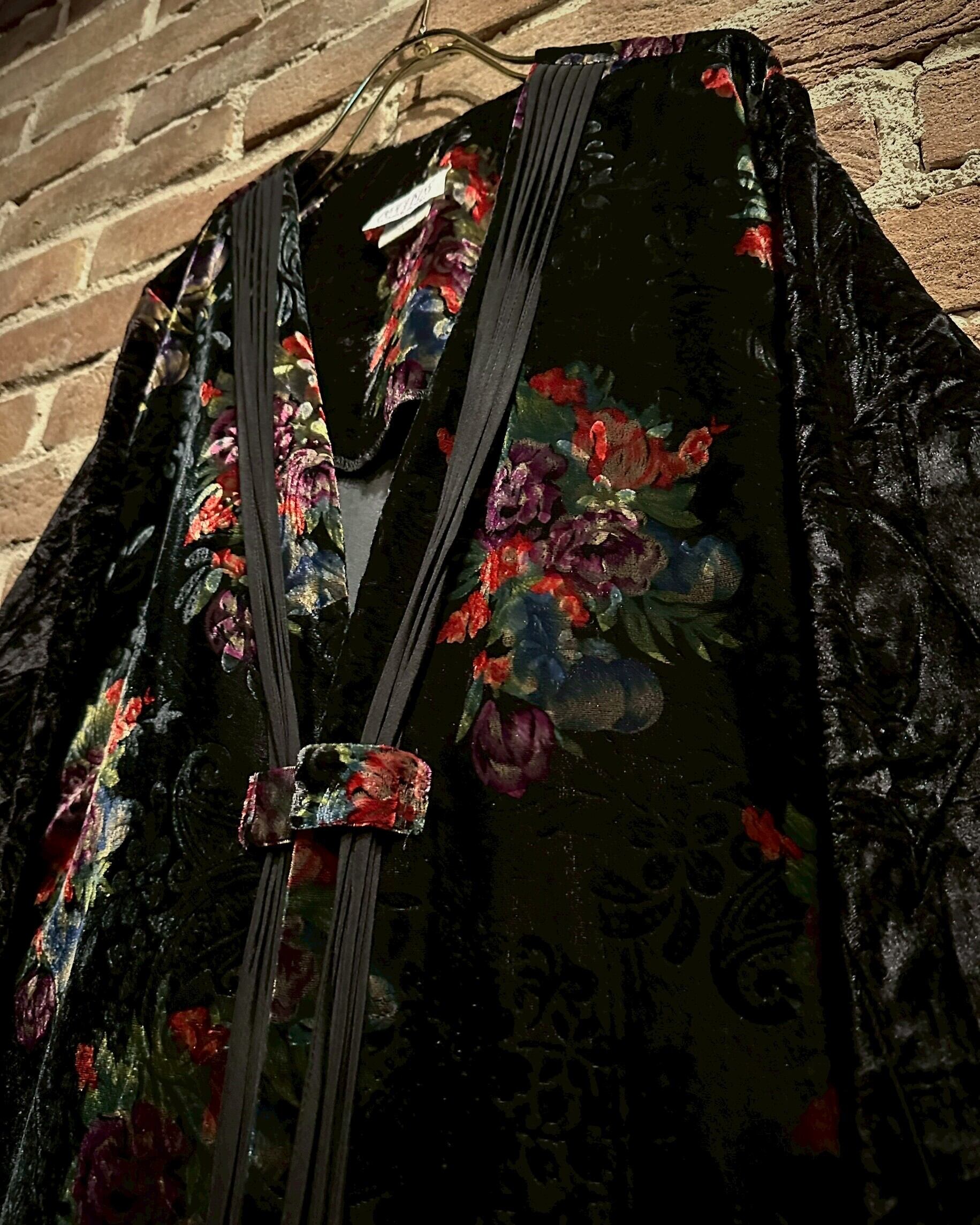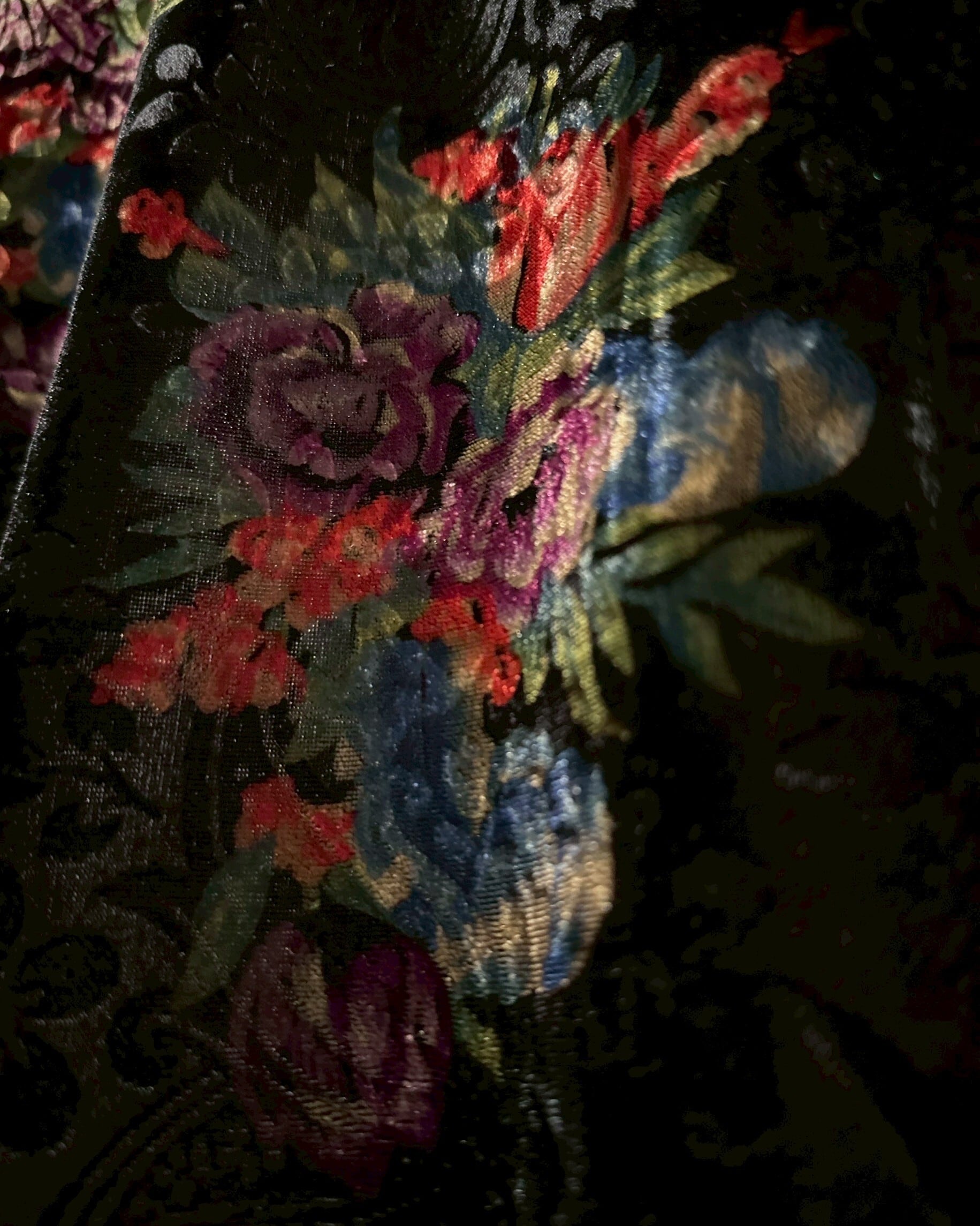ベロア特有の光沢、繊細な花がマッチして生まれる色気が堪りません、、、見る角度によって花が美しく浮き出て見え、豊かな表情に目と心の早々を奪われてしまいます。