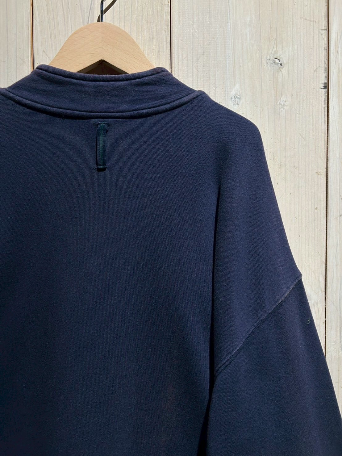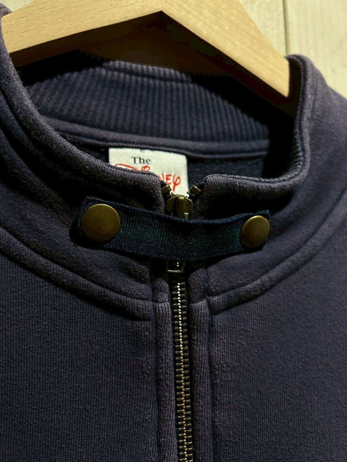 フェード感の良いネイビーのボディに、ボディ左側にミッキーとネームの刺繍を刻んだ90'sのハーフジップスウェット。