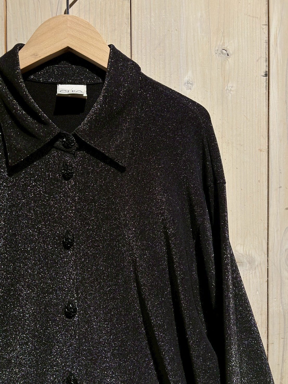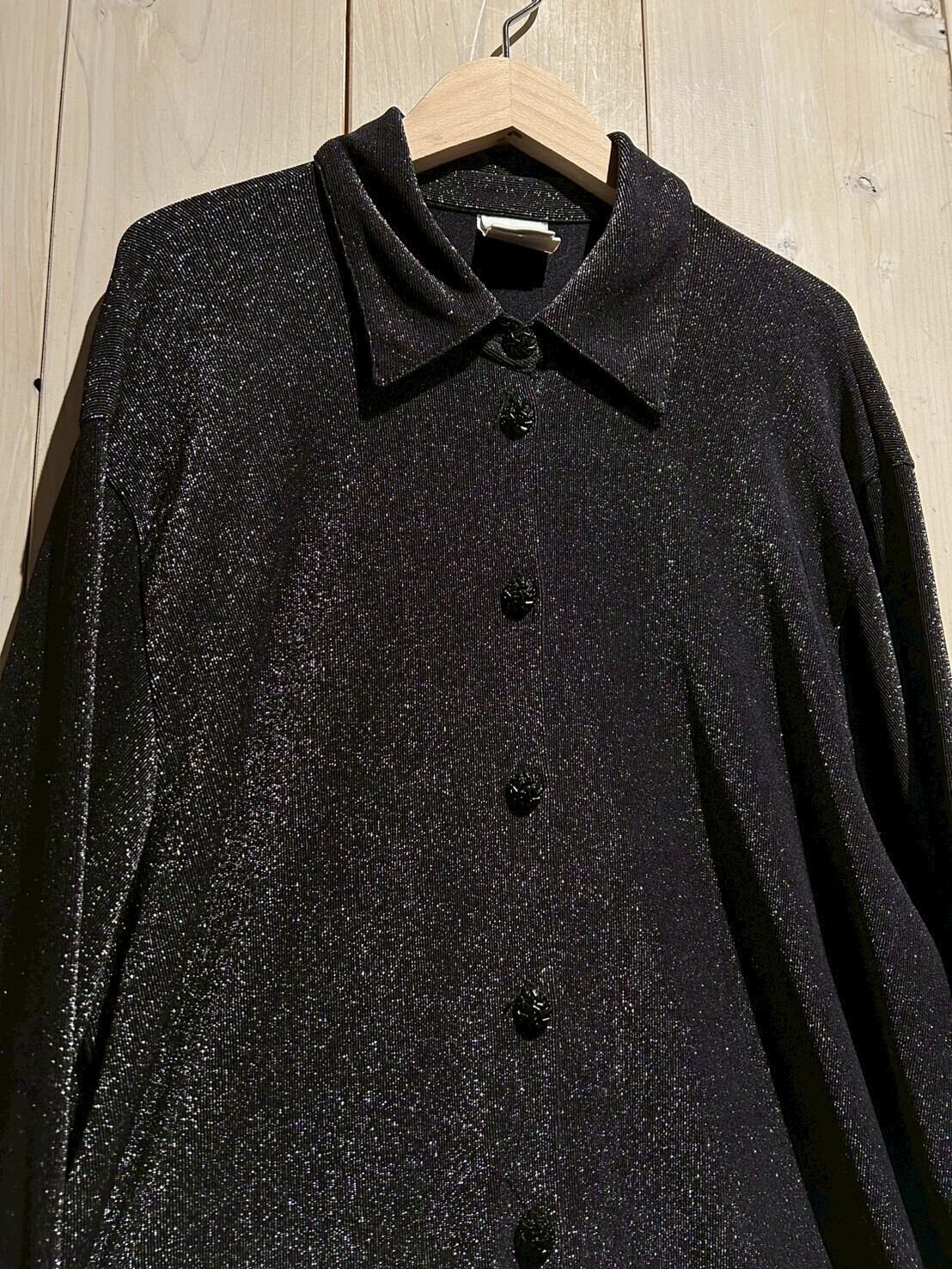 レーヨン×ポリを混紡した滑らかなボディに、繊細にキラキラと輝くシルバーのグリッターを載せた長袖シャツ。