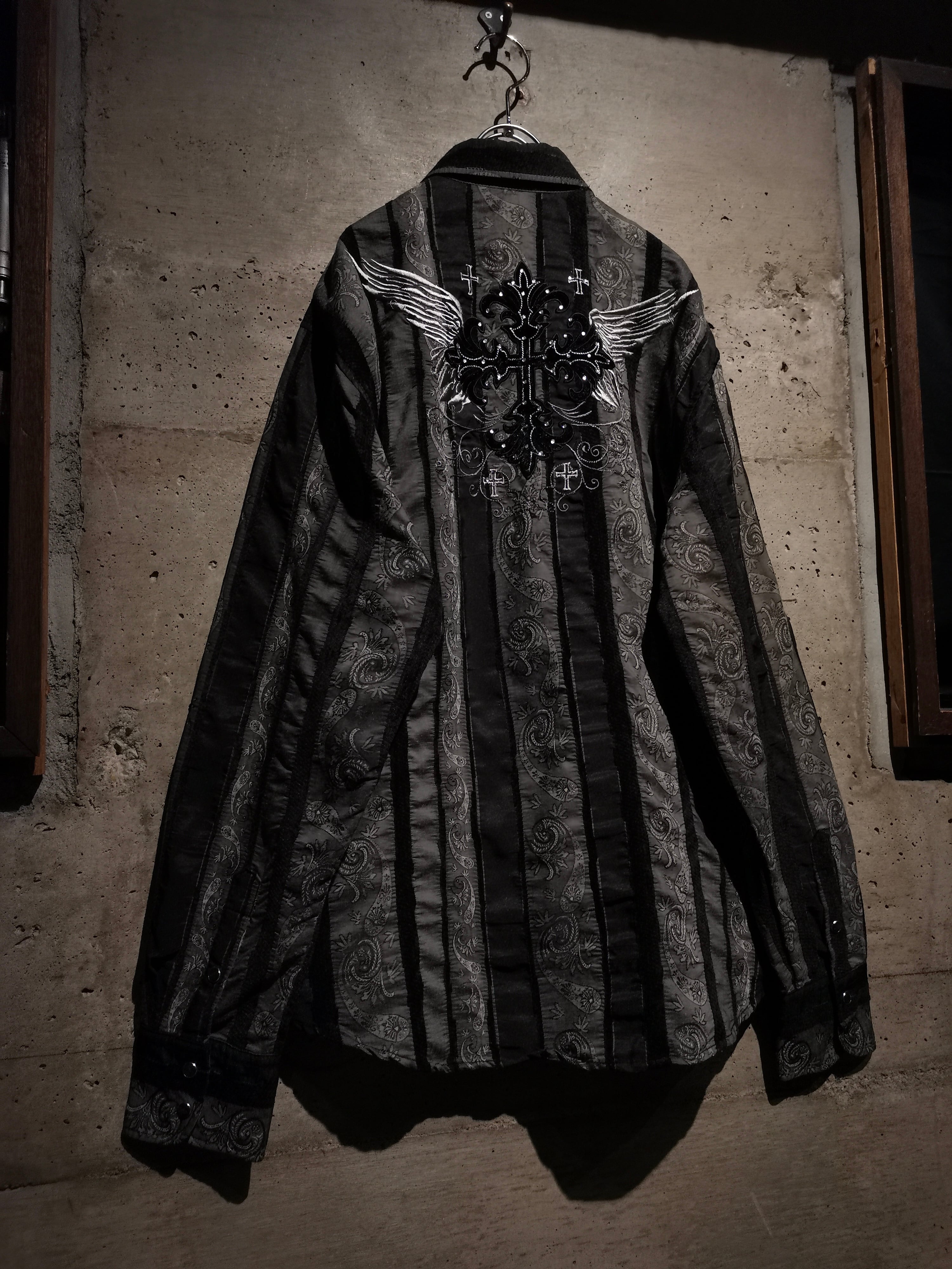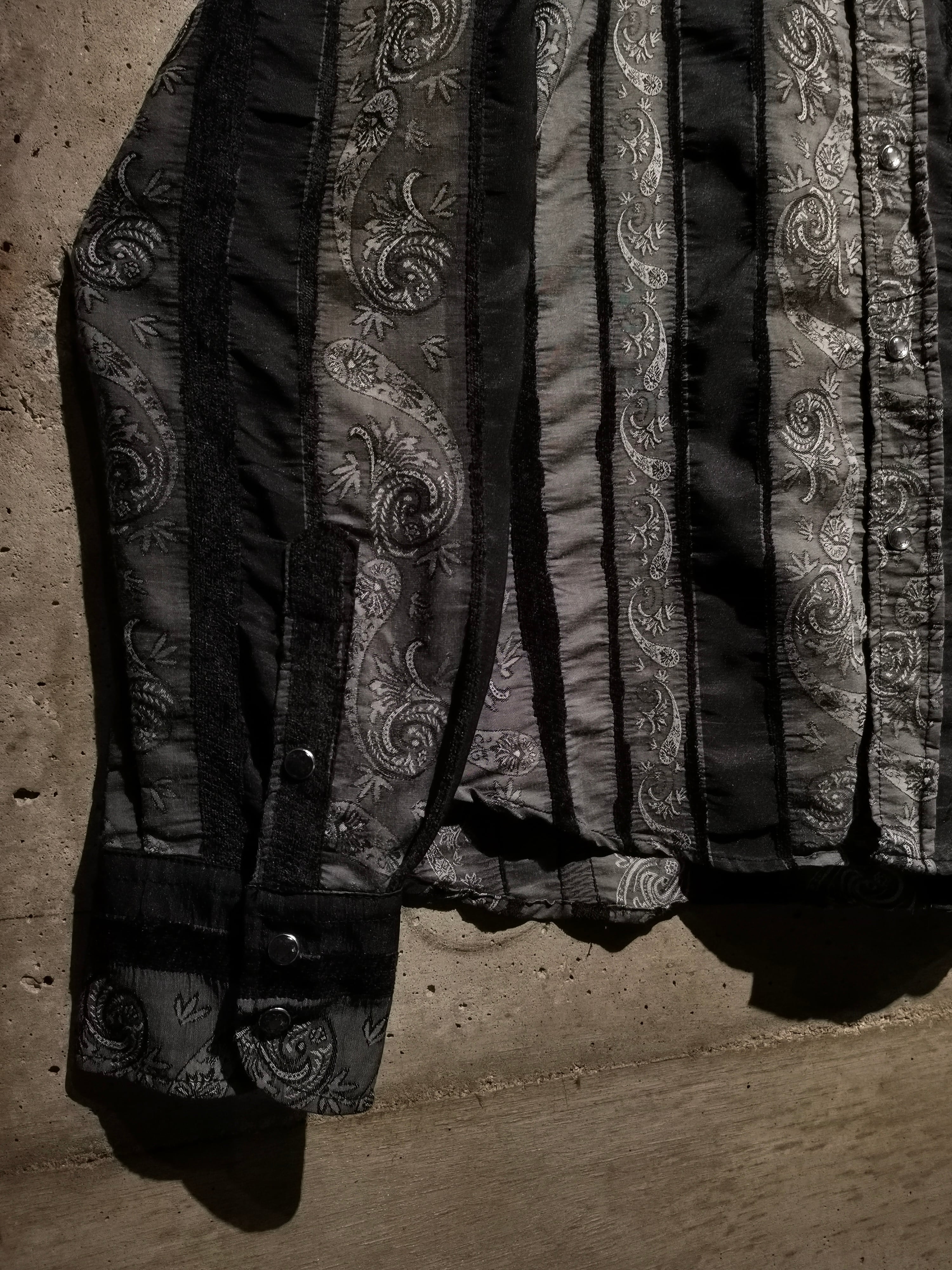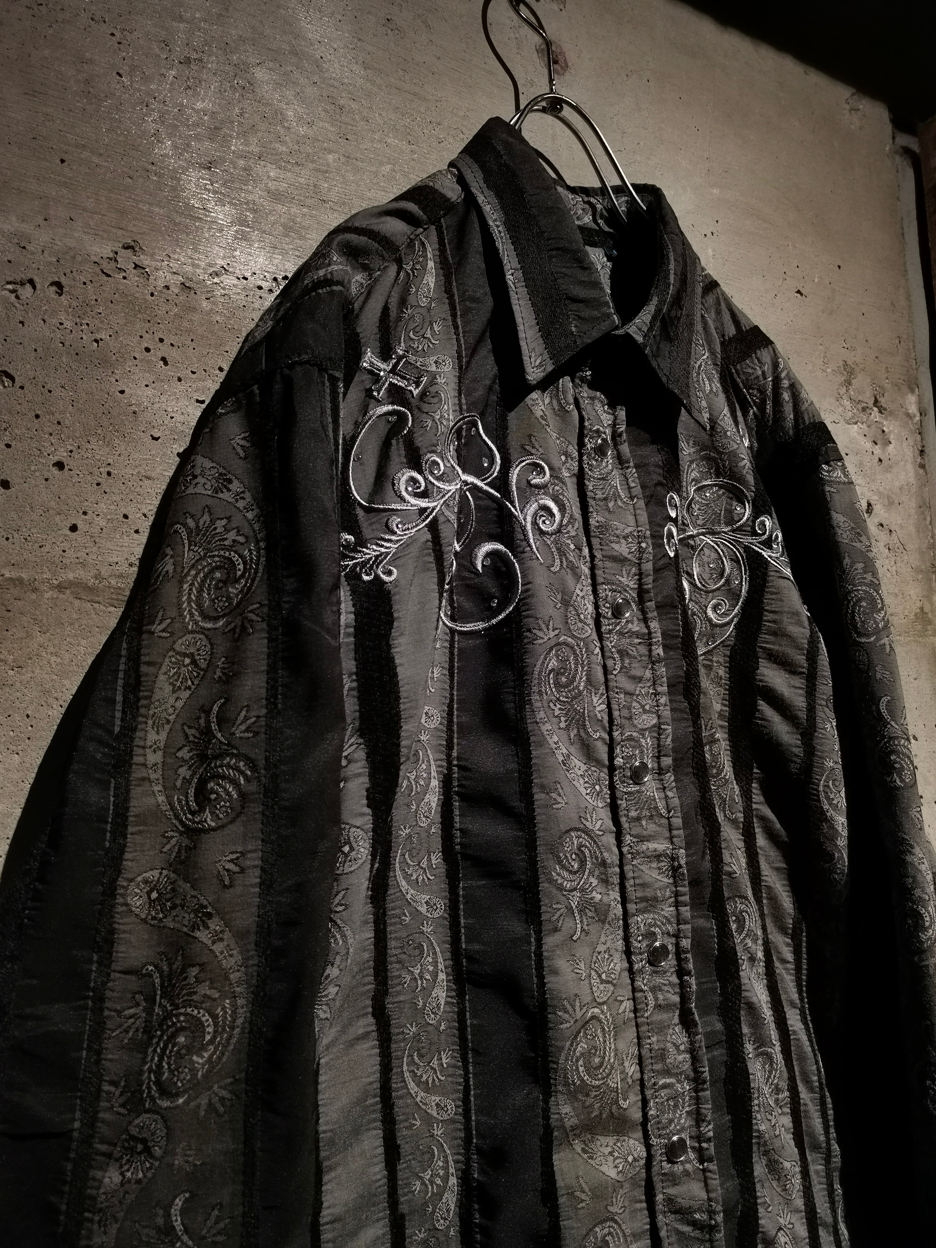 光沢を帯びたブラック×ジャガード織りによってペイズリー柄が映し出されたグレーのテキスタイルをストライプ状に切り替え。その上からフロント両胸、背面にゴシックなモチーフの刺繍を刻んだ長袖シャツ。