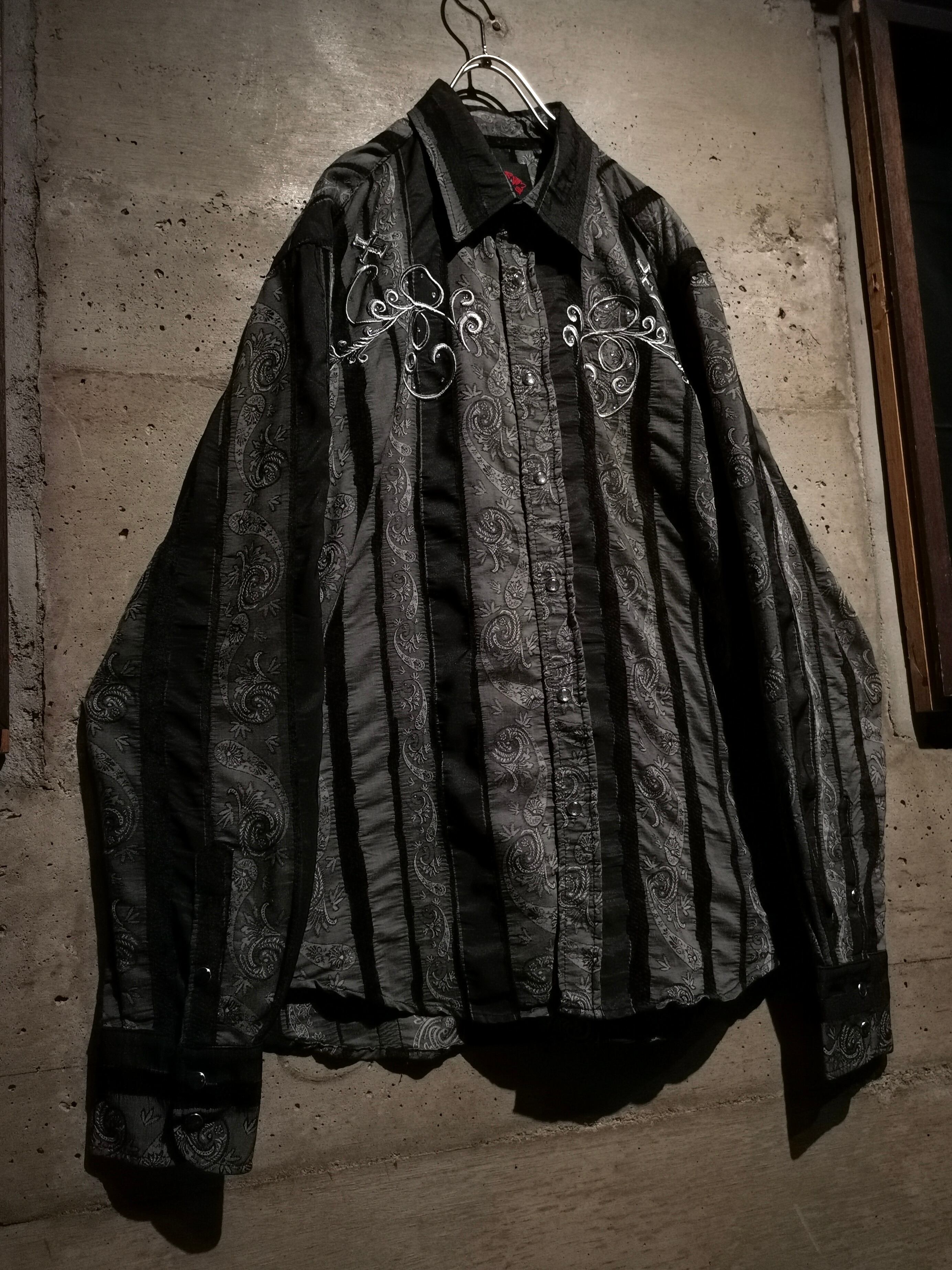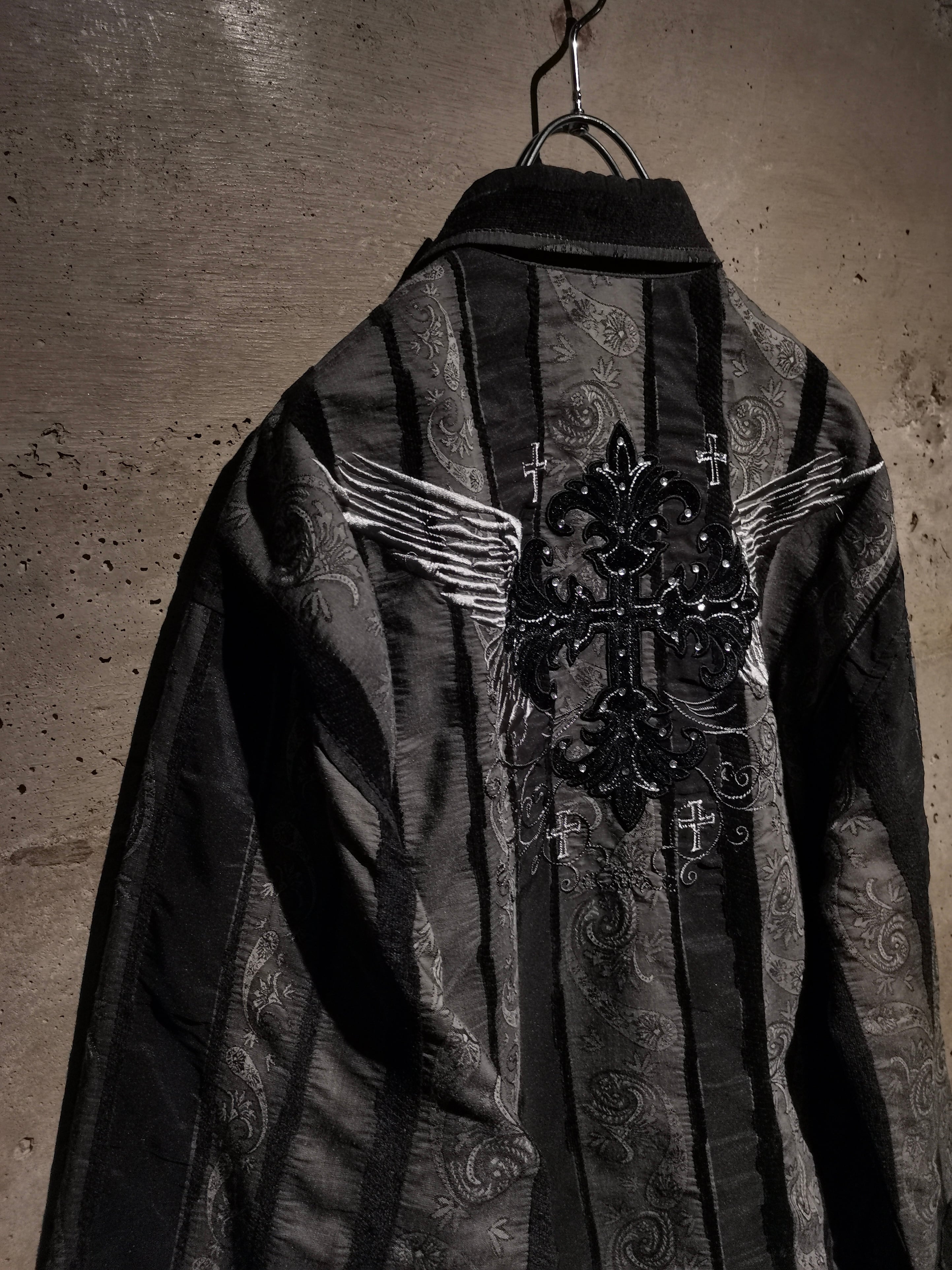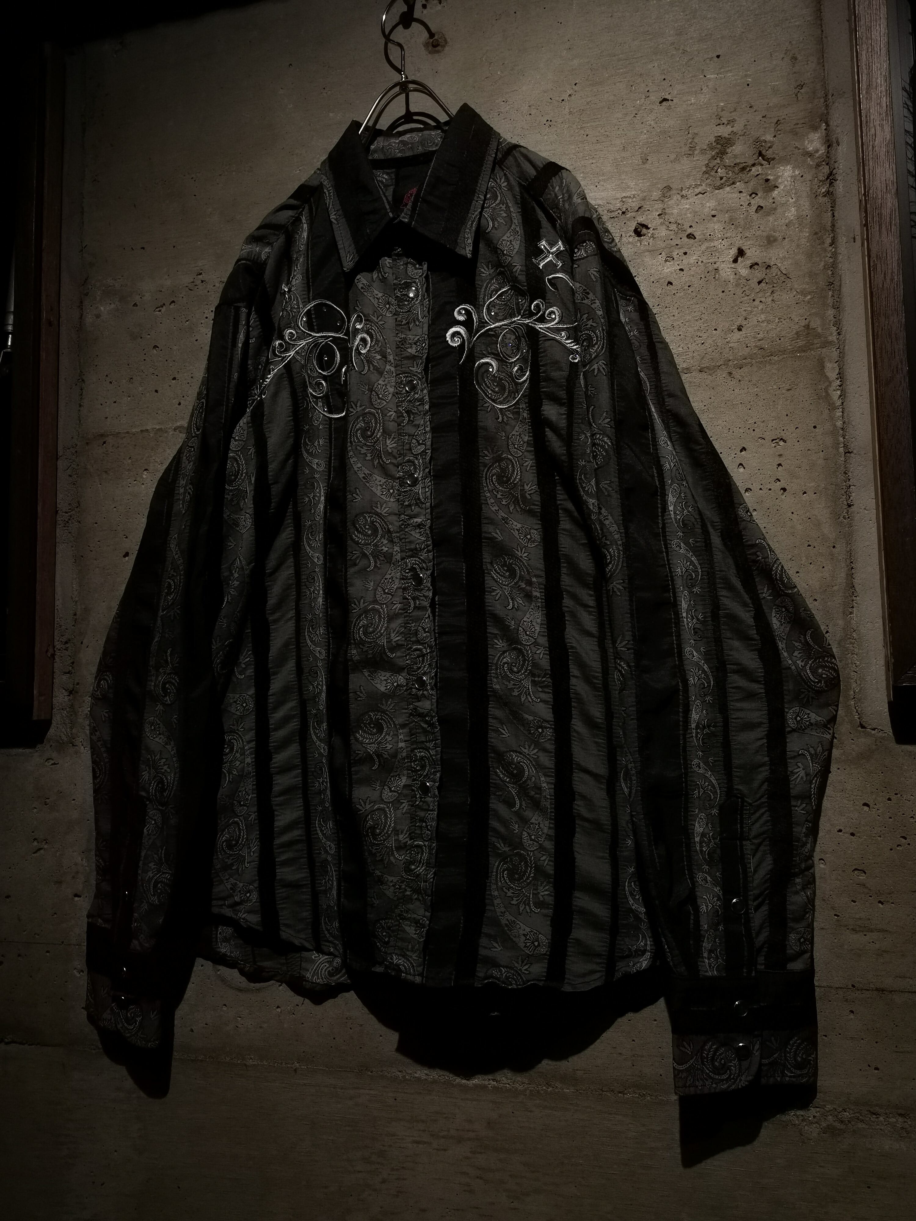 光沢を帯びたブラック×ジャガード織りによってペイズリー柄が映し出されたグレーのテキスタイルをストライプ状に切り替え。その上からフロント両胸、背面にゴシックなモチーフの刺繍を刻んだ長袖シャツ。