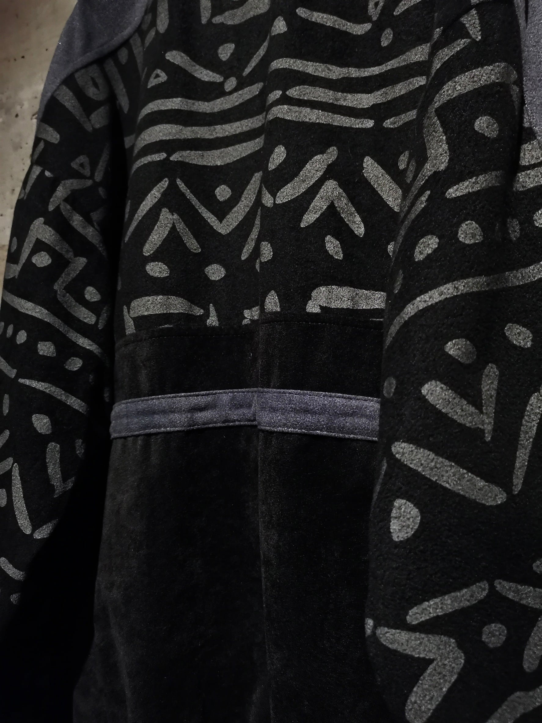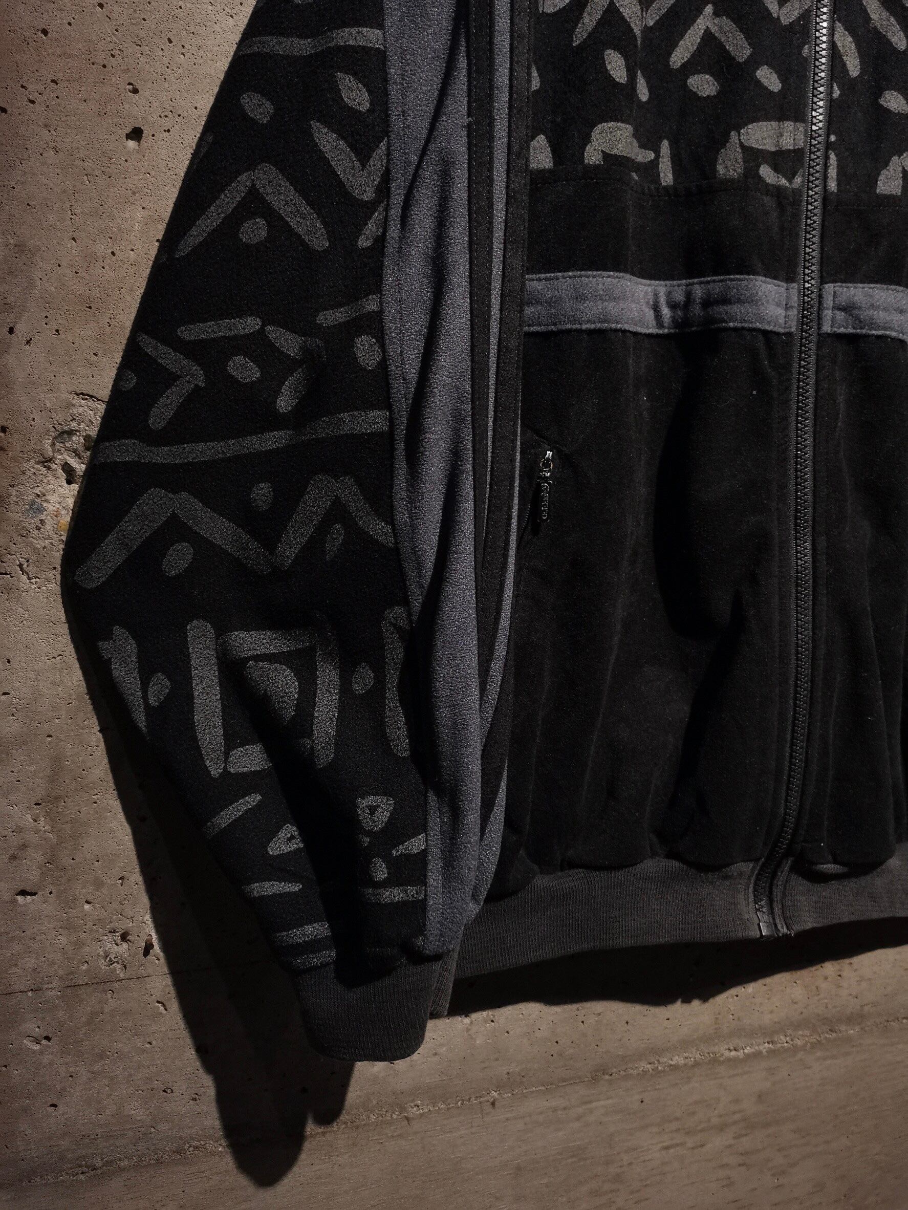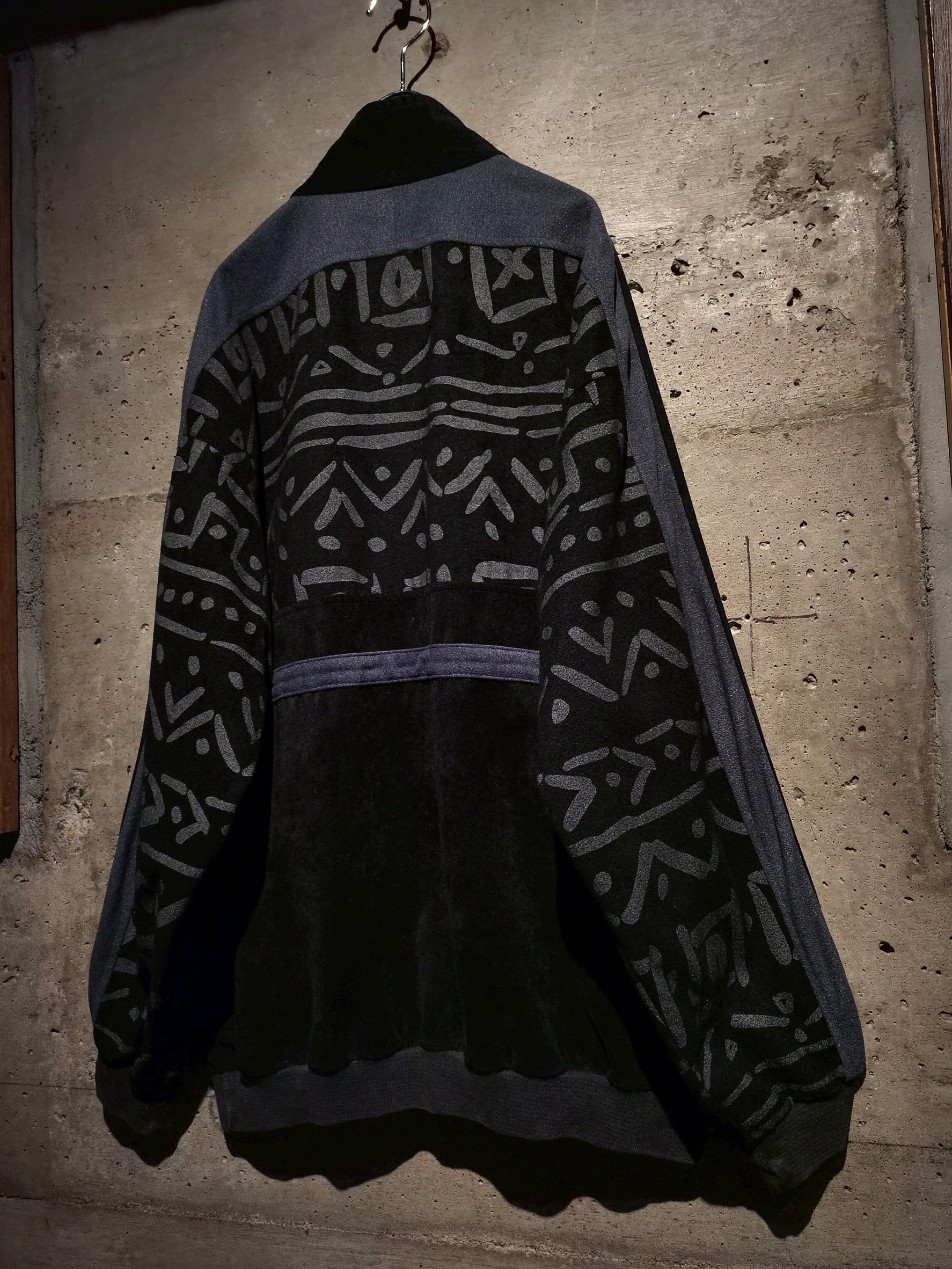柔らかい手触りが特徴的なベロア調の生地を用いたボディに、エスニック調のデザインを落とし込んだ80'sユーロヴィンテージのスペシャルな1着。
