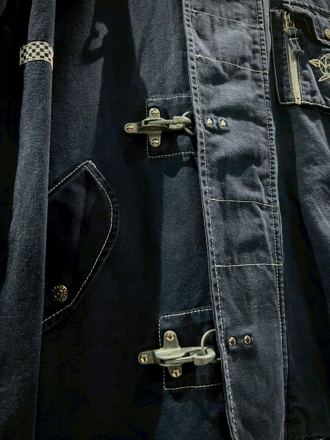 上品なネイビーカラーで仕上げた、ハリのあるタフな質感のダックボディに使用し、フロントに重厚感のあるシルバーのファイアーマンのギミックを載せた1着。
