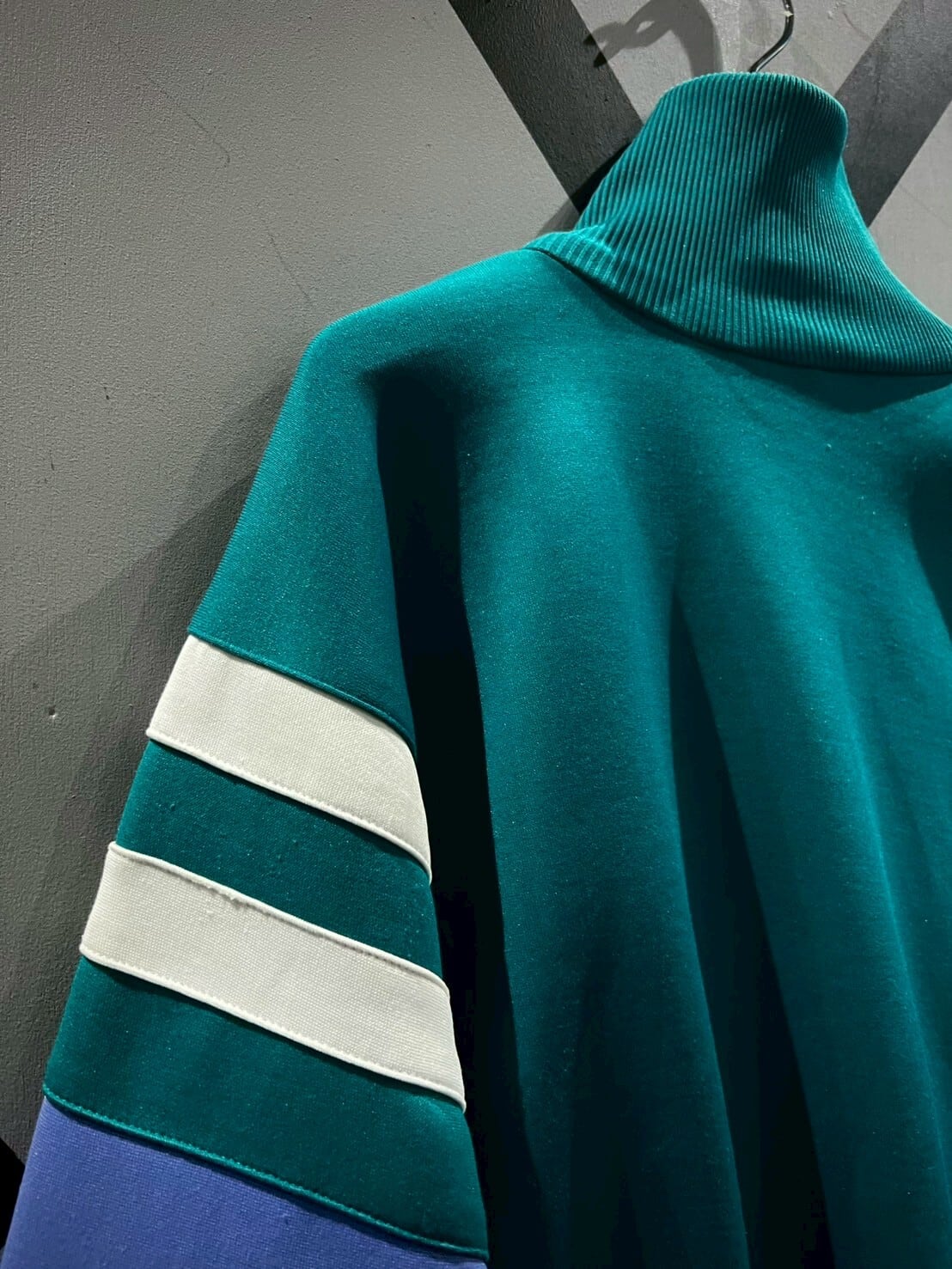 エメラルドグリーンの鮮やかで美しいカラーリングをベースに、白と紫の生地を切り替え、3ストライプスををエッジの効いたデザインで表現した80's adidasのトラックジャケット。