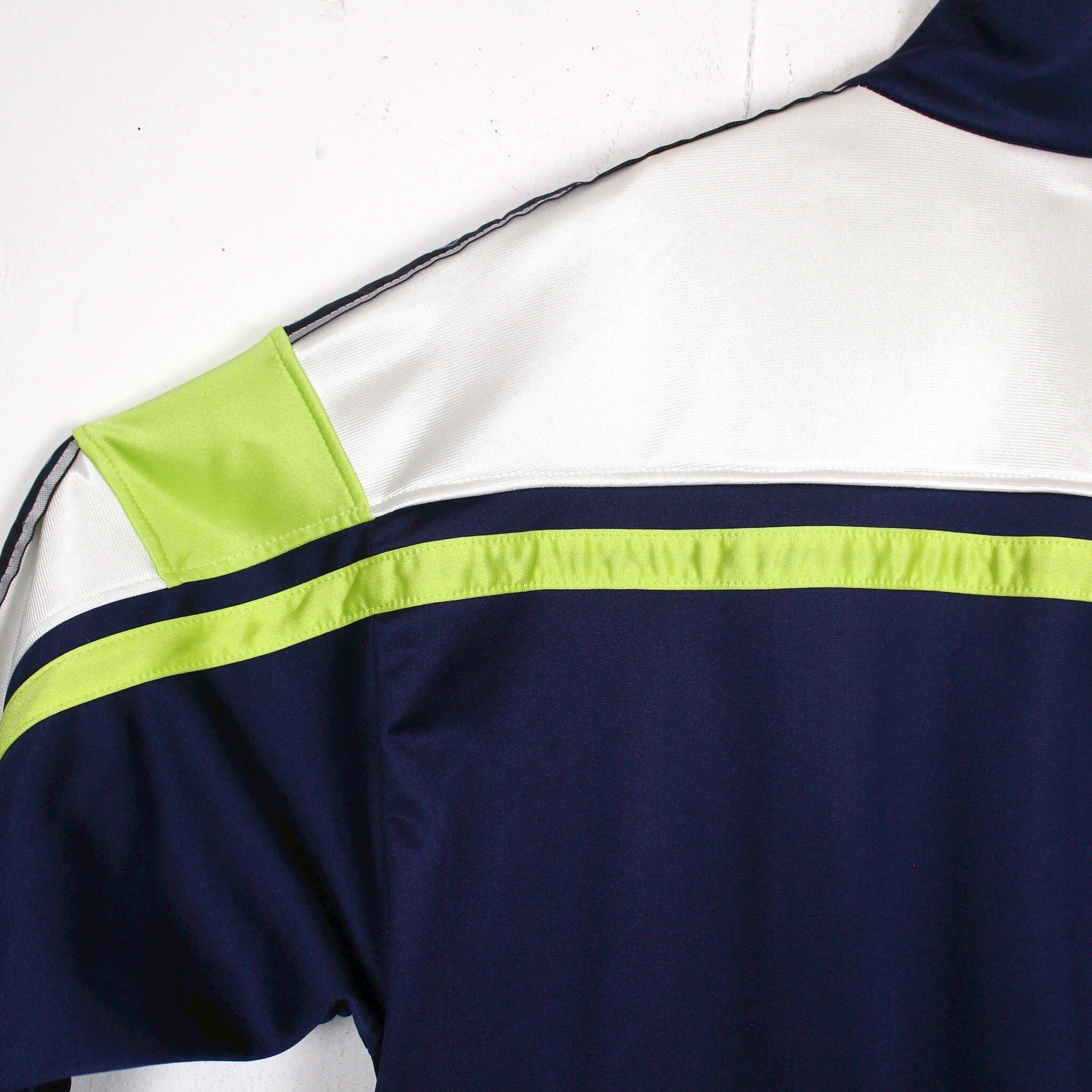 ネイビーのボディをベースに、白、ネオングリーンで切り替えを施した1着。
