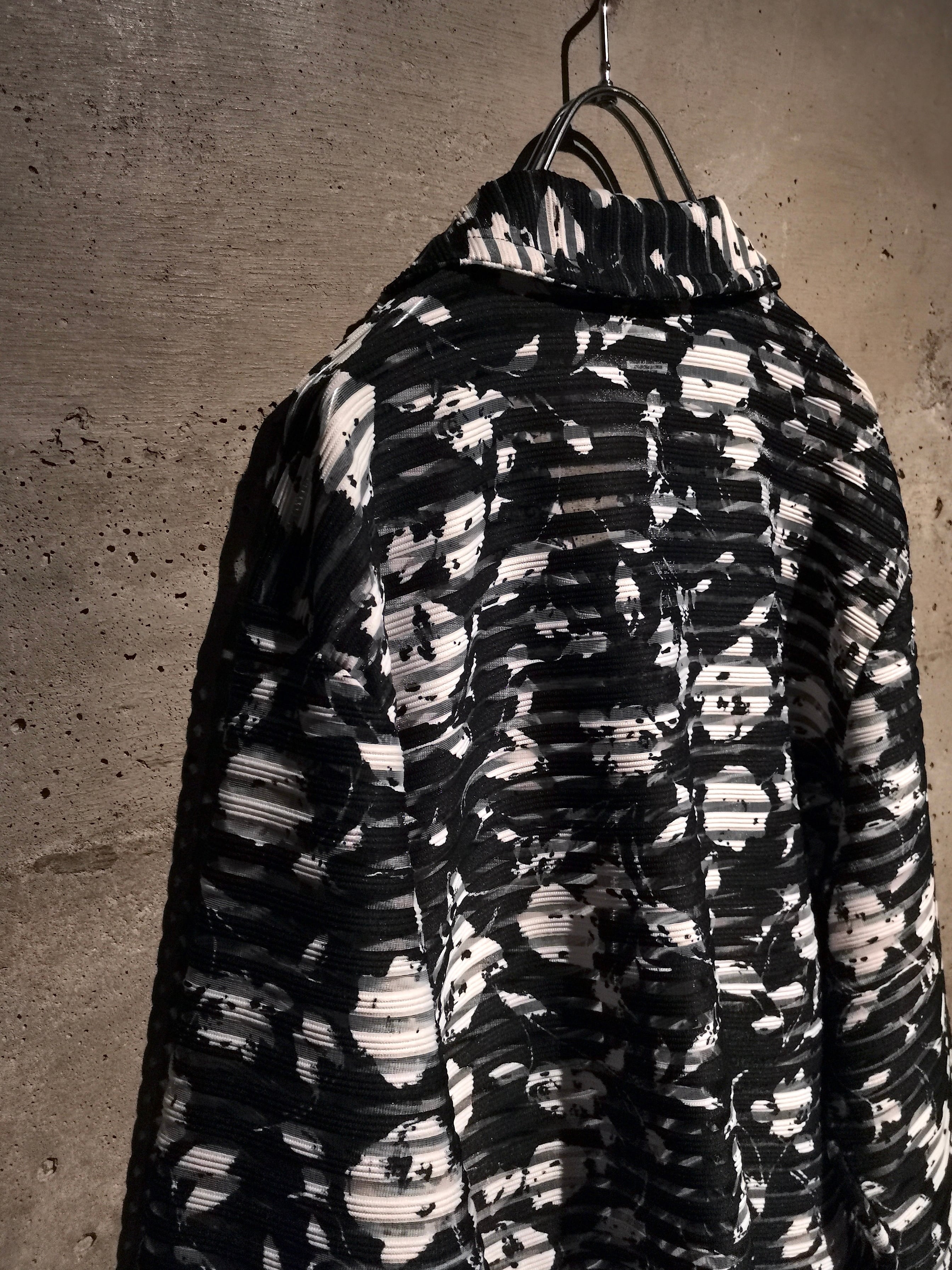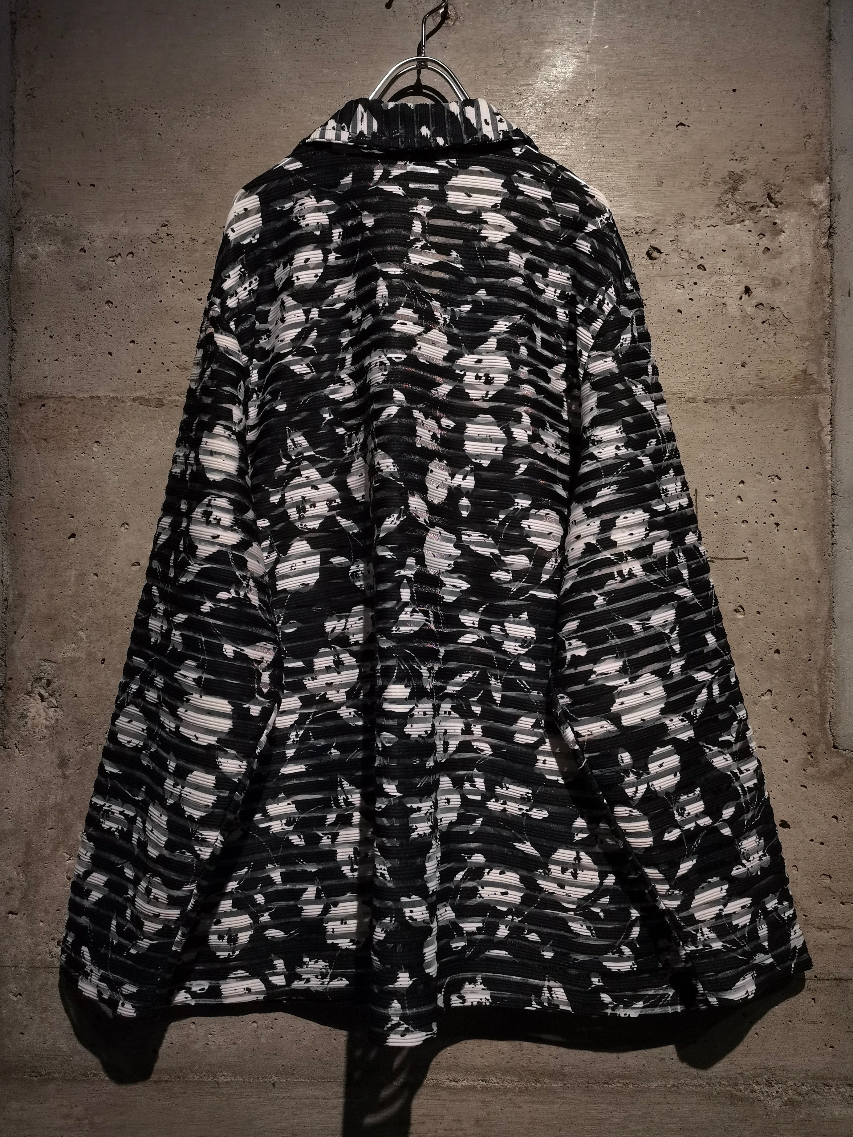 透け感の美しいブラックシアーに、モノトーンのカラーリングで抽象柄を載せた、モードな雰囲気漂うシアーシャツジャケット。